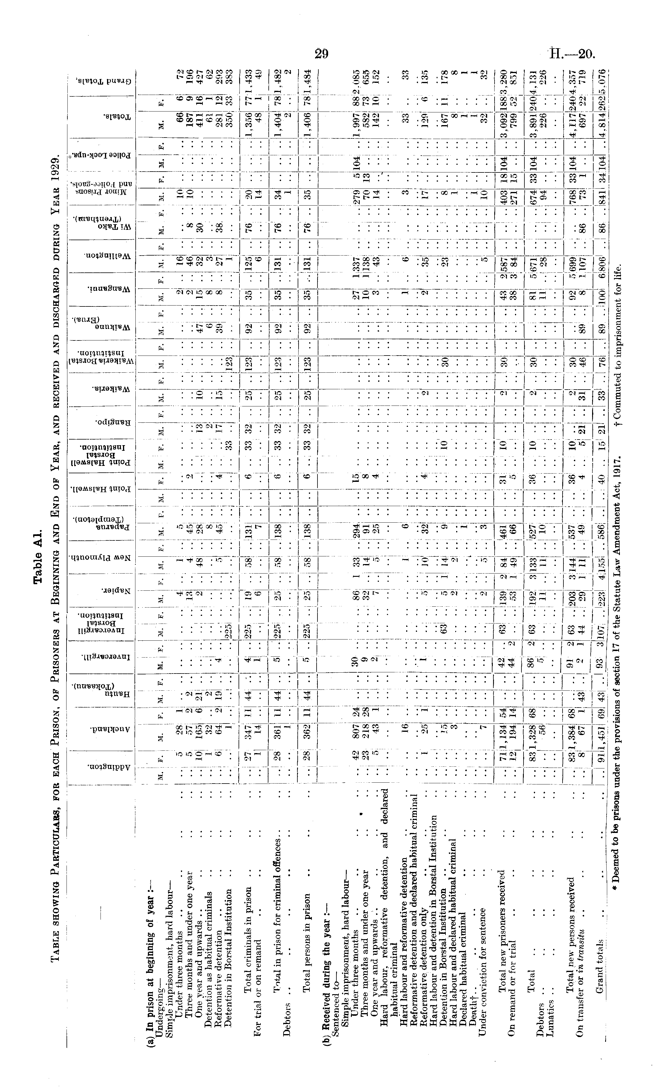 Table A1. Table showing Particulars, for each Prison, of Prisoners at Beginning and End of Year, and received and discharged during Year 1929.