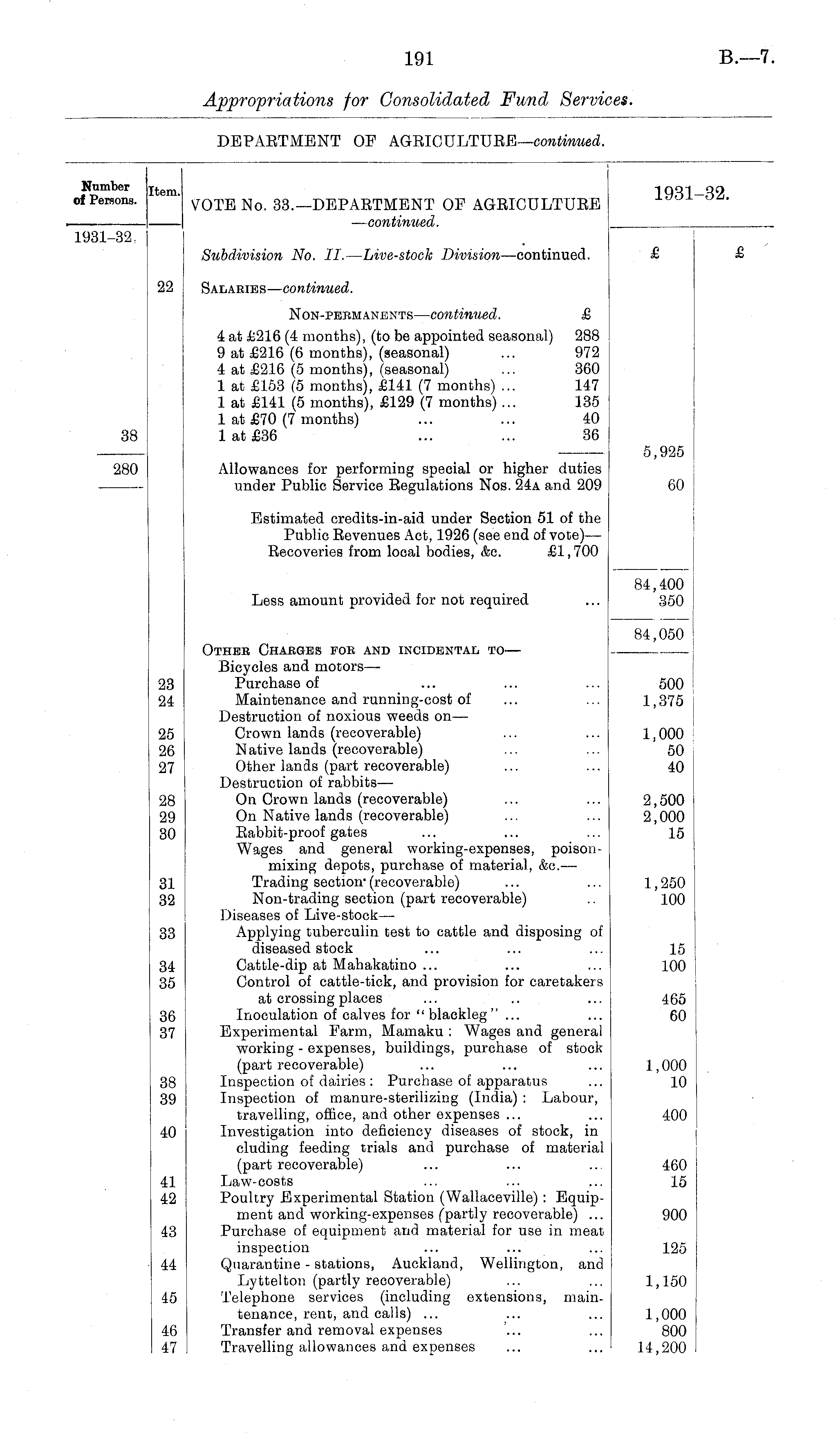 Number Item 1931-82 of Persons. VOTE No. 33. —DEPARTMENT OF AGRICULTURE —continued. . 1931-32 : Subdivision No. II.—Live-stock Division—continued. £ £ 22 Salaries —continued. Non-permanents—continued. £ 4 at £216 (4 months), (to be appointed seasonal) 288 9 at £216 (6 months), (seasonal) ... 972 4 at £216 (5 months), (seasonal) ... 360 1 at £153 (5 months), £141 (7 months) ... 147 1 at £141 (5 months), £129 (7 months)... 135 1 at £70 (7 months) ... ... 40 38 1 at £36 ... ... 36 5,925 280 Allowances for performing special or higher duties under Public Service Regulations Nos. 24a and 209 60 Estimated credits-in-aid under Section 51 of the Public Revenues Act, 1926 (see end of vote) — Recoveries from local bodies, &c. £1,700 84,400 Less amount provided for not required ... 350 84,050 Other Charges for and incidental to — Bicycles and motors —• 23 Purchase of ... ... ... 500 24 Maintenance and running-cost of ... ... 1,375 Destruction of noxious weeds on— 25 Crown lands (recoverable) ... ... 1,000 26 Native lands (recoverable) ... ... 50 27 Other lands (part recoverable) ... ... 40 Destruction of rabbits— 28 On Crown lands (recoverable) ... ... 2,500 29 On Native lands (recoverable) ... ... 2,000 30 Rabbit-proof gates ... ... ... 15 Wages and general working-expenses, poisonmixing depots, purchase of material, &c. — 31 Trading section - (recoverable) ... ... 1,250 32 Non-trading section (part recoverable) 100 Diseases of Live-stock— 33 Applying tuberculin test to cattle and disposing of diseased stock ... ... ... 15 34 Cattle-dip at Mahakatino ... ... ... 100 35 Control of cattle-tick, and provision for caretakers at crossing places ... .. ... 465 36 Inoculation of calves for " blackleg " ... ... 60 37 Experimental Farm, Mamaku : Wages and general working - expenses, buildings, purchase of stock (part recoverable) ... ... ... 1,000 38 Inspection of dairies: Purchase of apparatus ... 10 39 Inspection of manure-sterilizing (India) : Labour, travelling, oflice, and other expenses ... ... 400 40 Investigation into deficiency diseases of stock, in eluding feeding trials and purchase of material (part recoverable) ... ... ... 460 41 Law-costs ... ... ... 15 42 Poultry Experimental Station (Wallaceville) : Equipment and working-expenses (partly recoverable) ... 900 43 Purchase of equipment and material for use in meat inspection ... ... ... 125 44 Quarantine - stations, Auckland, Wellington, and Lyttelton (partly recoverable) ... ... 1,150 45 Telephone services (including extensions, maintenance, rent, and calls) ... ... ... 1,000 46 Transfer and removal expenses ... ... 800 47 Travelling allowances and expenses ... ... 14,200