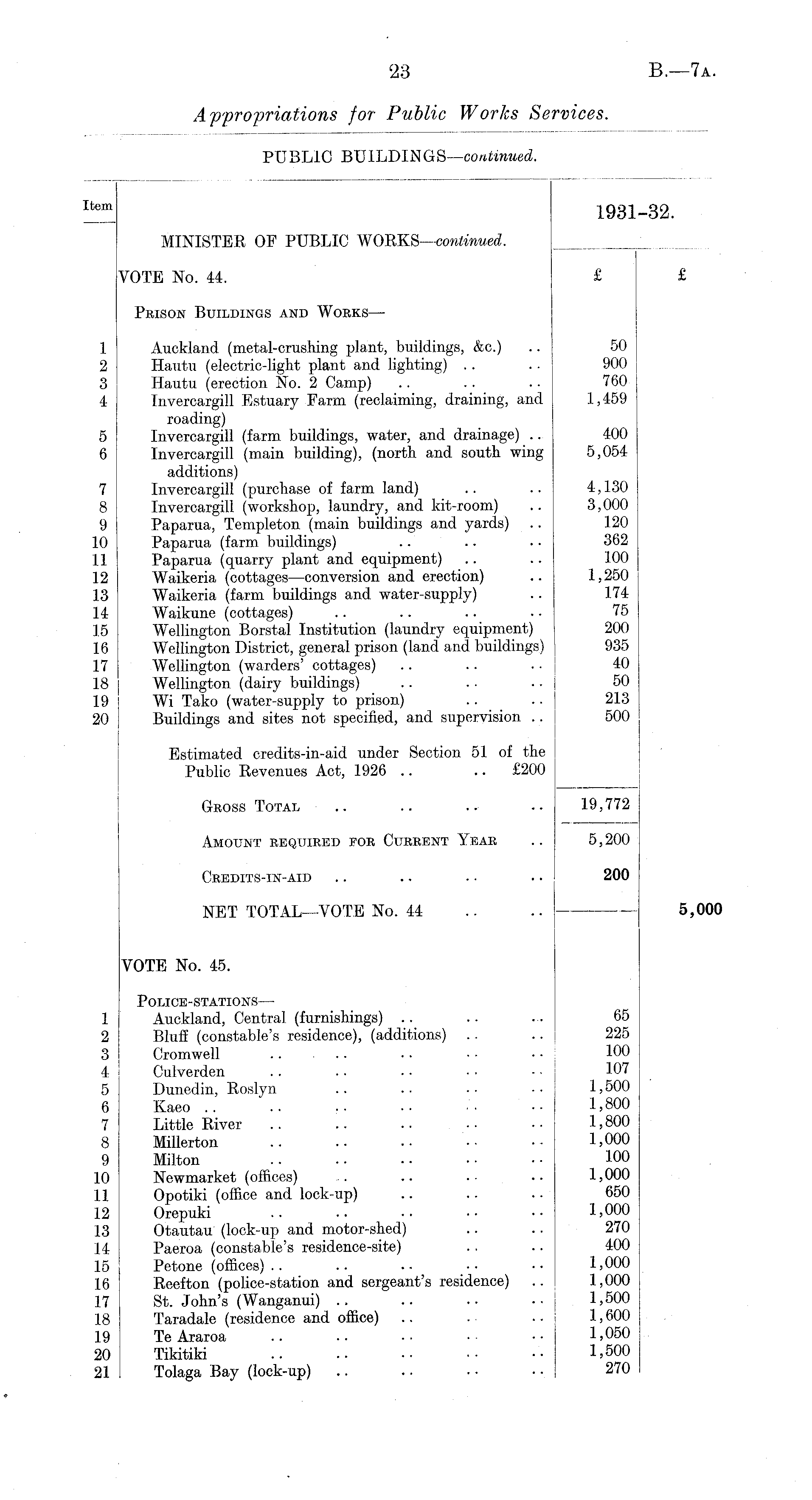 Item 1931-32. MINISTER OP PUBLIC WORKS— continued. VOTE No. 44. £ £ Prison Buildings and Woeks — 1 Auckland (metal-crushing plant, buildings, &c.) .. 50 2 Hautu (electric-light plant and lighting) . . . . 900 3 Hautu (erection No. 2 Camp) .. . . . • 760 4 Invercargill Estuary Farm (reclaiming, draining, and 1,459 roading) 5 Invercargill (farm buildings, water, and drainage) .. 400 6 Invercargill (main building), (north and south wing 5,054 additions) 7 Invercargill (purchase of farm land) .. .. 4,130 8 Invercargill (workshop, laundry, and kit-room) .. 3,000 9 Paparua, Templeton (main buildings and yards) .. 120 10 Paparua (farm buildings) .. .. . • 362 11 Paparua (quarry plant and equipment) .. .. 100 12 Waikeria (cottages —conversion and erection) .. 1,250 13 Waikeria (farm buildings and water-supply) .. 174 14 Waikune (cottages) .. .. .. . • 75 15 Wellington Borstal Institution (laundry equipment) 200 16 Wellington District, general prison (land and buildings) 935 17 Wellington (warders' cottages) .. .. .. 40 18 I Wellington (dairy buildings) .. . • • ■ 50 19 j Wi Tako (water-supply to prison) .. . ■ 213 20 i Buildings and sites not specified, and supervision .. j 500 Estimated credits-in-aid under Section 51 of the Public Revenues Act, 1926 .. .. £200 , ! Gross Total 19,772 Amount required for Current Year .. 5,200 Credits-in-aid .. .. . ■ • • 200 NET TOTAL—VOTE No. 44 .. .. 5,000 VOTE No. 45. Police-stations — 1 Auckland, Central (furnishings) .. .. ... 65 2 Bluff (constable's residence), (additions) .. .. 225 3 j Cromwell .. .. . • ■ ■ • • 100 4 Culverden .. .. • ■ ■ ■ ■ ■ 107 5 Dunedin, Roslyn .. .. .. -■ 1,500 6 Kaeo .. .. .. •• •■ ■■ 1,800 7 Little River .. .. . • • ■ ■■ 1,800 8 J Millerton .. .. •• •■ •• 1,000 9 Milton 100 10 Newmarket (offices) -. .. ■• •• 1,000 11 Opotiki (office and lock-up) .. .. .. 650 12 Orepuki .. •• ■• •• •• 1,000 13 Otautau (lock-up and motor-shed) .. .. 270 14 Paeroa (constable's residence-site) .. .. 400 15 ; Petone (offices) .. .. .- •• ■• 1,000 16 Reefton (police-station and sergeant's residence) .. I 1,000 17 St. John's (Wanganui) .. .. •• • ■ 1,500 18 Taradale (residence and office) .. . • • 1,600 19 TeAraroa .. .. ■■ •■ •• 1,050 20 Tikitiki .. .. •• •• •■ 1,500 21 Tolaga Bay (lock-up) .. .. • • ■ • 270