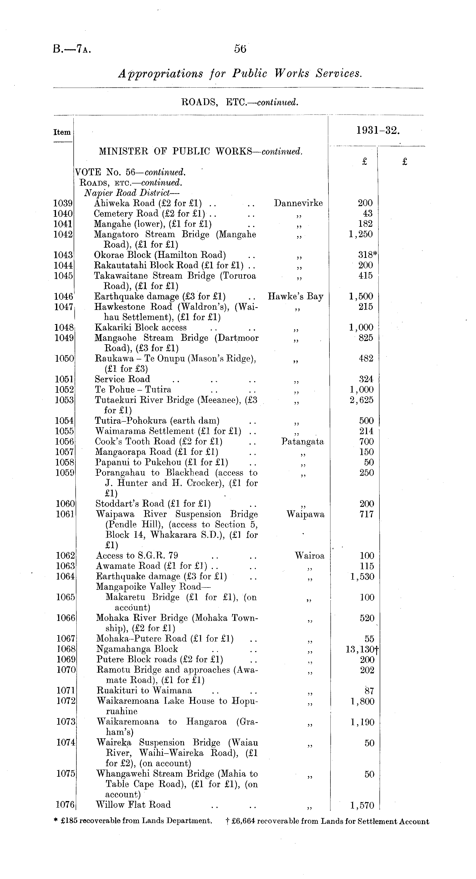 Item 1931-32. MINISTER OP PUBLIC WORKS— continued. ' £ £ VOTE No. 56— continued. Roads, etc. — continued. Napier Road District — 1039 AhiwekaRoad(£2for£l) .. .. Dannevirke 200 1040 Cemetery Road (£2 for £1) .. .. „ 43 1041 Mangahe (lower), (£1 for £1) .. „ 182 1042 Mangatoro Stream Bridge (Mangahe ,, 1,250 Road), (£1 for £1) 1043 Okorae Block (Hamilton Road) .. „ 318* 1044 Rakautatahi Block Road (£1 for £1) . . „ 200 1045 Takawaitane Stream Bridge (Toruroa ,, 415 Road), (£1 for £1) 1046 Earthquake damage (£3 for £1) .. Hawke's Bay 1,500 1047, Hawkestone Road (Waldron's), (Wai- „ 215 I hau Settlement), (£1 for £1) 1048 Kakariki Block access .. .. ,, 1,000 1049 Mangaohe Stream Bridge (Dartmoor ,, 825 Road), (£3 for £1) 1050 Raukawa - Te Onupu (Mason's Ridge), „ 482 (£1 for £3) 1051 Service Road .. .. .. „ 324 1052 Te Pohue - Tutira .. .. „ 1,000 1053 Tutaekuri River Bridge (Meeanee), (£3 ,, 2,625 for £1) 1054 Tutira-Pohokura (earth dam) .. „ 500 1055 Waimarama Settlement (£1 for £1) .. ,, 214 1056 Cook's Tooth Road (£2 for £1) .. Patangata 700 1057 Mangaorapa Road (£1 for £1) .. „ 150 1058 Papanuito Pukehou (£1 for£l) .. „ 50 1059 Porangahau to Blackhead (access to ,, 250 J. Hunter and H. Crocker), (£1 for £1) 1060 Stoddart's Road (£1 for £1) .. „ 200 1061 Waipawa River Suspension Bridge Waipawa 717 (Pcndle Hill), (access to Section 5, Block 14, Whakarara S.D.), (£] for £1) 1062 Access to S.G.R. 79 .. .. Wairoa 100 1063 Awamate Road (£1 for £1) .. .. „ 115 1064 Earthquake damage (£3 for £1) .. „ 1,530 Mangapoike Valley Road — 1065 Makaretu Bridge (£1 for £1), (on „ 100 account) 1066 Mohaka River Bridge (Mohaka Town- „ 520 ship), (£2 for £1) 1067 Mohaka-Putere Road (£1 for £1) .. „ 55 1068 Ngamahanga Block .. .. „ 13,130| 1069 Putere Block roads (£2 for £1) .. „ 200 1070 Ramotu Bridge and approaches (Awa- „ 202 mate Road), (£1 for £1) 1071 Ruakituri to Waimana .. .. ,, 87 1072 Waikaremoana Lake House to Hopu- ,, 1,800 ruahine 1073 Waikaremoana to Hangaroa (Gra- ,, 1,190 ham's) 1074 Waireka Suspension Bridge (Waiau ,, 50 River, Waihi-Waireka Road), (£1 for £2), (on account) 1075 Whangawehi Stream Bridge (Mahia to ,, 50 Table Cape Road), (£1 for £1), (on account) 1076 Willow Flat Road .. .. „ 1,570 ♦ £185 recoverable from Lands Department. f £6,664 recoverable from Lands for Settlement Account