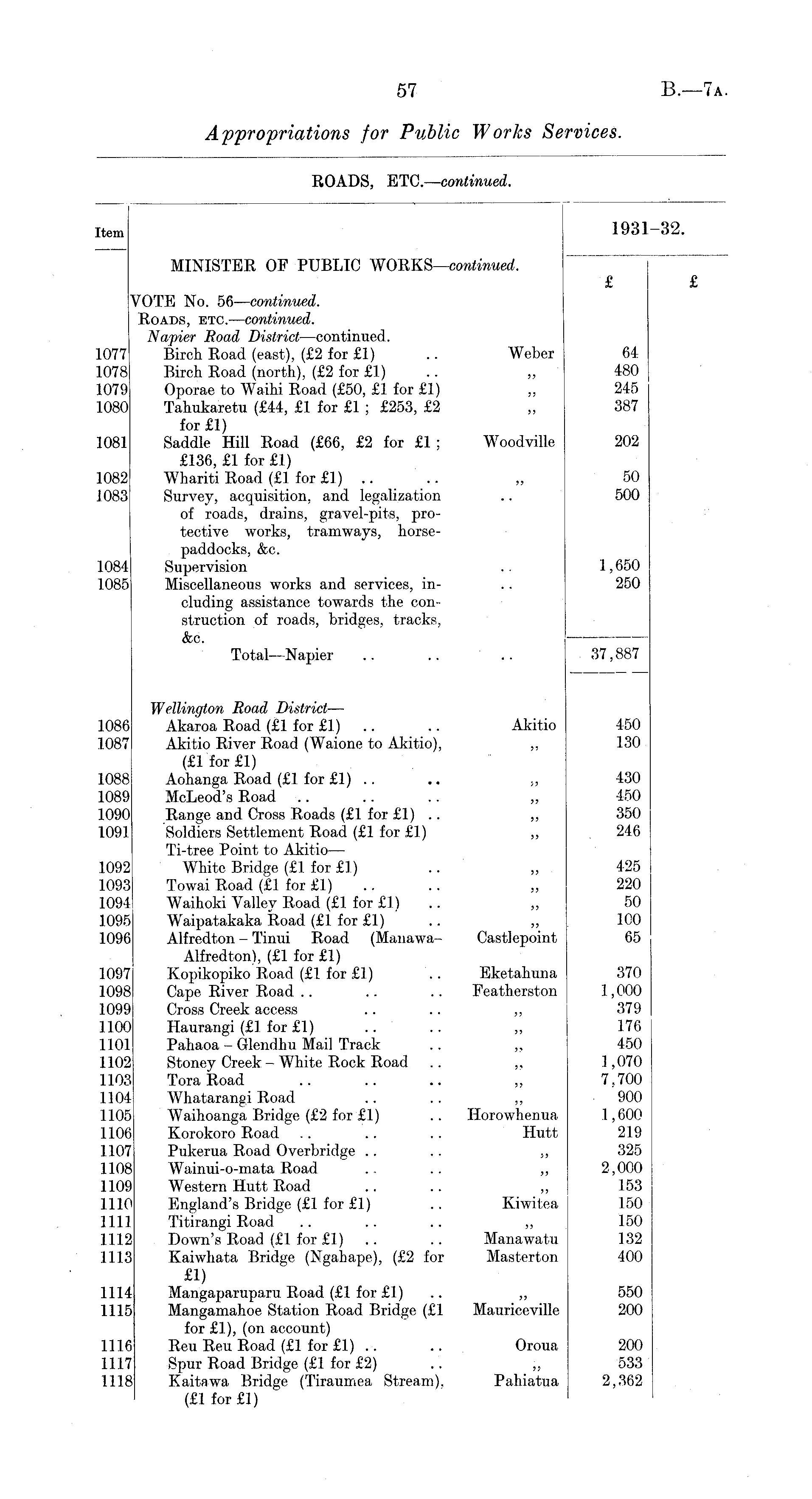 Item 1931-32. MINISTER OF PUBLIC WORKS— continued. £ £ VOTE No. 56— continued. Roads, etc. — continued. Napier Road District —continued. 1077 Birch Road (east), (£2 for £1) .. Weber 64 1078 Birch Road (north), (£2 for £1) .. „ 480 1079 Oporaeto Waihi Road (£50, £lfor£l) „ 245 1080 Tahukaretu (£44, £1 for £1 ; £253, £2 „ 387 for £1) 1081 Saddle Hill Road (£66, £2 for £1 : Woodville 202 £136, £1 for £1) 1082 Whariti Road (£1 for £1) .. .. „ 50 1083 Survey, acquisition, and legalization .. 500 of roads, drains, gravel-pits, protective works, tramways, horsepaddocks, &c. 1084 Supervision .. 1,650 1085 Miscellaneous works and services, in- . . 250 eluding assistance towards the construction of roads, bridges, tracks, &c. Total—Napier .. .. .. 37,887 Wellington Road District — 1086 Akaroa Road (£1 for £1) .. .. Akitio 450 1087 Akitio River Road (Waione to Akitio), ,, 130 (£1 for £1) 1088 Aohanga Road (£1 for £1) .. .. „ 430 1089 McLeod's Road .. .. .. „ 450 1090 Range and Cross Roads (£1 for £1) .. „ 350 1091 Soldiers Settlement Road (£1 for £1) „ 246 Ti-tree Point to Akitio — 1092 White Bridge (£1 for £]) .. „ 425 1093 Towai Road (£1 for £1) .. .. „ 220 1094 Waihoki Valley Road (£1 for £1) .. „ 50 1095 Waipatakaka Road (£1 for £1) .. „ 100 1096 Alfredton - Tinui Road (Mauawa- Castlepoint 65 Alfredton), (£1 for £1) 1097 Kopikopiko'Road (£1 for £1) '.. Eketahuna 370 1098 Cape River Road .. .. .. Featherston 1,000 1099 Cross Creek access .. .. „ 379 1100 Haurangi (£1 for£l) .. .. „ 176 1101 Pahaoa - Glendhu Mail Track .. „ 450 1102 Stoney Creek - White Rock Road .. „ 1,070 1103 ToraRoad .. .. .. „ 7.700 1104 Whatarangi Road .. .. „ 900 1105 Waihoanga Bridge (£2 for £1) .. Horowhenua 1,600 1106 Korokoro Road . . .. .. Hutt 219 1107 Pukerua Road Overbridge .. .. „ 325 1108 Wainui-o-mata Road .. .. „ 2,000 1109 Western Hutt Road .. .. „ 153 1110 England's Bridge (£1 for £1) . . Kiwitea 150 1111 Titirangi Road .. .. .. „ 150 1112 Down's Road (£1 for £]) .. .. Manawatu 132 1113 Kaiwhata Bridge (Ngahape), (£2 for Masterton 400 £1) 1114 Mangaparuparu Road (£1 for £1) .. „ 550 1115 Mangamahoe Station Road Bridge (£1 Mauriceville 200 for £1), (on account) 1116 Reu Reu Road (£1 for £1) .. .. Oroua 200 1117 Spur Road Bridge (£1 for £2) .. „ 533 1118 Kaitawa Bridge (Tiraumea Stream). Pahiatua 2,362 (£1 for£l)