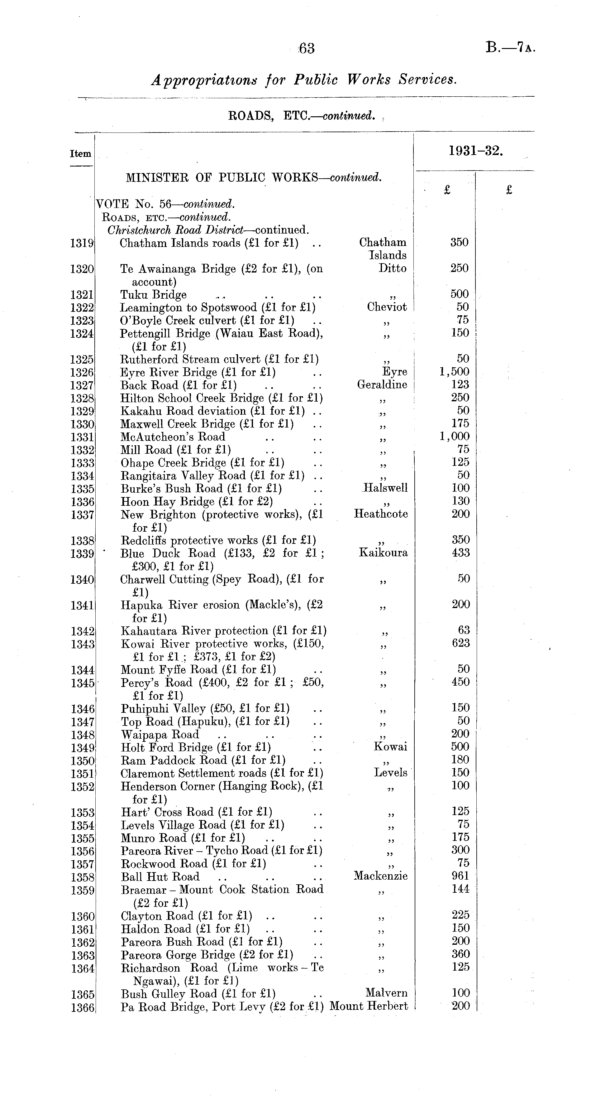 Item 1931-32. MINISTEE OF PUBLIC WORKS—continued. ~~~ ■ £ £ VOTE No. 56— continued. Koads, etc. — continued. Christchurch Road District— continued. 1319 Chatham Islands roads (£1 for £1) .. Chatham 350 Islands 1320 Te Awainanga Bridge (£2 for £1), (on Ditto | 250 account) 1321 Tuku Bridge .. .. .. „ 500 1322 Leamington to Spotswood (£1 for £1) Cheviot 50 1323 O'Boyle Creek culvert (£1 for £1) .. „ 75 1324 Pettengill Bridge (Waiau East Road), „ 150 ! (£1 for £1) 1325 Rutherford Stream culvert (£1 for £1) „ 50 1326 Eyre River Bridge (£1 for £1) .. Eyre 1,500 1327 Back Road (£1 for £1) .. .. Geraldine | 123 1328 Hilton School Creek Bridge (£1 for £1) „ 250 1329 Kakahu Road deviation (£1 for £1) .. „ 50 1330 Maxwell Creek Bridge (£1 for £1) .. „ 175 1331 McAutcheon's Road .. .. „ 1,000 1332 Mill Road (£1 for £1) .. .. „ 75 1333 Ohape Creek Bridge (£1 for £1) .. „ 125 1334 Rangitaira Valley Road (£1 for £1) .. „ 50 1335 Burke's Bush Road (£1 for £1) .. Halswell 100 1336! Hoon Hay Bridge (£1 for £2) .. „ 130 13371 New Brighton (protective works), (£1 Heathcote 200 for £1) 1338 Redcliffs protective works (£1 for £1) „ 350 1339 Blue Duck Road (£133, £2 for £1 ; Kaikoura 433 £300, £1 for £1) 1340 Charwell Cutting (Spey Road), (£1 for „ 50 £1) 1341 Hapuka River erosion (Mackle's), (£2 „ 200 for £1) 1342 Kahautara River protection (£1 for £1) „ 63 1343 Kowai River protective works, (£150, „ 623 £1 for £1 : £373, £1 for £2) 1344 Mount Fyffe Road (£1 for £1) .. „ 50 1345 Percy's Road (£400, £2 for £1 ; £50, „ 450 £1 for £1) 1346 Puhipuhi Valley (£50, £1 for £1) .. „ 150 1347 Top Road (Hapuku), (£1 for £1) .. „ 50 1348 Waipapa Road .. .. .. „ 200 1349 Holt Ford Bridge (£1 for £1) .. Kowai 500 1350 Ram Paddock Road (£1 for £1) .. „ 180 135l| Claremont Settlement roads (£1 for £1) Levels 150 1352 Henderson Corner (Hanging Rock), (£1 „ 100 for £1) 1353 Hart' Cross Road (£1 for £1) .. „ 125 1354 Levels Village Road (£1 for £1) .. „ 75 1355 Munro Road (£1 for £1) .. .. „ 175 1356 Pareora River - Tycho Road (£1 for £1) „ 300 1357 Rockwood Road (£1 for £1) .. „ 75 1358 Ball Hut Road .. .. .. Mackenzie 961 1359 Braemar - Mount Cook Station Road „ 144 (£2 for £1) 1360 Clayton Road (£1 for £1) .. .. „ 225 1361 Haldon Road (£1 for £1) .. .. „ 150 1362 Pareora Bush Road (£1 for £1) .. „ 200 1363 Pareora Gorge Bridge (£2 for £1) . . „ 360 1364 Richardson Road (Lime works - Te „ 125 Ngawai), (£1 for£l) 1365 Bush Gulley Road (£1 for £1) .. Malvern 100 1366 Pa Road Bridge, Port Levy (£2 for £1) Mount Herbert 200