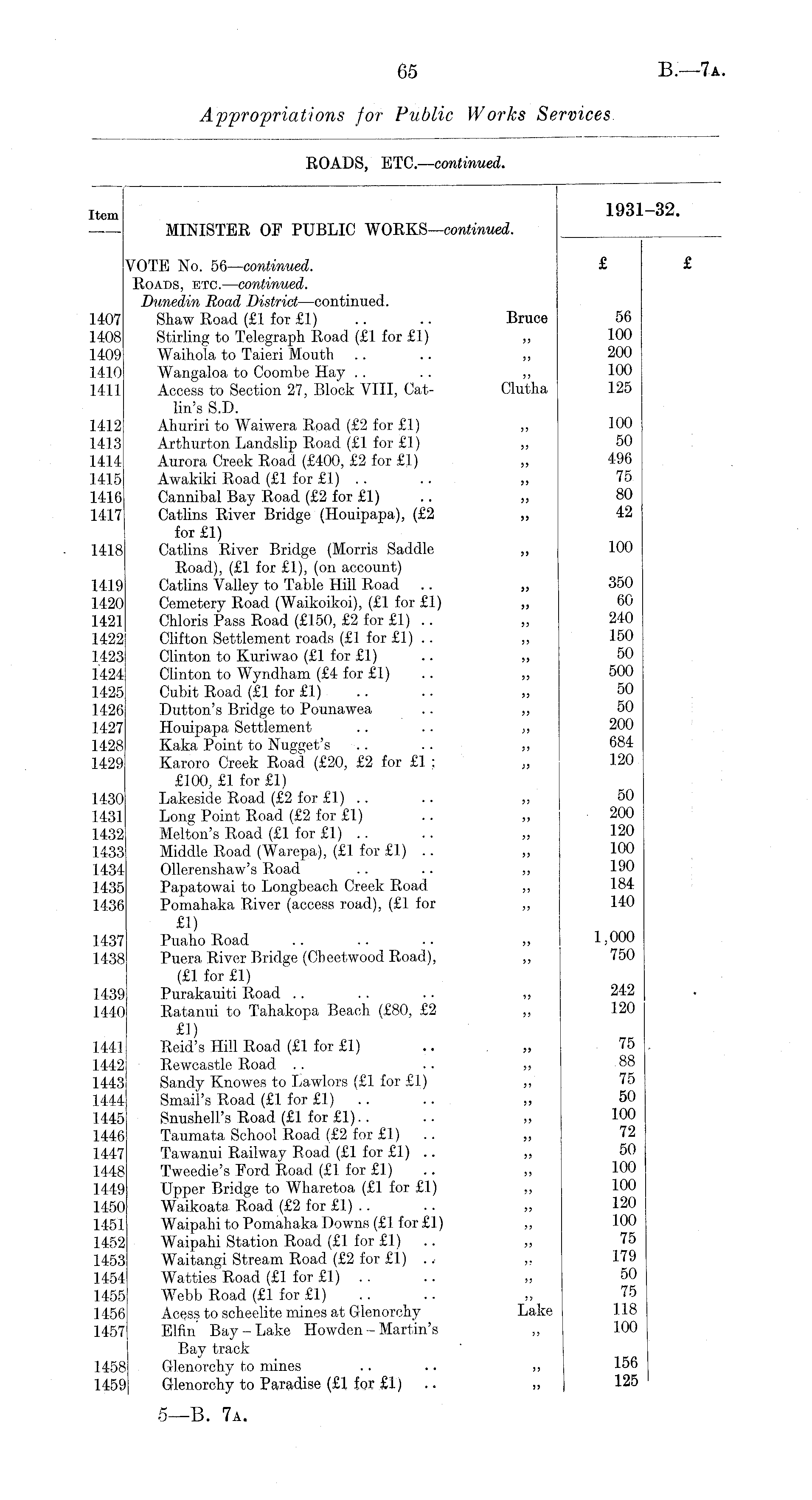 Item 1931-32. MINISTER OF PUBLIC WORKS— continued. VOTE No. 56— continued. £ £ Roads, etc. — continued. Dunedin Road District —continued. 1407 Shaw Road (£1 for £1) .. .. Bruce 56 1408 Stirling to Telegraph Road (£1 for £1) „ 100 1409 Waihola to Taieri Mouth .. .. „ 200 1410 Wangaloa to Coombe Hay . . . . „ 100 1411 Access to Section 27, Block VIII, Cat- Clutha 125 lin's S.D. 1412 Ahuriri to Waiwera Road (£2 for £1) „ 100 1413 Arthurton Landslip Road (£1 for £1) „ 50 1414 Aurora Creek Road (£400, £2 for £1) „ 496 1415 Awakiki Road (£1 for £1) .. .. „ 75 1416 Cannibal Bay Road (£2 for £1) .. „ 80 1417 Catlins River Bridge (Houipapa), (£2 „ 42 for £1) 1418 Catlins River Bridge (Morris Saddle „ 100 Road), (£1 for £1), (on account) 1419 Catlins Valley to Table Hill Road .. „ 350 1420 Cemetery Road (Waikoikoi), (£1 for £1) „ 60 1421 Chloris Pass Road (£150, £2 for £1) .. „ 240 1422 Clifton Settlement roads (£1 for £1) .. „ 150 1423 Clinton to Kuriwao (£1 for £1) .. „ 50 1424 Clinton to Wyndham (£4 for £1) .. „ 500 1425 Cubit Road (£1 for £1) .. „ 50 1426 Dutton's Bridge to Pounawea .. „ 50 1427 Houipapa Settlement .. .. „ 200 1428 Kaka Point to Nugget's .. .. „ 684 1429 Karoro Creek Road (£20, £2 for £1 ; „ 120 £100, £1 for £1) 1430 Lakeside Road (£2 for £1) .. .. „ 50 1431 Lone Point Road (£2 for £1) .. „ 200 1432 Melton's Road (£1 for £1) .. .. „ 120 1433 Middle Road (Warepa), (£1 for £1) .. „ 100 1434 Ollerenshaw's Road .. .. „ 190 1435 Papatowai to Longbeach Creek Road ,, 184 1436 Pomahaka River (access road), (£1 for ,, 140 £1) 1437 PuahoRoad .. .. .. „ 1,000 1438 Puera River Bridge (Cheetwood Road), ,, 750 (£1 for £1) 1439 Purakauiti Road . . . . . . „ 242 1440 Ratanui to Tahakopa Beach (£80, £2 „ 120 £1) 1441 Reid's Hill Road (£1 for £1) .. „ 75 1442 Rewcastle Road . . .. „ 88 1443 Sandy Knowes to Lawlors (£1 for £1) „ 75 1444 Smail's Road (£1 for £1) .. .. „ 50 1445 SnushelFs Road (£1 for £1).. .. „ 100 1446 Taumata School Road (£2 for £1) .. „ 72 1447 Tawanui Railway Road (£1 for £1) .. „ 50 1448 Tweedie's Ford Road (£1 for £1) .. „ 100 1449 Upper Bridge to Wharetoa (£1 for £1) „ 100 1450 Waikoata Road (£2 for £1) .. .. „ 120 1451 Waipahi to Pomahaka Downs (£1 for £1) „ 100 1452 Waipahi Station Road (£1 for £1) .. „ 75 1453 Waitangi Stream Road (£2 for £1) ., „ 179 1454 Watties Road (£1 for £1) .. .. „ 50 1455 Webb Road (£1 for £1) .. .. „ 75 1456 Acess to scheelite mines at Grlenorchy Lake 118 1457 Elfin Bay-Lake Howden - Martin's „ 100 Bay track 1458 Glenorchy to mines .. .. „ 156 1459 Glenorchy to Paradise (£1 for £1) .. „ 125