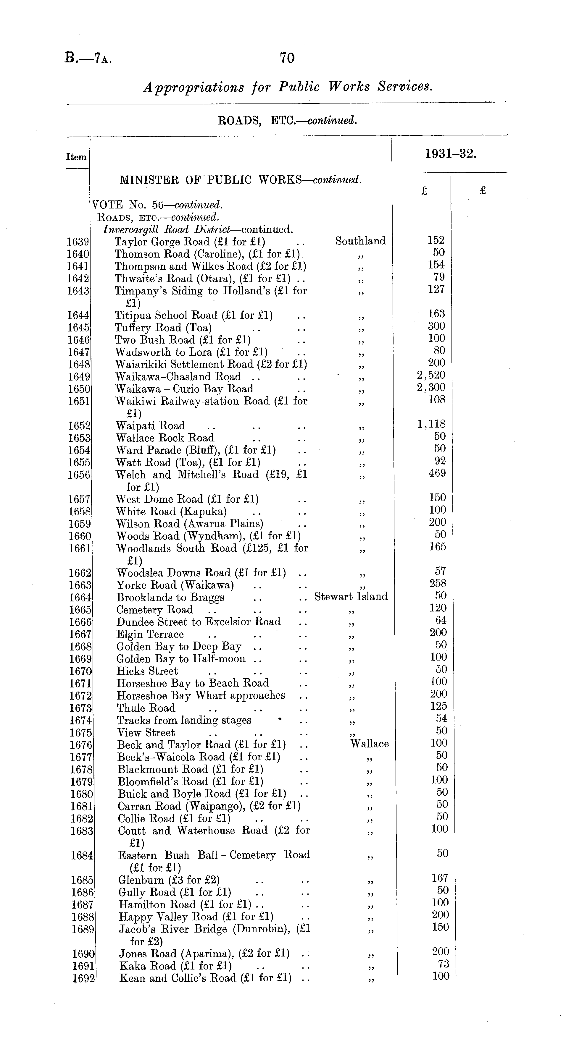 Item 1931-32. MINISTER OF PUBLIC WORKS— continued. £ £ VOTE No. 56— continued. Roads, etc. — continued. Invercargill Road District —continued. 1639 Taylor Gorge Road (£1 for £1) .. Southland 152 1640 Thomson Road (Caroline), (£1 for £1) „ 50 1641 Thompson and Wilkes Road (£2 for £1) „ 154 1642 Thwaite's Road (Otara), (£1 for £1) .. „ 79 1643 Timpany's Siding to Holland's (£1 for „ 127 £1) 1644 Titipua School Road (£1 for £1) .. „ 163 1645 Tuflery Road (Toa) .. .. „ 300 1646 Two Bush Road (£1 for £1) .. „ 100 1647 Wadsworth to Lora (£1 for £1) .. „ 80 1648 Waiarikiki Settlement Road (£2 for £1) „ 200 1649 Waikawa-Chasland Road .. .. ' „ 2,520 1650 Waikawa - Curio Bay Road .. „ 2,300 1651 Waikiwi Railway-station Road (£1 for ,, 108 £1) 1652 WaipatiRoad .. .. .. „ 1,118 1653 Wallace Rock Road .. .. „ 50 1654 Ward Parade (Bluff), (£1 for £1) .. „ 50 1655 Watt Road (Toa), (£1 for £1) .. „ 92 1656 Welch and Mitchell's Road (£19, £1 „ 469 for £1) 1657 West Dome Road (£1 for £1) .. „ 150 1658 White Road (Kapuka) .. .. „ 100 1659 Wilson Road (Awarua Plains) .. „ 200 1660 Woods Road (Wyndham), (£1 for £1) „ 50 1661 Woodlands South Road (£125, £1 for „ 165 £1) 1662 Woodslea Downs Road (£1 for £1) .. „ 57 1663 Yorke Road (Waikawa) .. .. „ 258 1664 Brooklands to Braggs .. .. Stewart Island 50 1665 Cemetery Road .. .. .. „ 120 1666 Dundee Street to Excelsior Road .. „ 64 1667 Elgin Terrace .. .. .. „ 200 1668 Golden Bay to Deep Bay .. .. „ 50 1669 Golden Bay to Half-moon .. .. „ 100 1670 Hicks Street .. .. .. „ 50 1671 Horseshoe Bay to Beach Road .. „ 100 1672 Horseshoe Bay Wharf approaches .. ,, 200 1673 ThuleRoad " .. .. „ 125 1674 Tracks from landing stages • „ 54 1675 View Street .. .. .. „ 50 1676 Beck and Taylor Road (£1 for £1) .. Wallace 100 1677 Beck's-Waicola Road (£1 for £1) .. „ 50 1678 Blackmount Road (£1 for £1) .. „ 50 1679 Bloomfield's Road (£1 for £1) .. „ 100 1680 Buick and Boyle Road (£1 for £1) .. „ 50 1681 Carran Road (Waipango), (£2 for £1) „ 50 1682 Collie Road (£1 for £1) .. „ 50 1683 Coutt and Waterhouse Road (£2 for „ 100 £1) 1684 Eastern Bush Ball - Cemetery Road „ 50 (£1 for £1) 1685 Glenburn (£3 for £2) .. .. „ 167 1686 Gully Road (£1 for £1) .. .. „ 50 1687 Hamilton Road (£1 for £1) .. .. „ 100 1688 Happy Valley Road (£1 for £1) .. „ 200 1689 Jacob's River Bridge (Dunrobin), (£1 „ 150 for £2) 1690 Jones Road (Aparima). (£2 for £1) .. „ 200 1691 Kaka Road (£1 for £1) .. .. „ 73 169 Kean and Collie's Road (£1 for £1) .. „ 100