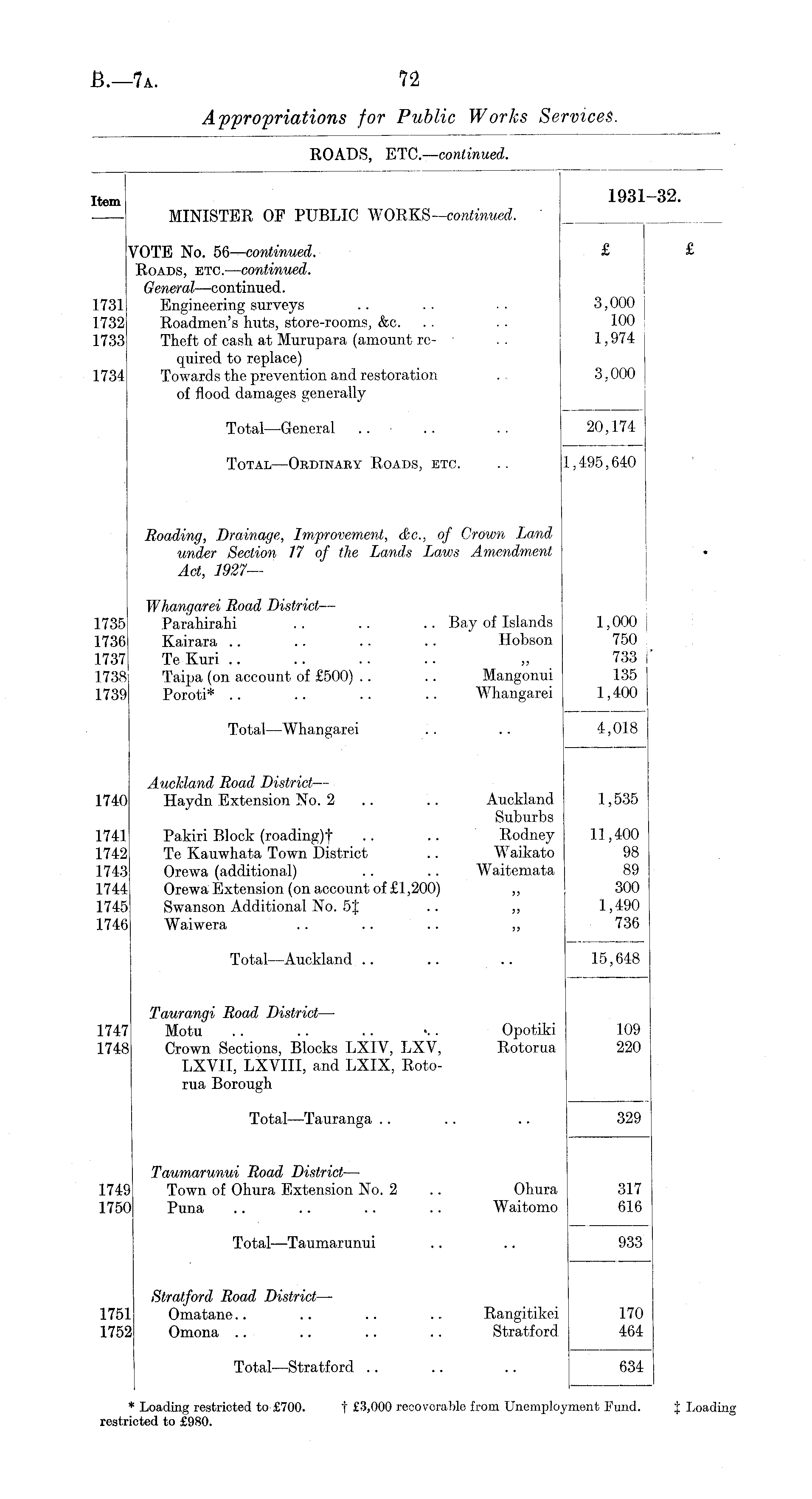 Item 1931-32. ■ MINISTER OF PUBLIC WORKS— continued. VOTE No. 56— continued. £ £ Roads, etc. — continued. General —continued. 1731 Engineering surveys .. .. .. 3,000 1732 Roadmen's huts, store-rooms, &c. .. . . 100 1733 Theft of cash at Murupara (amount re- .. 1,974 quired to replace) 1734 Towards the prevention and restoration .. 3,000 of flood damages generally Total—General .. ■ .. .. 20,174 Total —Ordinary Roads, etc. .. 1,495,640 Reading, Drainage, Improvement, &c, of Crown Land under Section 17 of the Lands Laws Amendment • Act, 1927— Whangarei Road District — 1735 Parahirahi .. .. .. Bay of Islands 1,000 1736 Kairara .. .. .. .. Hobson 750 1737 TeKuri .. .. .. .. „ 733 i' 1738 Taipa (on account of £500) .. .. Mangonui 135 1739 Poroti* .. .. .. .. Whangarei 1,400 Total—Whangarei .. .. 4,018 Auckland Road District — 1740 Haydn Extension No. 2 .. .. Auckland 1,535 Suburbs 1741 Pakiri Block (roading)t .. .. Rodney 13,400 1742 Te Kauwhata Town District .. Waikato 98 1743 Orewa (additional) .. . . Waitemata 89 1744 Orewa Extension (on account of £1,200) „ 300 1745 Swanson Additional No. 5 J .. „ 1,490 1746 Waiwera .. .. .. „ 736 Total—Auckland .. .. .. 15,648 Taurangi Road District — 1747 Motu ... Opotiki 109 1748 Crown Sections, Blocks LXIV, LXV, Rotorua 220 LXVII, LXVIII, and LXIX, Rotorua Borough Total—Tauranga .. .. .. 329 Taumarunui Road District — 1749 Town of Ohura Extension No. 2 .. Ohura 317 1750 Puna .. .. .. .. Waitomo 616 Total—Taumarunui .. .. 933 Stratford Road District — 1751 Omatane.. .. .. .. Rangitikei 170 1752 Omona .. .. .. .. Stratford 464 Total—Stratford .. .. .. 634 * Loading restricted to £700. t £3,000 recoverable from Unemployment Fund. J Loading restricted to £980.