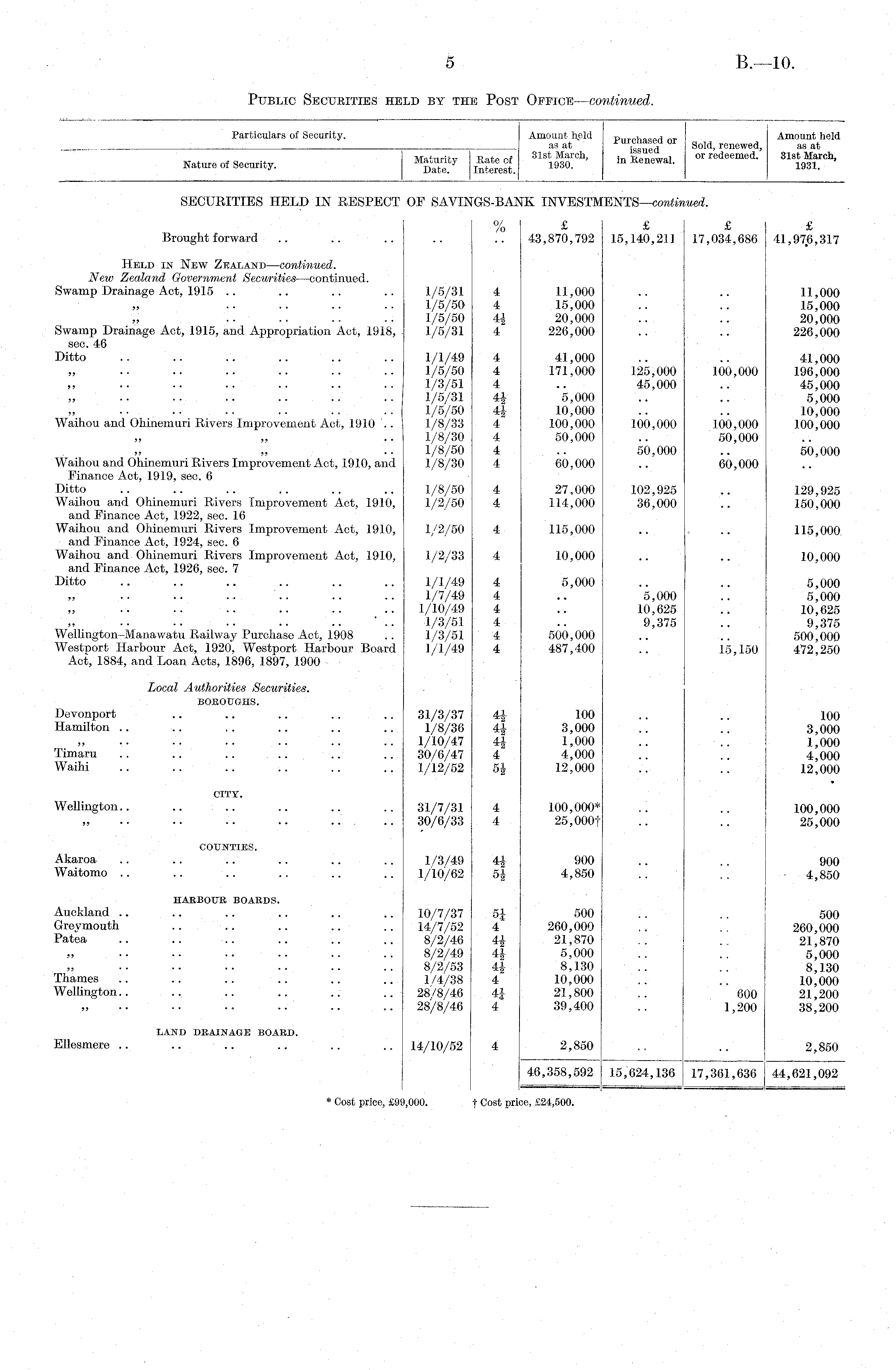 Particulars of Security. Amount h.eld „ Amount held as at iqq,,Pd Sold, renewed, as at Ma*nritv Datpof 31st March, in Tipnewal or redeemed. 31st March, Nature of Security. Date. Interest. 1030 ' Renewal. lg31 _ SECURITIES HELD IN RESPECT OF SAVINGS-BANK INVESTMENTS —continued. % £ £ £ £ Brought forward .. .. .. .. .. 43,870,792 15,140,21] 17,034,686 41,976,317 Held in New Zealand—continued. New Zealand Government Securities —continued. Swamp Drainage Act, 1915 .. .. .. .. 1/5/31 4 11,000 .. .. 11,000 1/5/50 4 15,000 .. .. 15,000 1/5/50 4| 20,000 .. .. 20,000 Swamp Drainage Act, 1915, and Appropriation Act, 1918, 1/5/31 4 226,000 .. .. 226,000 sec. 46 Ditto .. .. .. .. .. .. 1/1/49 4 41,000 .. .. 41,000 1/5/50 4 171,000 125,000 100,000 196,000 1/3/51 4 .. 45,000 .. 45,000 1/5/31 4J 5,000 .. .. 5,000 1/5/50 4| 10,000 .. .. 10,000 Waihou and Ohinemuri Rivers Improvement Act, 1910 .. 1/8/33 4 100,000 100,000 100,000 100,000 1/8/30 4 50,000 .. 50,000 1/8/50 4 .. 50,000 .. 50,000 Waihou and Ohinemuri Rivers Improvement Act, 1910, and 1/8/30 4 60,000 .. 60,000 Finance Act, 1919, sec. 6 Ditto .. .. .. .. .. .. 1/8/50 4 27,000 102,925 .. 129,925 Waihou and Ohinemuri Rivers Improvement Act, 1910, 1/2/50 4 114,000 36,000 .. 150,000 and Finance Act, 1922, sec. 16 Waihou and Ohinemuri Rivers Improvement Act, 1910, 1/2/50 4 115,000 .. .. 115,000 and Finance Act, 1924, sec. 6 Waihou and Ohinemuri Rivers Improvement Act, 1910, 1/2/33 4 10,000 .. .. 10,000 and Finance Act, 1926, sec. 7 Ditto .. .. .. .. .. .. 1/1/49 4 5,000 .. .. 5,000 1/7/49 4 .. 5,000 .. 5,000 1/10/49 4 .. 10,625 .. 10,625 1/3/51 4 .. 9,375 .. 9,375 Wellington-Manawatu Railway Purchase Act, 1908 .. 1/3/51 4 500,000 .. .. 500,000 Westport Harbour Act, 1920, Westport Harbour Board 1/1/49 4 487,400 .. 15,150 472,250 Act, 1884, and Loan Acts, 1896, 1897, 1900 Local Authorities Securities. BOROUGHS. Devonport .. .. .. .. .. 31/3/37 4J 100 .. .. 100 Hamilton .. .. .. .. .. .. 1/8/36 4J 3,000 .. .. 3,000 1/10/47 4J 1,000 .. .. 1,000 Timaru .. .. .. .. .. .. 30/6/47 4 4,000 .. .. 4,000 Waihi .. .. .. .. .. .. 1/12/52 5J 12,000 .. .. 12,000 CITY. Wellington.. .. .. .. .. .. 31/7/31 4 100,000* .. .. 100,000 30/6/33 4 25,000f .. .. 25,000 COUNTIES. Akaroa .. .. .. .. .. .. 1/3/49 4£ 900 .. .. 900 Waitomo .. .. .. .. .. .. 5| 4,850 .. .. 4,850 HARBOUR BOARDS. Auckland .. .. .. .. .. .. 10/7/37 5J 500 .. .. 500 Grevmouth .. .. .. .. .. 14/7/52 4 260,000 .. .. 260,000 Patea .. .. .. .. .. .. 8/2/46 4J 21,870 .. .. 21,870 8/2/49 4| 5,000 .. .. 5,000 8/2/53 4| 8,130 .. .. 8,130 Thames .. .. .. .. .. .. 1/4/38 4 10,000 .. .. 10,000 Wellington.. .. .. .. .. .. 28/8/46 4J 21,800 .. 600 21,200 28/8/46 4 39,400 .. 1,200 38,200 LAND DRAINAGE BOARD. Ellesmere .. .. .. .. .. .. 14/10/52 4 2,850 .. .. 2,850 46,358,592 15,624,136 17,361,636 44,621,092 * Cost price, £99,000. f Cost price, £24,500.