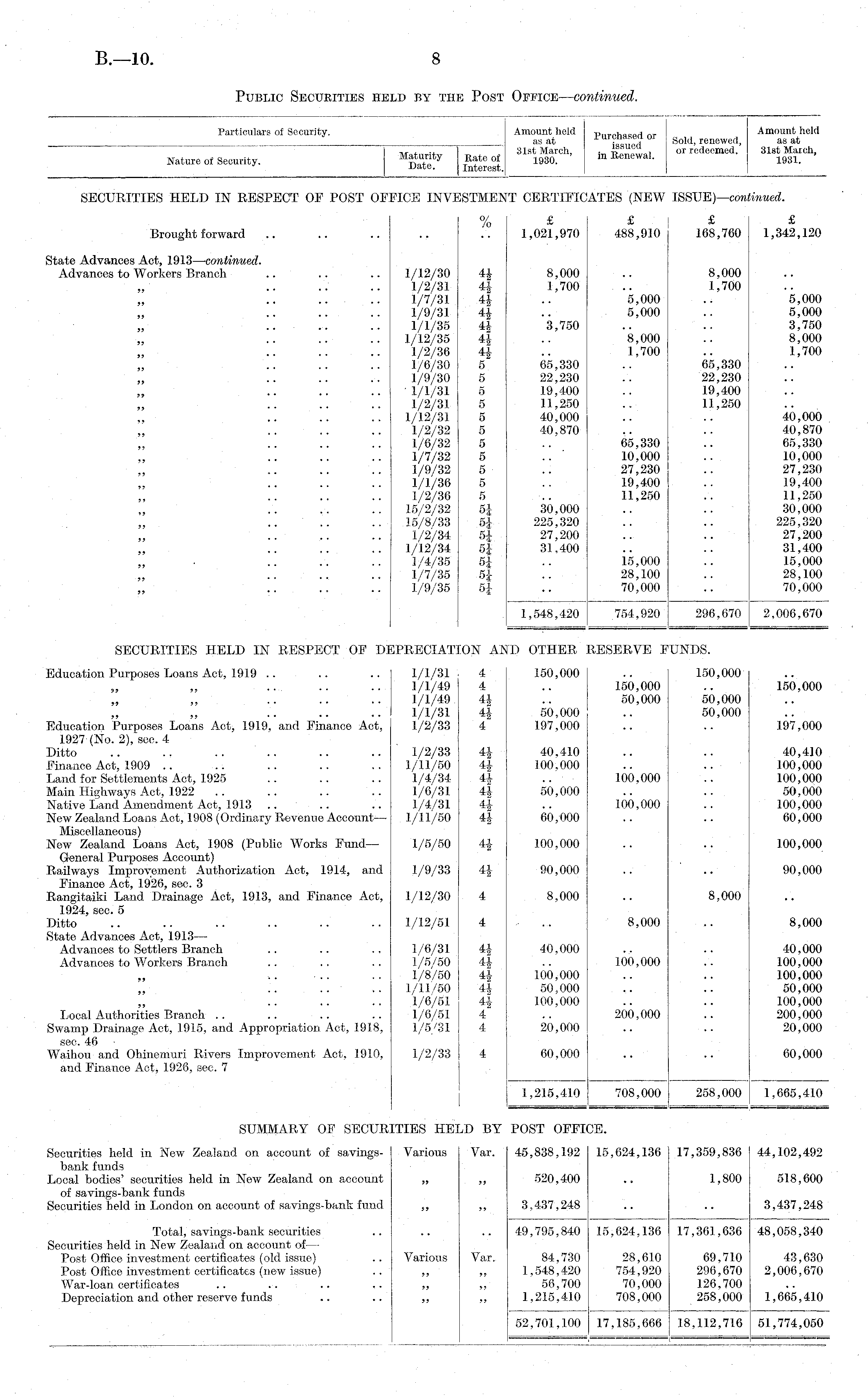 Particulars of Security. Amount held p llr »h„ a oH nr Amount held as at Sold, renewed, as at Mo(l ,_. h , 31st March, . iff"*" . or redeemed. 31st March, Nature of Security. M S q u t " ty «? te °J 1930. m Benewal. 1031jjate. Interest. SECURITIES HELD IN RESPECT OF POST OFFICE INVESTMENT CERTIFICATES (NEW ISSUE) —continued. % £ £ ! £ £ Brought forward .. .. .. .. ° 1,021,970 488,910 168,760 1,342,120 State Advances Act, 1913—continued. Advances to Workers Branch .. .. .. 1/12/30 4|- 8,000 .. 8,000 1/2/31 4£ 1,700 .. 1,700 .. .. 1/7/31 4J .. 3,000 .. 5,000 1/9/31 4J .. 5,000 .. 5,000 1/1/35 U 3,750 .. .. 3,750 1/12/35 4i .. 8,000 .. 8,000 1/2/36 4J .. 1,700 .. 1,700 1/6/30 5 65,330 .. 65,330 1/9/30 5 22,230 .. 22,230 ' 1/1/31 5 19,400 .. 19,400 1/2/31 5 11,250 .. 11,250 1/12/31 5 40,000 .. .. 40,000 1/2/32 5 40,870 .. .. 40,870 ... .. .. 1/6/32 5 .. 65,330 .. 65,330 1/7/32 5 .. 10,000 .. 10,000 1/9/32 5 .. 27,230 .. 27,230 1/1/36 5 .. 19,400 .. 19,400 1/2/36 5 .. 11,250 .. 11,250 15/2/32 5i 30,000 .. .. 30,000 15/8/33 5J 225,320 .. .. 225,320 1/2/34 5| 27,200 .. .. 27,200 1/12/34 5J 31.400 .. .. 31,400 1/4/35 5J .. 15,000 .. 15,000 1/7/35 5J .. 28,100 .. 28,100 1/9/35 5.1 .. 70,000 .. 70,000 1,548,420 754,920 296,670 2,006,670 SECURITIES HELD IN RESPECT OF DEPRECIATION AND OTHER RESERVE FUNDS. Education Purposes Loans Act, 1919 .. .. .. 1/1/31 . 4 150,000 .. 150,000 1/1/49 4 .. 150,000 .. 150,000 1/1/49 U .. 50,000 50,000 1/1/31 4J 50,000 .. 50,000 Education Purposes Loans Act, 1919, and Finance Act, 1/2/33 4 197,000 .. .. 197,000 1927 (No. 2), see. 4 Ditto .. .. .. .. .. .. 1/2/33 4J 40,410 .. .. 40,410 Finance Act, 1909 .. .. .. .. .. 1/11/50 4J 100,000 .. .. 100,000 Land for Settlements Act, 1925 .. .. .. 1/4/34 4.V .. 100,000 .. 100,000 Main Highways Act, 1922 .. .. .. .. 1/6/31 U 50,000 .. .. 50,000 Native Land Amendment Act, 1913 .. .. .. 1/4/31 4J .. 100,000 .. 100,000 New Zealand Loans Act, 1908 (Ordinary Revenue Account— 1/11/50 4f 60,000 .. .. 60,000 Miscellaneous) New Zealand Loans Act, 1908 (Public Works Fund— 1/5/50 4£ 100,000 .. .. 100,000 General Purposes Account) Railways Improvement Authorization Act, 1914, and 1/9/33 4|- 90,000 .. .. 90,000 Finance Act, 1926, sec. 3 Rangitaiki Land Drainage Act, 1913, and Finance Act, 1/12/30 4 8,000 .. 8,000 1Q94. qpp f} Ditto .. .. .. .. .. .. 1/12/51 4 .. 8,000 .. 8,000 State Advances Act, 1913 — Advances to Settlers Branch .. .. .. 1/6/31 4|- 40,000 .. .. 40,000 Advances to Workers Branch .. .. .. 1/5/50 4J .. 100,000 .. 100,000 1/8/50 li 100,000 .. .. 100,000 1/11/50 4J- 50,000 .. .. 50,000 1/6/51 4i 100,000 .. .. 100,000 Local Authorities Branch .. .. .. .. 1/6/51 4 .. 200,000 .. 200,000 Swamp Drainage Act, 1915, and Appropriation Act, 1918, 1/5/31 4 20,000 .. .. 20,000 sec. 46 Waihou and Ohinemuri Rivers Improvement Act, 1910, 1/2/33 4 60,000 .. .. 60,000 and Finance Act, 1926, see. 7 1,215,410 708,000 258,000 1,665,410 SUMMARY OF SECURITIES HELD BY POST OFFICE. Securities held in New Zealand on account of savings- Various Var. 45,838,192 15,624,136 17,359,836 44,102,492 bank funds Local bodies' securities held in New Zealand on account „ „ 520,400 .. 1,800 518,600 of savings-bank funds Securities held in London on account of savings-bank fund ,, ,, 3,437,248 .. .. 3,437,248 Total, savings-bank securities .. .. .. 49,795,840 15,624,136 17,361,636 48,058,340 Securities held in New Zealand on account of— Post Office investment certificates (old issue) .. Various Var. 84,730 28,610 69,710 43,630 Post Office investment, certificates (new issue) .. ,, ,, 1,548,420 754,920 296,670 2,006,670 War-loan certificates .. .. .. .. ,, ,, 56,700 70,000 126,700 Depreciation and other reserve funds .. .. „ ,, 1,215,410 708,000 258,000 1,665,410 52,701,100 17,185,666 18,112,716 51,774,050