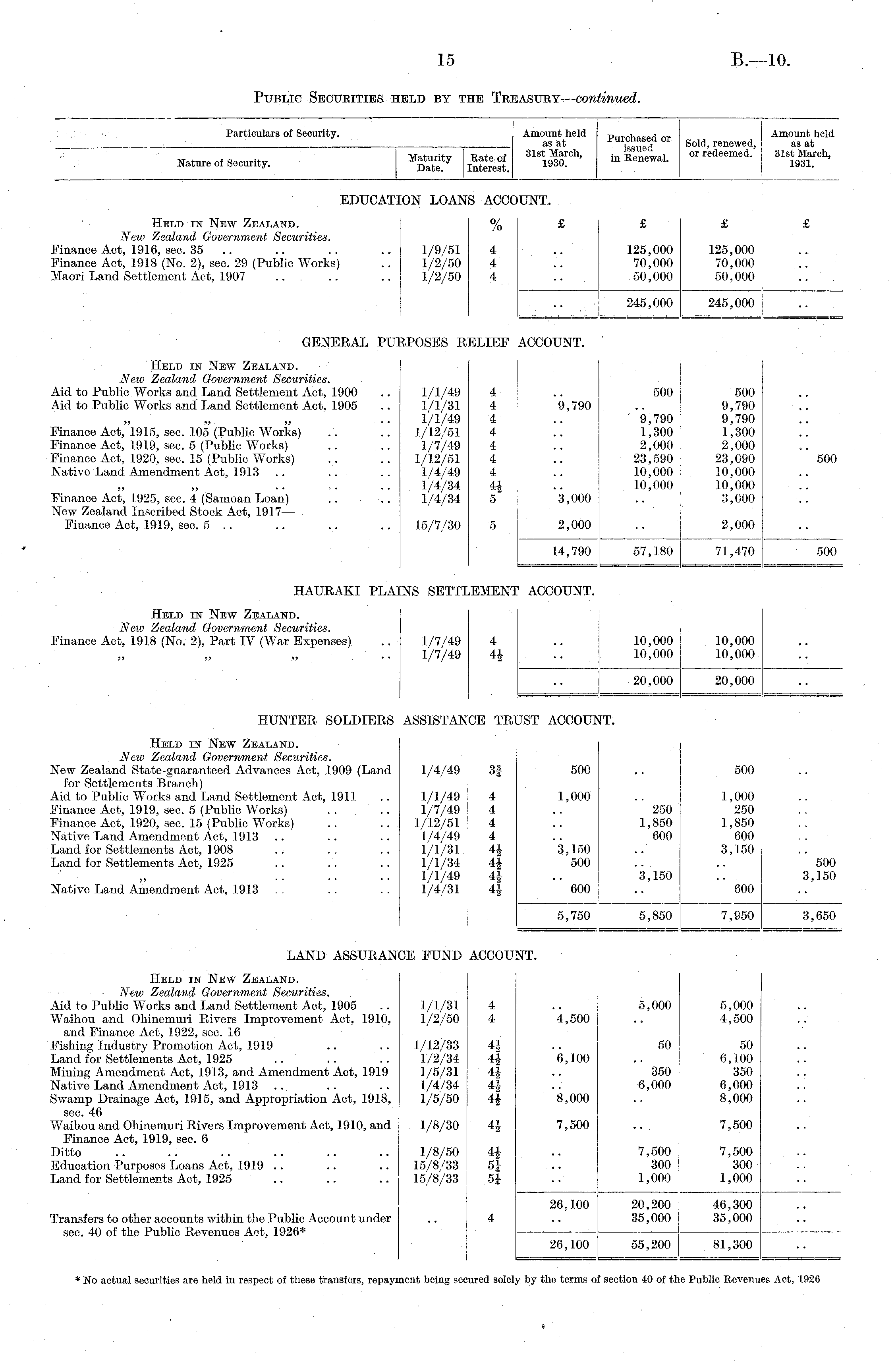 Particulars of Security. Amount held p„ t .l 00 , __ Amount held as at Sold, renewed, as at Matnritv Eatp of 31st March, in lipripwnl or redeemed. 31st March, Nature of Security. Date Interest 1930 ' Renewal. 193 i. EDUCATION LOANS ACCOUNT. Held in New Zealand. % £ £ £ £ New Zealand Government Securities. Finance Act, 1916, sec. 33 .. .. .. .. 1/9/51 4 .. 125,000 125,000 Finance Act, 1918 (No. 2), sec. 29 (Public Works) .. 1/2/50 4 .. 70,000 70,000 Maori Land Settlement Act, 1907 .. .. .. 1/2/50 4 .. 50,000 50,000 | 245,000 245,000 GENERAL PURPOSES RELIEF ACCOUNT. Held in New Zealand. New Zealand Government Securities. Aid to Public Works and Land Settlement Act, 1900 .. 1/1/49 4 .. 500 500 Aid to Public Works and Land Settlement Act, 1905 .. 1/1/31 4 9,790 .. 9,790 „ „ „ .. 1/1/49 4 .. 9,790 9,790 Finance Act, 1915, sec. 105 (Public Works) .. .. 1/12/51 4 .. 1,300 1,300 Finance Act, 1919, sec. 5 (Public Works) .. .. 1/7/49 4 .. 2,000 2,000 Finance Act, 1920, sec. 15 (Public Works) .. .. 1/12/51 4 .. 23,590 23,090 500 Native Land Amendment Act, 1913 .. .. .. 1/4/49 4 .. 10,000 10,000 1/4/34 4\ .. 10,000 10,000 Finance Act, 1925, sec. 4 (Samoan Loan) .. .. 1/4/34 5 3,000 .. 3,000 New Zealand Inscribed Stock Act, 1917— Finance Act, 1919, sec. 5 .. .. .. .. 15/7/30 5 2,000 .. 2,000 14,790 57,180 71,470 500 HAURAKI PLAINS SETTLEMENT ACCOUNT. Held in New Zealand. New Zealand Government Securities. Finance Act, 1918 (No. 2), Part IV (War Expenses) .. 1/7/49 4 .. 10,000 10,000 1/7/49 4| .. 10,000 10,000 20,000 20,000 HUNTER SOLDIERS ASSISTANCE TRUST ACCOUNT. Held in New Zealand. New Zealand Government Securities. New Zealand State-guaranteed Advances Act, 1909 (Land 1/4/49 3} 500 .. 500 for Settlements Branch) Aid to Public Works and Land Settlement Act, 1911 .. 1/1/49 4 1,000 .. 1,000 Finance Act, 1919, sec. 5 (Public Works) .. .. 1/7/49 4 .. 250 250 Finance Act, .1920, sec. 15 (Public Works) .. .. 1/12/51 4 .. 1,850 1,850 Native Land Amendment Act, .1913 .. .. .. 1/4/49 4 .. 600 600 Land for Settlements Act, 1908 .. .. .. 1/1/31 4J 3,150 .. 3,150 Land for Settlements Act, 1925 .. .. .. 1/1/34 4J 500 .. .. 500 1/1/49 •• 3,150 .. 3,150 Native Land Amendment Act, 1913 . . .. .. 1/4/31 4£ 600 .. 600 5,750 5,850 7,950 3,650 LAND ASSURANCE FUND ACCOUNT. Held in New Zealand. New Zealand Government Securities. Aid to Public Works and Land Settlement Act, 1905 .. 1/1/31 4 .. 5,000 5,000 Waihou and Ohinemuri Rivers Improvement Act, 1910, 1/2/50 4 4,500 .. 4,500 and Finance Act, 1922, sec. 16 Fishing Industry Promotion Act, 1919 .. 1/12/33 .. 50 50 Land for Settlements Act, 1925 .. .. .. 1/2/34 4|- 6,100 .. 6,100 Mining Amendment Act, 1913, and Amendment Act, 1919 1/5/3.1 4v .. 350 350 Native Land Amendment Act, 1913 .. .. .. 1/4/34 41 .. 6,000 6,000 Swamp Drainage Act, 1915, and Appropriation Act, 1918, 1/5/50 4J 8,000 .. 8,000 sec. 46 Waihou and Ohinemuri Rivers Improvement Act, 1910, and 1/8/30 4J 7,500 .. 7,500 Finance Act, 1919, sec. 6 Ditto .. .. .. .. .. .. 1/8/50 4J .. 7,500 7,500 Education Purposes Loans Act, 1919 .. .. .. 15/8/33 5} .. 300 300 Land for Settlements Act, 1925 .. .. .. 15/8/33 5£ .. 1,000 1,000 26,100 20,200 46,300 Transfers to other accounts within the Public Account under .. 4 .. 35,000 35,000 see. 40 of the Public Revenues Act, 1926* 26,100 55,200 81,300 * No actual securities are held in respect of these transfers, repayment being secured solely by the terms of section 40 of the Public Revenues Act, 1926