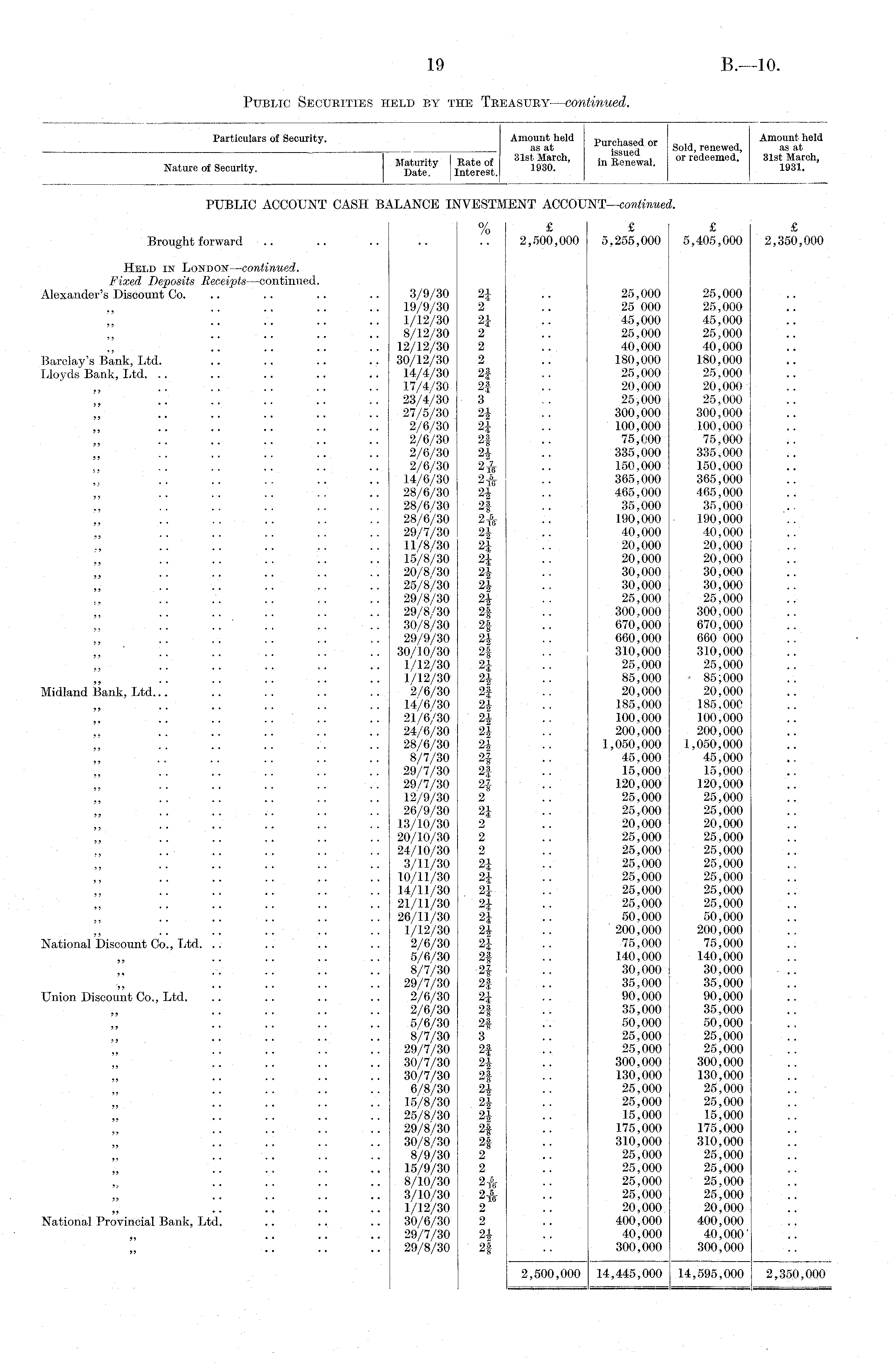 Particulars of Security. Amount held ™ Amount held as at Sold, renewed, as at Matnritv Tiit.. of 31st March, , X™eu or redeemed. 31st March, Nature of Security. Date Interest 103 °- Renewal. 1031 _ PUBLIC ACCOUNT CASH BALANCE INVESTMENT ACCOUNT—continued. % £ £ £ £ Brought forward .. .. .. .. .? 2,500,000 5,255,000 5,405,000 2,350,000 Held in London—continued. Fixed Deposits Receipts—continued. Alexander's Discount Co. .. .. .. .. 3/9/30 2J .. 25,000 25,000 19/9/30 2 .. 25 000 25,000 1/12/30 2-1 .. 45,000 45,000 8/12/30 2 .. 25,000 25,000 ,, .. .. .. .. 12/12/30 2 .. 40,000 40,000 Barclay's Bank, Ltd. .. .. .. .. 30/12/30 2 .. 180,000 180,000 Lloyds Bank, Ltd. .. .. .. .. .. 14/4/30 2f .. 25,000 25,000 17/4/30 2} .. 20,000 20,000 „ .. .. .. .. .. 23/4/30 3 . 25,000 25,000 27/5/30 24 .. 300,000 300,000 2/6/30 2| .. 100,000 100,000 2/6/30 2| .. 75,000 75,000 2/6/30 2-1- .. 335,000 335,000 2/6/30 .. 150.000 150,000 14/6/30 .. 365,000 365,000 28/6/30 2J .. 465,000 465,000 28/6/30 2f .. 35,000 35,000 28/6/30 2-fe .. 190,000 190,000 29/7/30 24 .. 40,000 40,000 11/8/30 2J .. 20,000 20,000 15/8/30 2J .. 20,000 20,000 20/8/30 2i .. 30,000 30,000 25/8/30 2J .. 30,000 30,000 29/8/30 2J .. 25,000 25,000 29/8/30 2f .. 300.000 300,000 30/8/30 2f .. 670,000 670,000 29/9/30 2| .. 660,000 660 000 ,, .. .. .. .. .. 30/10/30 2§ . . 310,000 310,000 1/12/30 2i .. 25,000 25,000 1/12/30 2J .. 85,000 ■ 85;000 Midland Bank, Ltd... .. .. .. .. 2/6/30 2f .. 20,000 20,000 14/6/30 2J .. 185,000 185,00C 21/6/30 24 .. 100.000 100,000 24/6/30 24 .. 200,000 200,000 28/6/30 24 .. 1,050,000 1,050,000 8/7/30 21- .. 45,000 45,000 29/7/30 2f .. 15,000 15,000 29/7/30 2|- .. 120,000 120,000 12/9/30 2 .. 25,000 25,000 26/9/30 2| .. 25,000 25,000 .. 13/10/30 2 .. 20.000 20,000 .. 20/10/30 2 .. 25,000 25,000 .. 24/10/30 2 .. 25,000 25,000 3/11/30 2J .. 25,000 25,000 .. 10/11/30 2J .. 25,000 25,000 .. 14/11/30 2J .. 25,000 25,000 .. 21/11/30 2} .. 25,000 25,000 .. 26/11/30 2| .. 50,000 50,000 1/12/30 24 .. 200,000 200,000 National Discount Co., Ltd. .. .. .. .. 2/6/30 2J .. 75,000 75,000 5/6/30 2f .. 140,000 140,000 8/7/30 2£ .. 30,000 30,000 29/7/30 2f .. 35,000 35,000 Union Discount Co., Ltd. .. .. .. .. 2/6/30 2} .. 90,000 90,000 2/6/30 2§ .. 35,000 35,000 5/6/30 2f .. 50,000 50,000 8/7/30 3 .. 25,000 25,000 29/7/30 2-| .. 25,000 25,000 30/7/30 24 .. 300,000 300,000 30/7/30 2| .. 130,000 130,000 6/8/30 24 .. 25,000 25,000 15/8/30 24 .. 25,000 25,000 25/8/30 24 .. 15,000 15,000 29/8/30 2f .. 175,000 175,000 30/8/30 2| .. 310,000 310,000 8/9/30 2 .. 25,000 25,000 15/9/30 2 .. 25,000 25,000 8/10/30 2f g .. 25,000 25,000 3/10/30 2-& .. 25,000 25,000 1/12/30 2 .. 20,000 20,000 National Provincial Bank, Ltd. .. .. .. 30/6/30 2 .. 400,000 400,000 29/7/30 24 .. 40,000 40,000 29/8/30 2|- .. 300,000 300,000 2,500,000 14,445,000 14,595,000 2,350,000