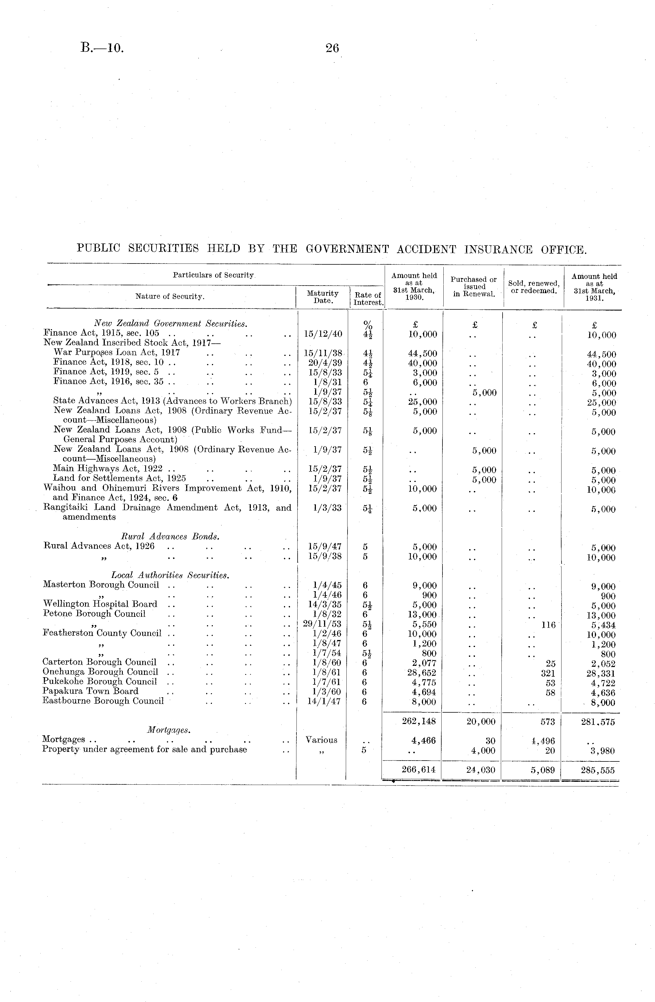 Particulars o( Security Amount held Amount held . . as at f'S Sold, renewed, as at Mstnritv , , 31st March, {„ t) 0 ™i or redeemed. 31st March. Nature of Security. Maturity R a t e of 193 o ln Renewal. 1931 .Date. Interest. j New Zealand Government Securities. % £ £ £ I £ Finance Act, 1915, sec. 105 .. .. .. .. 15/12/40 4| 10,000 .. .. ! 10,000 New Zealand Inscribed Stock Act, 1917— War Purposes Loan Act, 1917 .. .. .. 15/11/38 4J 44,500 .. .. 44,500 Finance Act, 1918, sec. 10 .. .. .. .. 20/4/39 4f 40,000 .. .. 40,000 Finance Act, 1919, sec. 5 .. .. .. .. 15/8/33 5£ 3,000 .. .. 3,000 Finance Act, 1916, sec. 35 .. .. .. .. 1/8/31 6 6,000 .. .. 6,000 1/9/37 5 J .. 5,000 .. 5,000 State Advances Act, 1913 (Advances to Workers Branch) 15/8/33 5| 25,000 .. .. 25,000 New Zealand Loans Act, 1908 (Ordinary Revenue Ac- 15/2/37 5J 5,000 .. .. 5,'000 count—Miscellaneo as) New Zealand Loans Act, 1908 (Public Works Fund— 15/2/37 5J 5,000 .. .. 5,000 General Purposes Account) New Zealand Loans Act, 1908 (Ordinary Revenue Ac- 1/9/37 5f .. 5,000 .. 5,000 count—Miscellaneous) Main Highways Act, 1922 .. .. . , .. 15/2/37 5J .. 5,000 .. 5,000 Land for Settlements Act, 1925 .. .. .. 1/9/37 5f .. 5,000 .. 5,000 Waihou and Ohinemuri Rivers Improvement Act, 1910, 15/2/37 5J 10,000 .. .. 10,000 and Finance Act, 1924, sec. 6 Rangitaiki Land Drainage Amendment Act, 1913, and 1/3/33 5| 5,000 .. .. 5,000 amendments Sural Advances Bonds. Rural Advances Act, 1926 .. .. .. .. 15/9/47 5 5,000 .. .. 5,000 15/9/38 5 10,000 .. .. 10,000 Local Authorities Securities. Masterton Borough Council .. .. .. .. | 1/4/45 6 9,000 .. .. 9,000 „ I 1/4/46 6 900 .. .. '900 Wellington Hospital Board .. .. .. .. 14/3/35 5J 5,000 .. .. 5,000 Petone Borough Council .. .. .. .. 1/8/32 6" 13,000 .. .. 13,000 •• 29/11/53 5J 5,550 .. 116 5,434 Featherston County Council . . .. .. .. 1/2/46 6 10,000 .. .. 10,000 „ ■■ ■■ ■■ • • 1/8/47 6 1,200 .. .. 1^200 1/7/54 5J 800 .. .. 800 Carterton Borough Council .. .. .. .. 1/8/60 6 2,077 .. 25 2,052 Onehunga Borough Council .. .. .. .. 1/8/61 6 28,652 .. 321 28^331 Pukekohe Borough Council .. .. .. .. 1/7/61 6 4,775 .. 53 4,722 Papakura Town Board .. .. .. .. 1/3/60 6 4,694 .. 58 4,636 Eastbourne Borough Council .. .. 14/1/47 6 8,000 .. .. j 8,000 262,148 20,000 573 281,575 Mortgages. Mortgages.. .. .. .. .. .. Various .. 4,466 30 4,496 Property under agreement for sale and purchase .. „ 5 .. 4,000 20 3,980 266,614 24,030 5,089 285,555