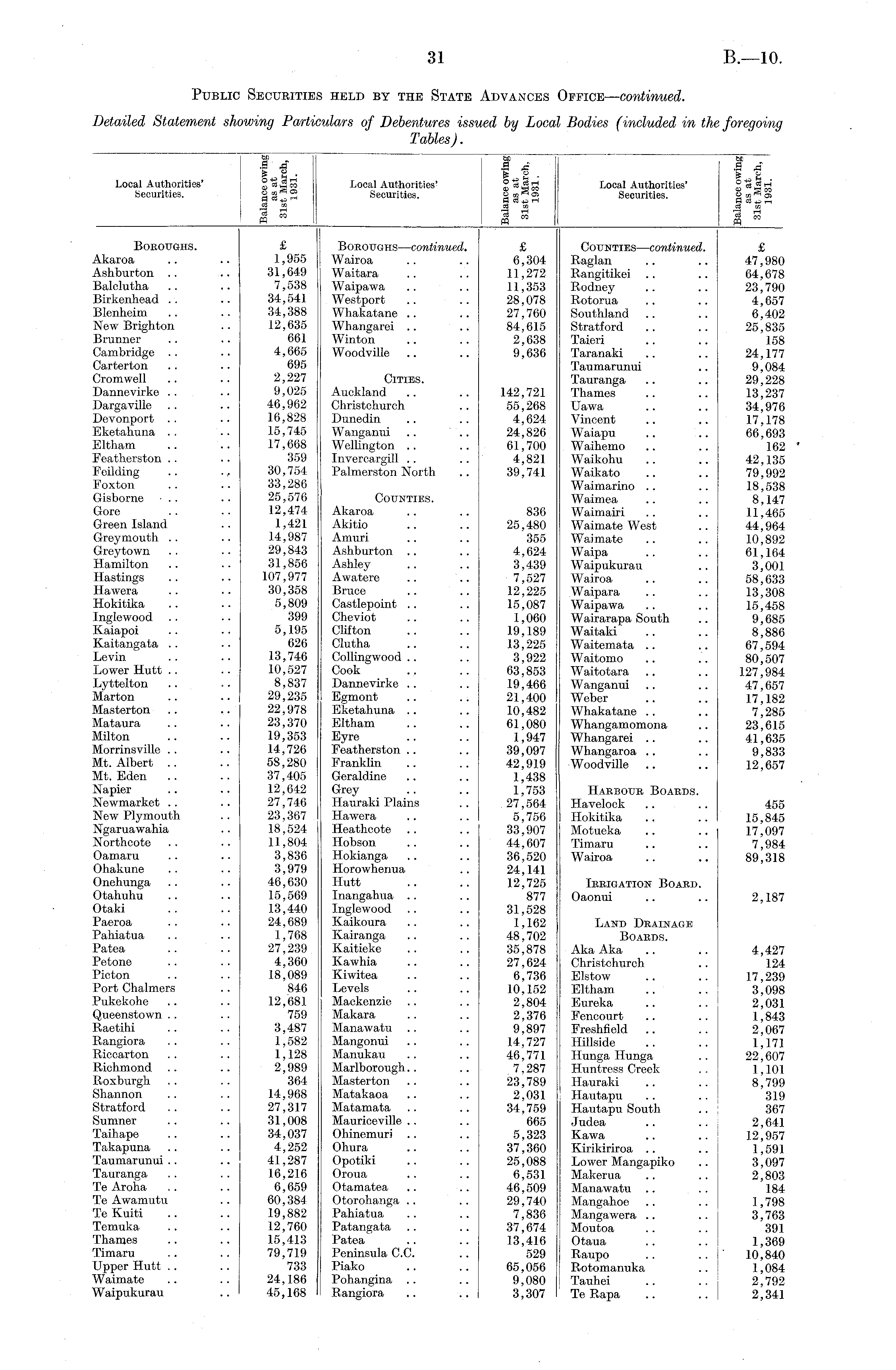 I 2P W) ac 'I "§ 4 o" Local Authorities' j ° ts Local Authorities' 2 m o5 Local Authorities' 2 d Securities. S c§ . 2 Securities. S 2 S Securities. H w 40 r- B raprI P c3 4j r—, J2 ; eS 03 c$ co W ra w a jjj « Boroughs. £ Boroughs—continued. £ Counties —continued. £ Akaroa .. .. 1,955 Wairoa .. .. 6,304 Baglan .. .. 47,980 Ashburton .. .. 31,649 Waitara .. .. 11,272 Bangitikei .. .. 64,678 Balclutha .. .. 7,538 Waipawa .. .. 11,353 Bodney .. .. 23,790 Birkenhead .. .. 34,541 Westport .. .. 28,078 Botorua .. .. 4,657 Blenheim .. .. 34,388 Whakatane .. .. 27,760 Southland .. .. 6,402 New Brighton .. 12,635 Whangarei .. .. 84,615 Stratford .. .. 25,835 Brunner .. .. 661 Winton .. .. 2,638 Taieri .. .. 158 Cambridge .. .. 4,665 Woodville .. .. 9,636 Taranaki .. .. 24,177 Carterton .. .. 695 Taumarunui .. 9,084 Cromwell .. .. 2,227 Cities. Tauranga .. .. 29,228 Dannevirke .. .. 9,025 Auckland .. .. 142,721 Thames .. .. 13,237 Dargaville .. .. 46,962 Christchurch .. 55,268 Uawa .. .. 34,976 Devonport .. .. 16,828 Dunedin .. .. 4,624 Vincent .. .. 17,178 Eketahuna .. .. 15,745 Wanganui .. .. 24,826 Waiapu .. .. 66,693 Eltham .. .. 17,668 Wellington .. .. 61,700 Waihemo .. .. 162 Featherston.. .. 359 Invercargill .. .. 4,821 Waikohu .. .. 42,135 Feilding .. 30,754 Palmerston North .. 39,741 Waikato .. .. 79,992 Foxton .. .. 33,286 Waimarino .. .. 18,538 Gisborne • .. 25,576 Counties. Waimea .. .. 8,147 Gore .. .. 12,474 Akaroa .. .. 836 Waimairi .. .. 11,465 Green Island .. 1,421 Akitio .. .. 25,480 Waimate West .. 44,964 Greymouth .. .. 14,987 Amuri .. .. 355 Waimate .. .. 10,892 Greytown .. .. 29,843 Ashburton .. .. 4,624 Waipa .. .. 61,164 Hamilton .. .. 31,856 Ashley .. .. 3,439 Waipukurau .. 3,001 Hastings .. .. 107,977 Awatere .. .. 7,527 Wairoa .. .. 58,633 Hawera .. .. 30,358 Bruce .. .. 12,225 Waipara .. .. 13,308 Hokitika .. .. 5,809 Castlepoint .. .. 15,087 Waipawa .. .. 15,458 Inglewood .. .. 399 Cheviot .. .. 1,060 Wairarapa South .. 9,685 Kaiapoi .. .. 5,195 Clifton .. .. 19,189 Waitaki .. .. 8,886 Kaitangata .. .. 626 Clutha .. .. 13,225 Waitemata .. .. 67,594 Levin .. .. 13,746 Collingwood .. .. 3,922 Waitomo .. . . 80,507 Lower Hutt .. .. 10,527 Cook .. .. 63,853 Waitotara .. .. 127,984 Lyttelton .. .. 8,837 Dannevirke .. .. 19,466 Wanganui .. .. 47,657 Marton .. .. 29,235 Egmont .. .. 21,400 Weber .. .. 17,182 Masterton .. .. 22,978 Eketahuna .. .. 10,482 Whakatane .. .. 7,285 Mataura .. .. 23,370 Eltham .. .. 61,080 Whangamomona .. 23,615 Milton .. .. 19,353 Eyre .. .. 1,947 Whangarei .. .. 41,635 Morrinsville .. .. 14,726 Featherston.. .. 39,097 Whangaroa .. .. 9,833 Mt. Albert .. .. 58,280 Franklin .. .. 42,919 Woodville .. .. 12,657 Mt. Eden .. .. 37,405 Geraldine .. .. 1,438 Napier .. .. 12,642 Grey .. .. 1,753 Harbour Boards. Newmarket .. .. 27,746 Hauraki Plains .. 27,564 Havelock .. .. 455 New Plymouth .. 23,367 Hawera .. .. 5,756 Hokitika .. .. 15,845 Ngaruawahia .. 18,524 Heathcote .. .. 33,907 Motueka .. .. 17,097 Northcote .. .. 11,804 Hobson .. .. 44,607 Timaru .. .. 7,984 Oamaru .. .. 3,836 Hokianga .. .. 36,520 Wairoa .. .. 89,318 Ohakune .. .. 3,979 Horowhenua .. 24,141 Onehunga .. .. 46,630 Hutt .. .. 12,725 Irrigation Board. Otahuhu .. .. 15,569 Inangahua .. .. 877 Oaonui .. .. 2,187 Otaki .. .. 13,440 Inglewood .. .. 31,528 Paeroa .. .. 24,689 Kaikoura .. .. 1,162 Land Drainage Pahiatua .. .. 1,768 Kairanga .. .. 48,702 Boards. Patea .. .. 27,239 Kaitieke .. .. 35,878 Aka Aka .. .. 4,427 Petone .. .. 4,360 Kawhia .. .. 27,624 Christchurch .. 124 Picton .. .. 18,089 Kiwitea .. .. 6,736 Elstow .. .. 17,239 Port Chalmers .. 846 Levels .. .. 10,152 Eltham .. .. 3,098 Pukekohe .. .. 12,681 Mackenzie .. .. 2,804 Eureka .. .. 2,031 Queenstown .. .. 759 Makara .. .. 2,376 Fencourt .. .. 1,843 Baetihi .. .. 3,487 Manawatu .. .. 9,897 Freshfield .. .. 2,067 Bangiora .. .. 1,582 Mangonui .. .. 14,727 Hillside .. .. 1,17] Biccarton .. .. 1,128 Manukau .. .. 46,771 Hunga Hunga .. 22,607 Bichmond .. .. 2,989 Marlborough.. .. 7,287 Huntress Creek .. 1,101 Boxburgh .. .. 364 Masterton .. .. 23,789 Hauraki .. .. 8,799 Shannon .. .. J4,968 Matakaoa .. .. 2,031 Hautapu .. .. 319 Stratford .. .. 27,317 Matamata .. .. 34,759 Hautapu South .. 367 Sumner .. .. 31,008 Mauriceville .. .. 665 Judea .. .. 2,641 Taihape .. .. 34,037 Ohinemuri .. .. 5,323 Kawa .. .. 12,957 Takapuna .. .. 4,252 Ohura .. .. 37,360 Kirikiriroa .. .. 1,591 Taumarunui.. .. 41,287 Opotiki .. .. 25,088 Lower Mangapiko .. 3,097 Tauranga .. .. 16,216 Oroua .. .. 6,531 Makerua .. .. 2,803 Te Aroha .. .. 6,659 Otamatea .. .. 46,509 Manawatu .. .. 184 Te Awamutu .. 60,384 Otorohanga .. .. 29,740 Mangahoe .. .. 1,798 Te Kuiti .. .. 19,882 Pahiatua .. .. 7,836 Mangawera .. .. 3,763 Temuka .. .. 12,760 Patangata .. .. 37,674 Moutoa .. .. 391 Thames .. .. 15,413 Patea .. .. 13,416 Otaua .. .. 1,369 Timaru .. .. 79,719 Peninsula C.C. .. 529 Baupo .. ' 10,840 Upper Hutt .. .. 733 Piako .. .. 65,056 Botomanuka .. 1,084 Waimate .. .. 24,186 Pohangina .. .. 9,080 Tauhei .. .. 2,792 Waipukurau .. 45,168 Bangiora .. .. 3,307 Te Bapa .. .. 2,341