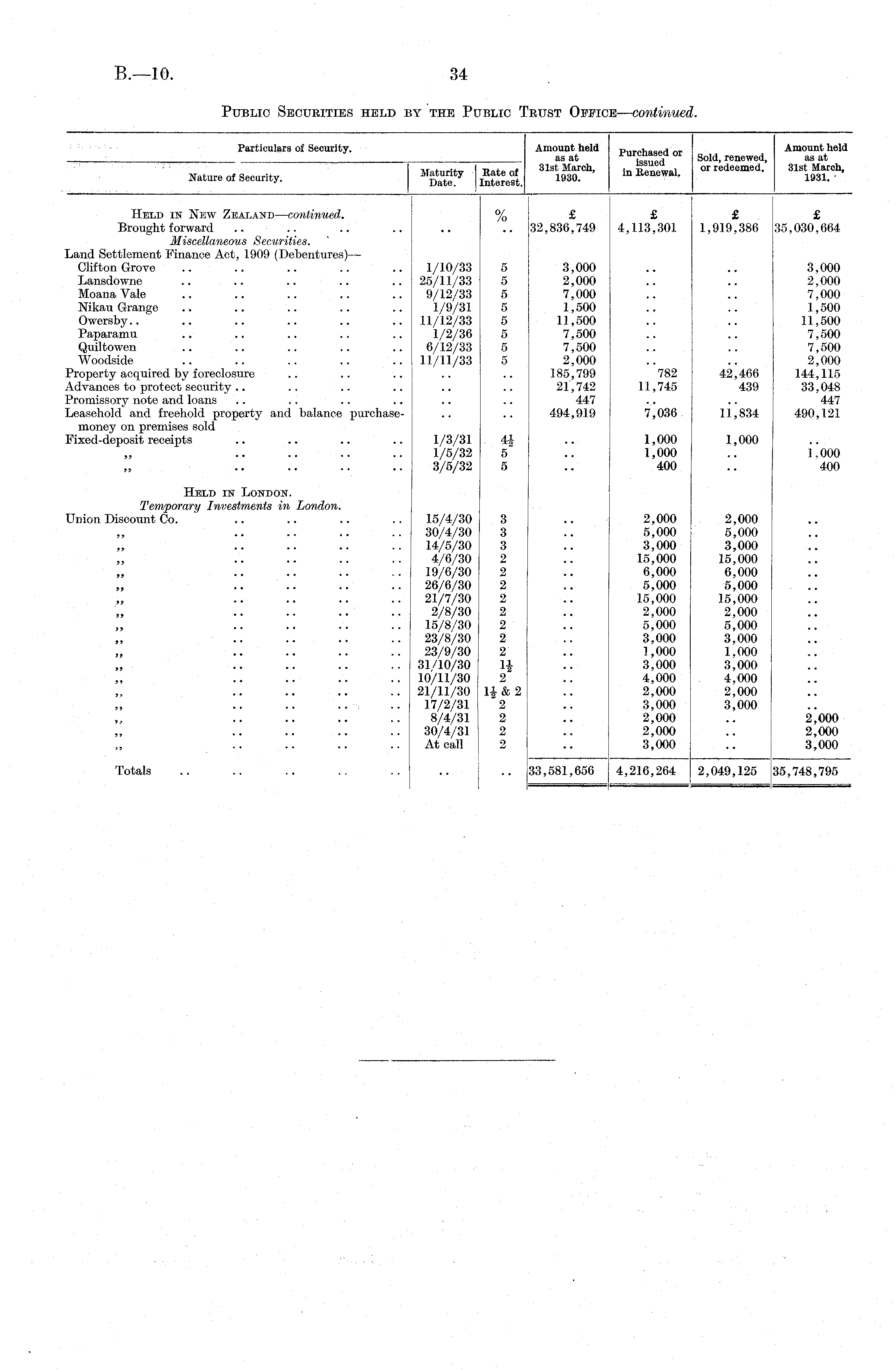 Particulars of Security. Amount held Amount held as at f.anpH Sold, renewed, as at Mflturitv Pntp Of 31st March > in Renewal or redeemed. 31st March, Nature of Security. Date Interest 193 °" Renewal. M31.. • Held est New Zealand —continued% £ £ £ £ Brought forward .. .. .. .. .. .. 32,836,749 4,113,301 1,919,386 35,030,664 Miscellaneous Securities. Land Settlement Finance Act, 1909 (Debentures) — Clifton Grove .. .. .. .. .. 1/10/33 5 3,000 .. .. 3,000 Lansdowne .. .. .. .. .. 25/11/33 5 2,000 .. .. 2,000 Moana Vale .. .. .. .. .. 9/12/33 5 7,000 .. .. 7,000 Nikau Grange .. .. .. .. .. 1/9/31 5 1,500 .. .. 1,500 Owersby.. .. .. .. .. .. 11/12/33 5 11,500 .. .. 11,500 Paparamu .. .. .. .. .. 1/2/36 5 7,500 .. .. 7,500 Quiltowen .. .. .. .. .. 6/12/33 5 7,500 .. .. 7,500 Woodside .. .. .. .. .. 11/11/33 5 2,000 .. .. 2,000 Property acquired by foreclosure .. .. .. .. .. 185,799 782 42,466 144,115 Advances to protect security.. .. .. .. .. .. 21,742 11,745 439 33,048 Promissory note and loans .. .. .. .. .. .. 447 .. .. 447 Leasehold and freehold property and balance purchase- .. .. 494,919 7,036 11,834 490,121 money on premises sold Fixed-deposit receipts .. .. .. .. 1/3/31 4i .. 1,000 1,000 1/5/32 5" .. 1,000 .. 1.000 3/5/32 5 .. 400 .. 400 Held in London. Temporary Investments in London. Union Discount Co. .. .. .. .. I 15/4/30 3 .. 2,000 2,000 .. 30/4/30 3 .. 5,000 5,000 .. ! 14/5/30 3 .. 3,000 3,000 .. | 4/6/30 2 .. 15,000 15,000 19/6/30 2 .. 6,000 6,000 26/6/30 2 .. 5,000 5,000 21/7/30 2 .. 15,000 15,000 2/8/30 2 .. 2,000 2,000 15/8/30 2 .. 5,000 5,000 23/8/30 2 .. 3,000 3,000 23/9/30 2 .. 1,000 1,000 .. 31/10/30 1J .. 3,000 3,000 .. 10/11/30 2 .. 4,000 4,000 .. 21/11/30 li&2 .. 2,000 2,000 17/2/31 2 .. 3,000 3,000 8/4/31 2 .. 2,000 .. 2,000 30/4/31 2 .. 2,000 .. 2,000 At call 2 .. 3,000 .. 3,000 Totals .. .. .. .. .. .. .. 33,581,656 4,216,264 2,049,125 35,748,795 | = , , ===, , , , -n r rr-r l ■ , =