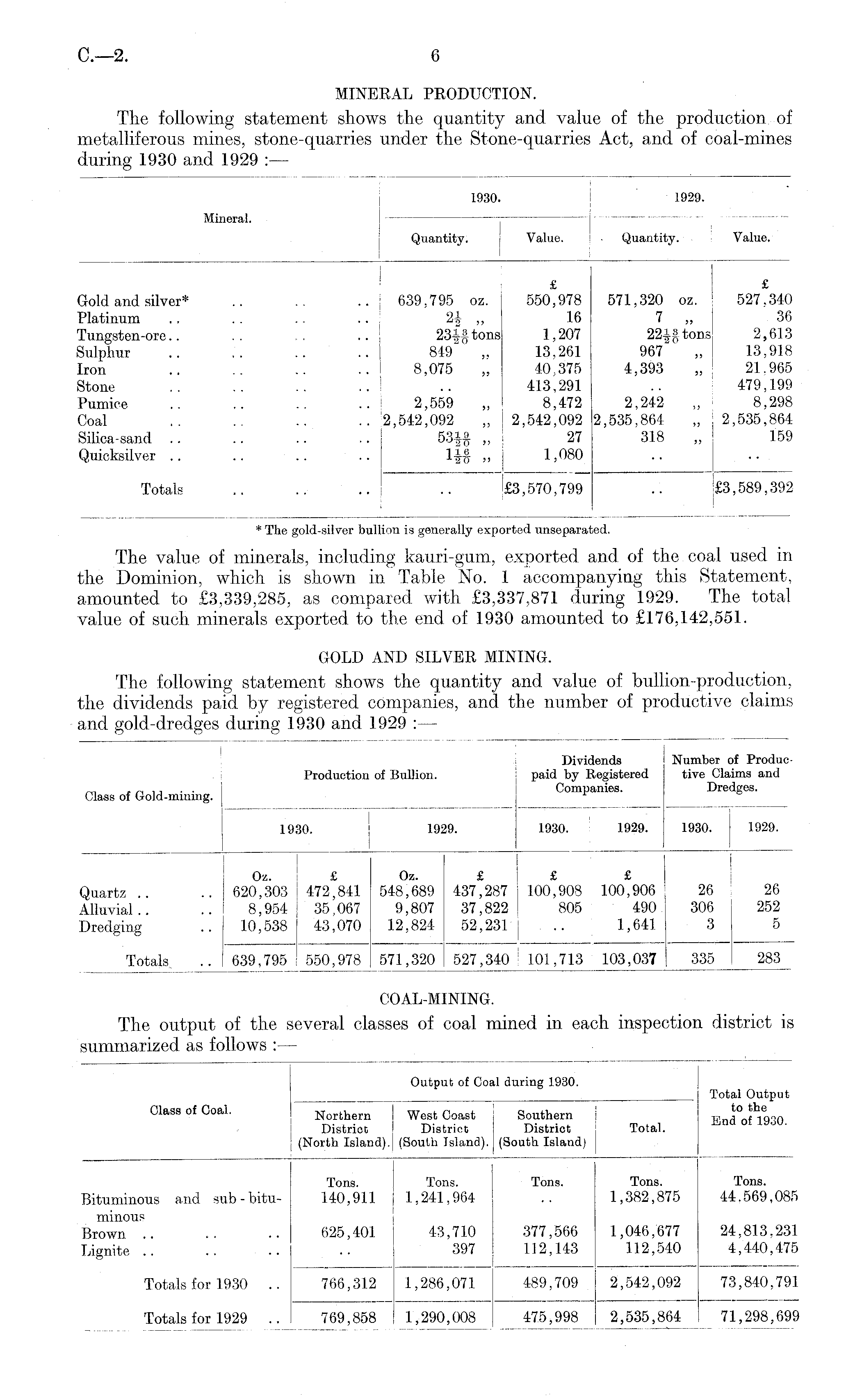 The value of minerals, including kauri-gum, exported and of the coal used in the Dominion, which is shown in Table No. 1 accompanying this Statement, amounted to £3,339,285, as compared with £3,337,871 during 1929. The total value of such minerals exported to the end of 1930 amounted to £176,142,551. GOLD AND SILVER MINING. The following statement shows the quantity and value of bullion-production, the dividends paid by registered companies, and the number of productive claims and gold-dredges during 1930 and 1929 : —
