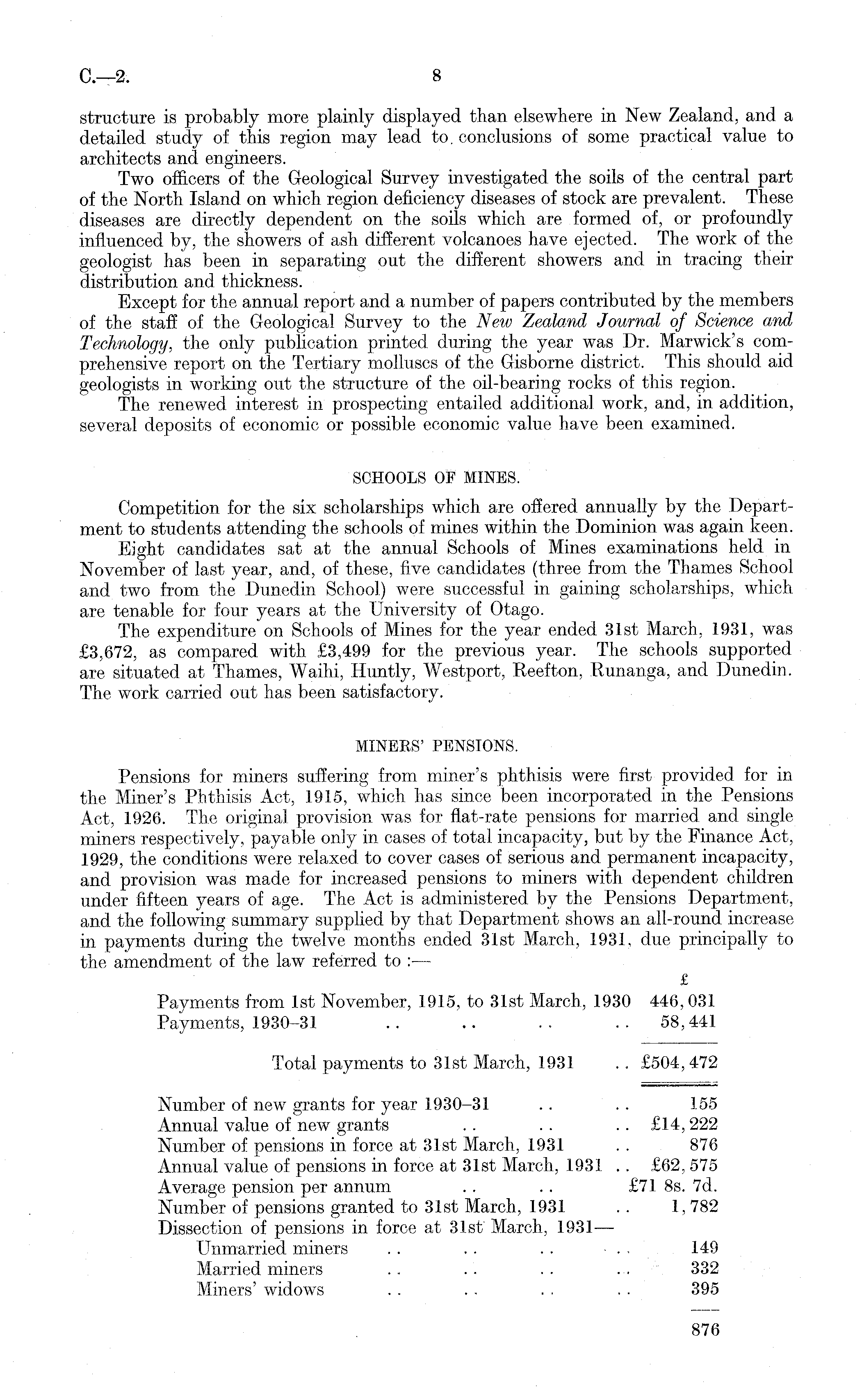 structure is probably more plainly displayed than elsewhere in New Zealand, and a detailed study of this region may lead to. conclusions of some practical value to architects and engineers. Two officers of the Geological Survey investigated the soils of the central part of the North Island on which region deficiency diseases of stock are prevalent. These diseases are directly dependent on the soils which are formed of, or profoundly influenced by, the showers of ash different volcanoes have ejected. The work of the geologist has been in separating out the different showers and in tracing their distribution and thickness. Except for the annual report and a number of papers contributed by the members of the staff of the Geological Survey to the New Zealand Journal of Science and Technology, the only publication printed during the year was Dr. Marwick's comprehensive report on the Tertiary molluscs of the Gisborne district. This should aid geologists in working out the structure of the oil-bearing rocks of this region. The renewed interest in prospecting entailed additional work, and, in addition, several deposits of economic or possible economic value have been examined. SCHOOLS OF MINES. Competition for the six scholarships which are offered annually by the Department to students attending the schools of mines within the Dominion was again keen. Bight candidates sat at the annual Schools of Mines examinations held in November of last year, and, of these, five candidates (three from the Thames School and two from the Dunedin School) were successful in gaining scholarships, which are tenable for four years at the University of Otago. The expenditure on Schools of Mines for the year ended 31st March, 1931, was £3,672, as compared with £3,499 for the previous year. The schools supported are situated at Thames, Waihi, Huntly, Westport, Reef ton. Runanga, and Dunedin. The work carried out has been satisfactory. MINERS' PENSIONS. Pensions for miners suffering from miner's phthisis were first provided for in the Miner's Phthisis Act, 1915, which has since been incorporated in the Pensions Act, 1926. The original provision was for flat-rate pensions for married and single miners respectively, payable only in cases of total incapacity, but by the Finance Act, 1929, the conditions were relaxed to cover cases of serious and permanent incapacity, and provision was made for increased pensions to miners with dependent children under fifteen years of age. The Act is administered by the Pensions Department, and the following summary supplied by that Department shows an all-round increase in payments during the twelve months ended 31st March, 1931, due principally to the amendment of the law referred to : — £ Payments from Ist November, 1915, to 31st March, 1930 446,031 Payments, 1930-31 .. .. .. .. 58,441 Total payments to 31st March, 1931 . . £504,472 Number of new grants for year 1930-31 . . . . 155 Annual value of new grants . . . . . . £14,222 Number of pensions in force at 31st March, 1931 . . 876 Annual value of pensions in force at 31st March, 1931 . . £62, 575 Average pension per annum . . . . £71 Bs. 7d. Number of pensions granted to 31st March, 1931 . . 1,782 Dissection of pensions in force at 31st March, 1931 — Unmarried miners . . . . . . - . . 149 Married miners .. .. .. ... 332 Miners' widows . . . . . . . . 395 876