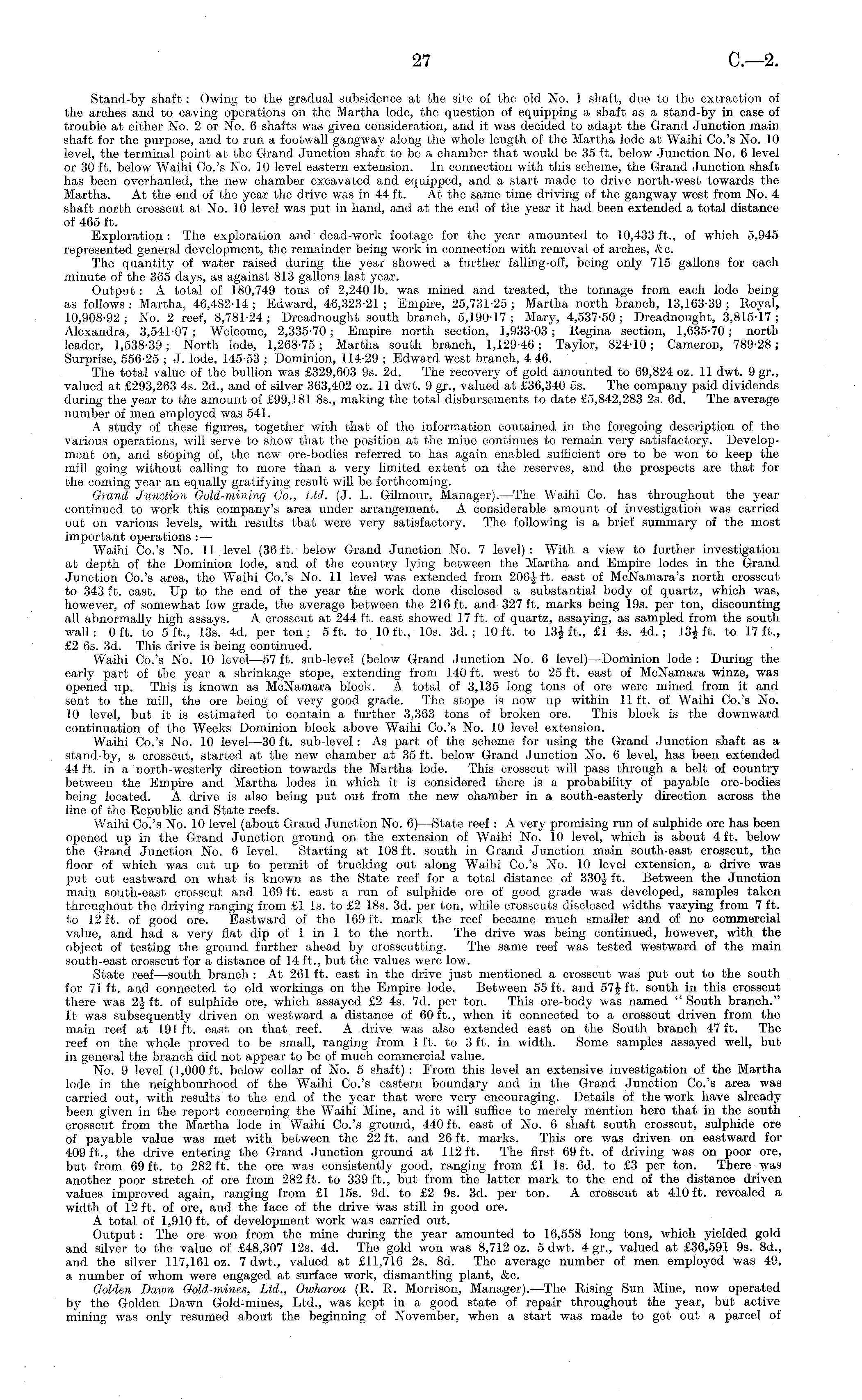 Stand-by shaft: Owing to the gradual subsidence at the site of the old No. 1 shaft, due to the extraction of the arches and to caving operations on the Martha lode, the question of equipping a shaft as a stand-by in case of trouble at either No. 2 or No. 6 shafts was given consideration, and it was decided to adapt the Grand Junction main shaft for the purpose, and to run a footwall gangway along the whole length of the Martha lode at Waihi Co.'s No. .10 level, the terminal point at the Grand Junction shaft to be a chamber that would be 35 ft. below Junction No. 6 level or 30 ft. below Waihi Co.'s No. 10 level eastern extension. In connection with this scheme, the Grand Junction shaft has been overhauled, the new chamber excavated and equipped, and a start made to drive north-west towards the Martha. At the end of the year the drive was in 44 ft. At the same time driving of the gangway west from No. 4 shaft north crosscut at No. 10 level was put in hand, and at the end of the year it had been extended a total distance of 465 ft. Exploration: The exploration and dead-work footage for the year amounted to 10,433 ft., of which 5,945 represented general development, the remainder being work in connection with removal of arches, itc. The quantity of water raised during the year showed a further falling-olf, being only 715 gallons for each minute of the 365 days, as against. 813 gallons last year. Output: A total of 180,749 tons of 2,2401b. was mined and treated, the tonnage from each lode being as follows: Martha, 46,482-14; Edward, 46,323-21; Empire, 25,731-25; Martha north branch, 13,163-39; Royal, 10,908-92; No. 2 reef, 8,781-24; Dreadnought south branch, 5,190-17; Mary, 4,537-50; Dreadnought, 3,815-1.7; Alexandra, 3,541-07; Welcome, 2,335-70; Empire north section, 1,933-03; Regina section, 1,635-70; north leader, 1,538-39; North lode, 1,268-75; Martha south branch, 1,129-46; Taylor, 824-10; Cameron, 789-28; Surprise, 556-25 ; J. lode, 145-53 ; Dominion, 114-29 ; Edward west branch, 4 46. The total value of the bullion was £329,603 9s. 2d. The recovery of gold amounted to 69,824 oz. 11 dwt. 9gr., valued at £293,263 4s. 2d., and of silver 363,402 oz. 11 dwt. 9 gr., valued at £36,340 ss. The company paid dividends during the year to the amount of £99,181 Bs., making the total disbursements to date £5,842,283 2s. 6d. The average number of men employed was 541. A study of these figures, together with, that of the information contained in the foregoing description of the various operations, will serve to show that the position at the mine continues to remain very satisfactory. Development on, and stoping of, the new ore-bodies referred to has again enabled .sufficient ore to be won to keep the mill going without calling to more than a very limited extent on the reserves, and the prospects are that for the coming year an equally gratifying result will be forthcoming. Grand Junction Gold-mining Co., Ltd. (J. L. Gilmour, Manager). —The Waihi Co. has throughout the year continued to work this company's area under arrangement. A considerable amount of investigation was carried out on various levels, with results that were very satisfactory. The following is a brief summary of the most important operations :— Waihi Co.'s No. 11 level (36ft. below Grand Junction No. 7 level): With a view to further investigation at depth of the Dominion lode, and of the country lying between the Martha and Empire lodes in the Grand Junction Co.'s area, the Waihi Co.'s No. 11 level was extended from 206£ ft. east of McNamara's north crosscut to 343 ft. east. Up to the end of the year the work done disclosed a substantial body of quartz, which was, however, of somewhat low grade, the average between the 216 ft. and 327 ft. marks being 19s. per ton, discounting all abnormally high assays. A crosscut at 244 ft. east showed 17 ft. of quartz, assaying, as sampled from the south wall: Oft. to 5 ft., 13s. 4d. per ton; 5 ft. to 10 ft., 10s. 3d.; 10 ft. to ft., £1 4s. 4d.; 13J ft. to 17 ft., £2 6s. 3d. This drive is being continued. Waihi Co.'s No. 10 level—s7 ft. sub-level (below Grand Junction No. 6 level) —Dominion lode : During the early part of the year a shrinkage stope, extending from 140 ft. west to 25 ft. east of McNamara winze, was opened up. This is known as McNamara block. A total of 3,135 long tons of ore were mined from it and sent to the mill, the ore being of very good grade. The stope is now up within 11 ft. of Waihi Co.'s No. 10 level, but it is estimated to contain a further 3,363 tons of broken ore. This block is the downward continuation of the Weeks Dominion block above Waihi Co.'s No. 10 level extension. Waihi Co.'s No. 10 level—3oft. sub-level: As part of the scheme for using the Grand Junction shaft as a stand-by, a crosscut, started at the new chamber at 35 ft. below Grand Junction No. 6 level, has been extended 44 ft. in a north-westerly direction towards the Martha lode. This crosscut will pass through a belt of country between the Empire and Martha lodes in which it is considered there is a probability of payable ore-bodies being located. A drive is also being put out from the new chamber in a south-easterly direction across the line of the Republic and State reefs. Waihi Co.'s No. 10 level (about Grand Junction No. 6) —State reef : A very promising run of sulphide ore has been opened up in the Grand Junction ground on the extension of Waihi No. 10 level, which is about 4 ft. below the Grand Junction No. 6 level. Starting at 108 ft. south in Grand Junction main south-east crosscut, the floor of which was cut up to permit of trucking out along Waihi Co.'s No. 10 level extension, a drive was put out eastward on what is known as the State reef for a total distance of 330J ft. Between the Junction main, south-east crosscut and 169 ft. east a run of sulphide ore of good grade was developed, samples taken throughout the driving ranging from £1 Is. to £2 18s. 3d. per ton, while crossc