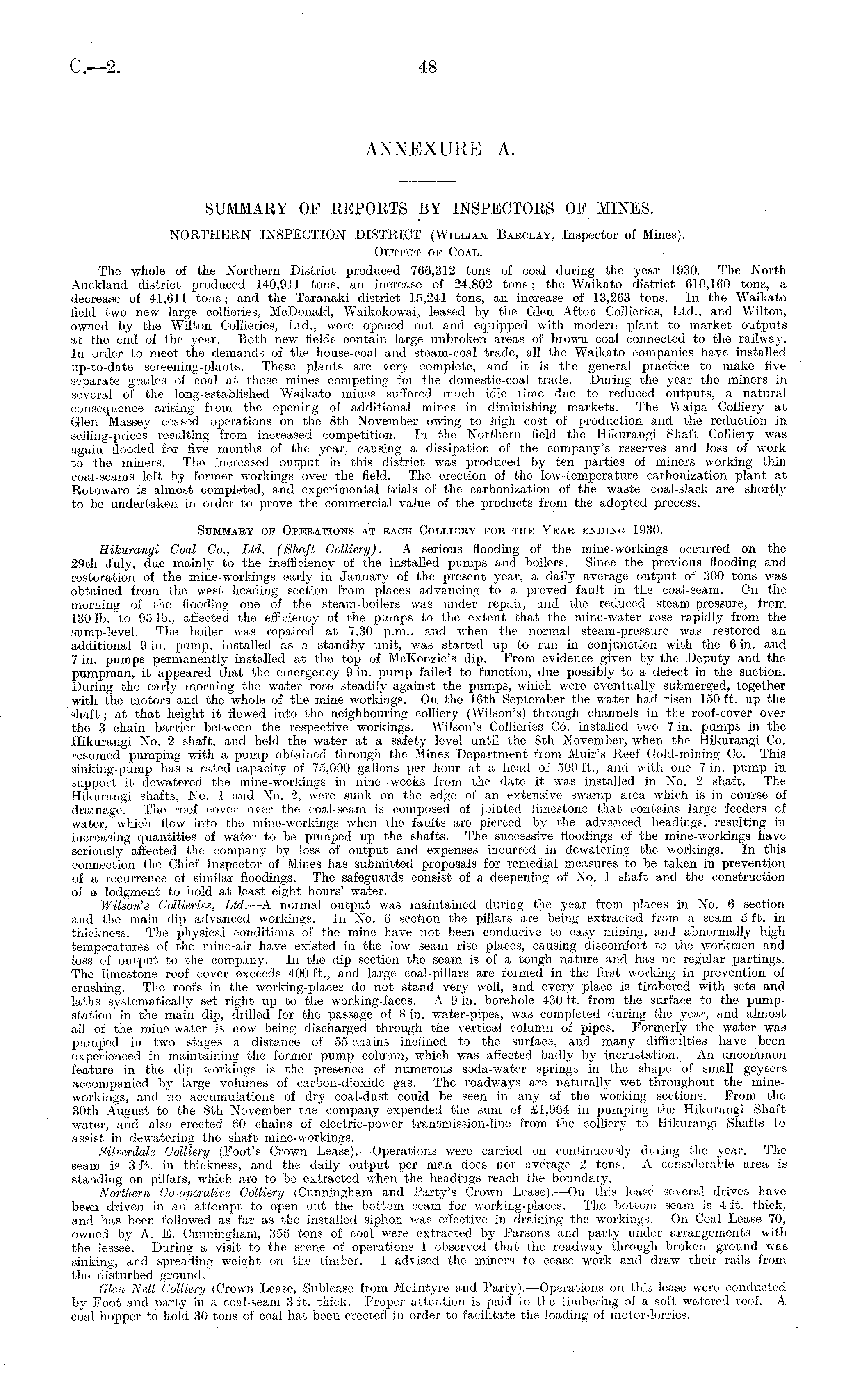 SUMMARY OF REPORTS BY INSPECTORS OF MINES. NORTHERN INSPECTION DISTRICT (William Barclay, Inspector of Mines). Output of Coal. The whole of the Northern District produced 766,312 tons of coal during the year 1930. The North Auckland district produced 140,911 tons, an increase of 24,802 tons; the Waikato district 610,160 tons, a decrease of 41,611 tons; and the Taranaki district 15,241 tons, an increase of 13,263 tons. In the Waikato field two new large collieries, McDonald, Waikokowai, leased by the Glen Afton Collieries, Ltd., and Wilton, owned by the Wilton Collieries, Ltd., were opened out and equipped with modern plant to market outputs at the end of the year. Both new fields contain large unbroken areas of brown coal connected to the railway. In order to meet the demands of the house-coal and steam-coal trade, all the Waikato companies have installed up-to-date screening-plants. These plants are very complete, and it is the general practice to make five separate grades of coal at those mines competing for the domestic-coal trade. During the year the miners in several of the long-established Waikato mines suffered much idle time due to reduced outputs, a natural consequence arising from the opening of additional mines in diminishing markets. The V aipa Colliery at Glen Massey ceased operations on the Bth November owing to high cost of production and the reduction in selling-prices resulting from increased competition. In the Northern field the Hikurangi Shaft Colliery was again flooded for five months of the year, causing a dissipation of the company's reserves and loss of work to the miners. The increased output in this district was produced by ten parties of miners working thin coal-seams left by former workings over the field. The erection of the low-temperature carbonization plant at Rotowaro is almost completed, and experimental trials of the carbonization of the waste coal-s]aek are shortly to be undertaken in order to prove the commercial value of the products from the adopted process. Summary of Operations at each Colliery for the Year ending 1930. Hikurangi Coal Co., Ltd. (Shaft Colliery). — A serious flooding of the mine-workings occurred on the 29th July, due mainly to the inefficiency of the installed pumps and boilers. Since the previous flooding and restoration of the mine-workings early in January of the present year, a daily average output of 300 tons was obtained from the west heading section from places advancing to a proved fault in the coal-seam. On the morning of the flooding one of the steam-boilers was under repair, and the reduced steam-pressure, from 130 lb. to 95 lb., affected the efficiency of the pumps to the extent that the mine-water rose rapidly from the sump-level. The boiler was repaired at 7.30 p.m., and when the normal steam-pressure was restored an additional 9 in. pump, installed as a standby unit, was started up to run in conjunction with the 6 in. and 7 in. pumps permanently installed at the top of McKenzie's dip. From evidence given by the Deputy and the pumpman, it appeared that the emergency 9 in. pump failed to function, due possibly to a defect in the suction. During the early morning the water rose steadily against the pumps, which were eventually submerged, together with the motors and the whole of the mine workings. On the 16th September the water had risen 150 ft. up the shaft; at that height it flowed into the neighbouring colliery (Wilson's) through channels in the roof-cover over the 3 chain barrier between the respective workings. Wilson's Collieries Co. installed two 7 in. pumps in the Hikurangi No. 2 shaft, and held the water at a safety level until the Bth November, when the Hikurangi Co. resumed pumping with a pump obtained through the Mines Department from Muir's Reef Gold-mining Co. This sinking-pump has a rated capacity of 75,000 gallons per hour at a head of 500 ft., and with one 7 in. pump in support it dewatered the mine-workings in nine weeks from the date it was installed in No. 2 shaft. The Hikurangi shafts, No. 1 and No. 2, were sunk on the edge of an extensive swamp area which is in course of drainage. The roof cover over the coal-seam is composed of jointed limestone that contains large feeders of water, which flow into the mine-workings when the faults are pierced by the advanced headings, resulting in increasing quantities of water to be pumped up the shafts. The successive floodings of the mine-workings have seriously affected the company bv loss of output and expenses incurred in dewatering the workings. In this connection the Chief Inspector of Mines has submitted proposals for remedial measures to be taken in prevention of a recurrence of similar floodings. The safeguards consist of a deepening of No. 1 shaft and the construction of a lodgment to hold at least eight hours' water. Wilson's Collieries, Ltd.—A normal output was maintained during the year from places in No. 6 section and the main dip advanced workings. In No. 6 section the pillars are being extracted from a seam 5 ft. in thickness. The physical conditions of the mine have not been conducive to easy mining, and abnormally high temperatures of the mine-air have existed in the low seam rise places, causing discomfort to the workmen and loss of output to the company. In the dip section the seam is of a tough nature and has no regular partings. The limestone roof cover exceeds 400 ft., and large coal-pillars are formed in the first working in prevention of crushing. The roofs in the working-places do not stand very well, and every place is timbered with sets and laths systematically set right up to the working-faces. A 9 in. borehole 430 ft. from the surface to the pumpstation in the main dip, drilled for the passage of 8 in. water-pipes, was completed during the year, and almost all of the mine-water is now being discharged through the vertical column of pipes. Formerly the water was pumped in two stages a distance of 55 chains inclined to the surf