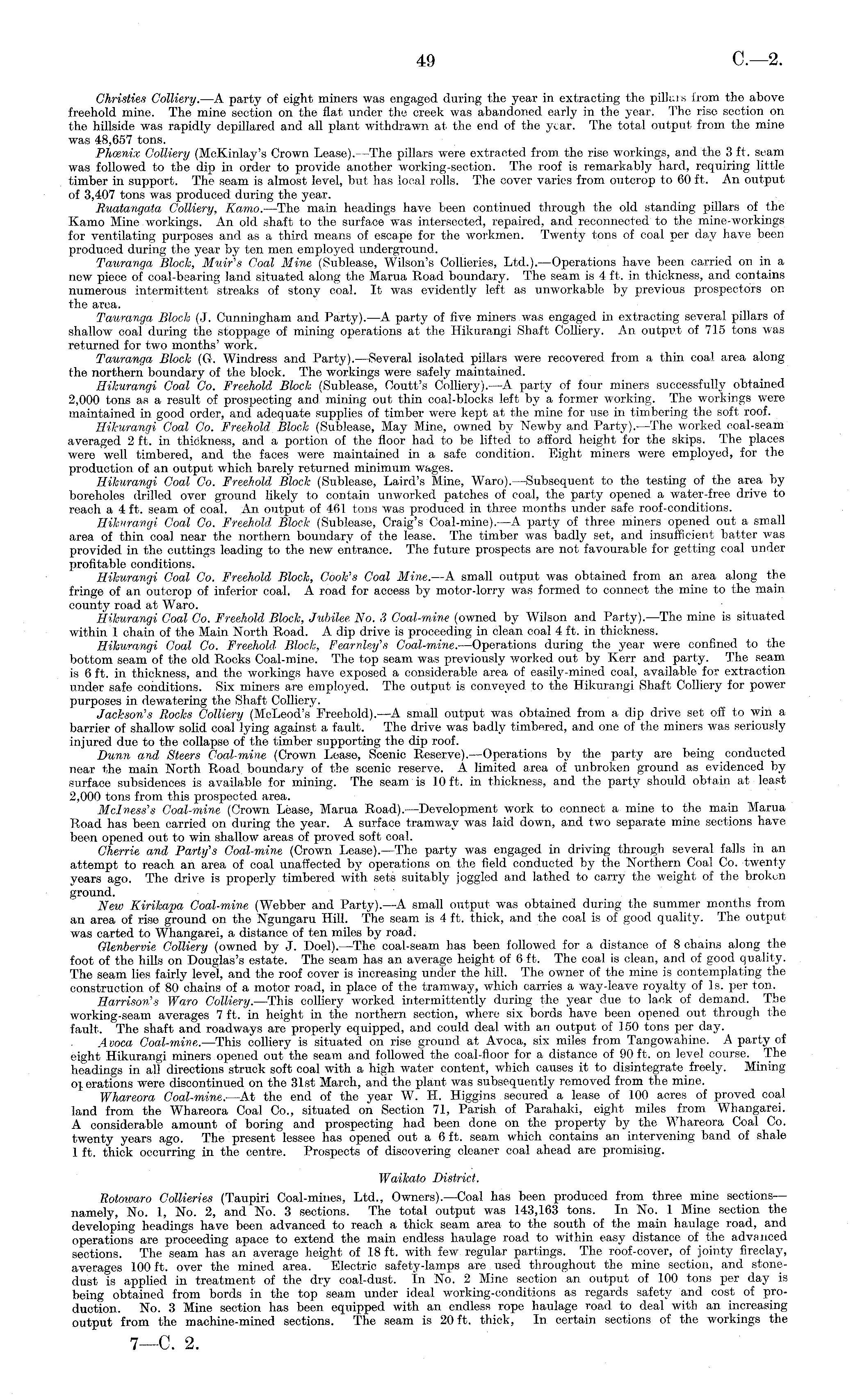 Christies Colliery.—-A party of eight miners was engaged during the year in extracting the pillars from the above freehold mine. The mine section on the flat under the creek was abandoned early in the year. The rise section on the hillside was rapidly depillared and all plant withdrawn at the end of the year. The total output from the mine was 48,657 tons. Phoenix Colliery (MeKinlay's Crown Lease). —The pillars were extracted from the rise workings, and the 3 ft. seam was followed to the dip in order to provide another working-section. The roof is remarkably hard, requiring little timber in support. The seam is almost level, but has local rolls. The cover varies from outcrop to 60 ft. An output of 3,407 tons was produced during the year. Ruatangata Colliery, Kama. —The main headings have been continued through the old standing pillars of the Kamo Mine workings. An old shaft to the surface was intersected, repaired, and reconnected to the mine-workings for ventilating purposes and as a third means of escape for the workmen. Twenty tons of coal per day have been produced during the year by ten men employed underground. Tauranga Block, Muir's Coal Mine (Sublease, Wilson's Collieries, Ltd.). —Operations have been carried on in a new piece of coal-bearing land situated along the Marua Road boundary. The seam is 4 ft. in thickness, and contains numerous intermittent streaks of stony coal. It was evidently left as unworkable by previous prospectors on the area. Tauranga Block (J. Cunningham and Party).—A party of five miners was engaged in extracting several pillars of shallow coal during the stoppage of mining operations at the Hikurangi Shaft Colliery. An output of 715 tons was returned for two months' work. Tauranga Block (G. Windress and Party).—Several isolated pillars were recovered from a thin coal area along the northern boundary of the block. The workings were safely maintained. Hikurangi Coal Co. Freehold Block (Sublease, Coutt's Colliery).—A party of four miners successfully obtained 2,000 tons as a result of prospecting and mining out thin coal-blocks left by a former working. The workings were maintained in good order, and adequate supplies of timber were kept at the mine for use in timbering the soft roof. Hikurangi Coal Co. Freehold Block (Sublease, May Mine, owned by Newby and Party).—The worked coal-seam averaged 2 ft. in thickness, and a portion of the floor had to be lifted to afford height for the skips. The places were well timbered, and the faces were maintained in a safe condition. Eight miners were employed, for the production of an output which barely returned minimum wages. Hikurangi Coal Co. Freehold Block (Sublease, Laird's Mine, Waro). —Subsequent to the testing of the area by boreholes drilled over ground likely to contain unworked patches of coal, the party opened a water-free drive to reach a 4 ft. seam of coal. An output of 461 tons was produced in three months under safe roof-conditions. Hikurangi Coal Co. Freehold Block (Sublease, Craig's Coal-mine). —A party of three miners opened out a small area of thin coal near the northern boundary of the lease. The timber was badly set, and insufficient batter was provided in the cuttings leading to the new entrance. The future prospects are not favourable for getting coal under profitable conditions. Hikurangi Coal Co. Freehold Block, Cook's Coal Mine. —A small output was obtained from an area along the fringe of an outcrop of inferior coal. A road for access by motor-lorry was formed to connect the mine to the main county road at Waro. Hikurangi Coal Co. Freehold Block, Jubilee. No. 3 Coal-mine (owned by Wilson and Party).—The mine is situated within 1 chain of the Main North Road. A dip drive is proceeding in clean coal 4 ft. in thickness. Hikurangi Coal Co. Freehold Block, Fearnley's Coal-mine. —Operations during the year were confined to the bottom seam of the old Rocks Coal-mine. The top seam was previously worked out by Kerr and party. The seam is 6 ft. in thickness, and the workings have exposed a considerable area of easity-mined coal, available for extraction under safe conditions. Six miners are employed. The output is conveyed to the Hikurangi Shaft Colliery for power purposes in dewatering the Shaft Colliery. Jackson's Roclcs Colliery (McLeod's Freehold). —A small output was obtained from a dip drive set off to win a barrier of shallow solid coal lying against a fault. The drive was badly timbered, and one of the miners was seriously injured due to the collapse of the timber supporting the dip roof. Dunn and Steers Coal-mine (Crown Lease, Scenic Reserve). —Operations by the party are being conducted near the main North Road boundary of the scenic reserve. A limited area of unbroken ground as evidenced by surface subsidences is available for mining. The seam is 10 ft. in thickness, and the party should obtain at least 2,000 tons from this prospected area. Mclness's Coal-mine (Crown Lease, Marua Road). —Development work to connect a mine to the main Marua Road has been carried on during the year. A surface tramway was laid down, and two separate mine sections have been opened out to win shallow areas of proved soft coal. Cherrie and Party's Coal-mine (Crown Lease). —The party was engaged in driving through several falls in an attempt to reach an area of coal unaffected by operations on the field conducted by the Northern Coal Co. twenty years ago. The drive is properly timbered with sets suitably joggled and lathed to carry the weight of the broken ground. New Kirikapa Coal-mine (Webber and Party).—A small output was obtained during the summer months from an area of rise ground on the Ngungaru Hill. The seam is 4 ft. thick, and the coal is of good quality. The output was carted to Whangarei, a distance of ten miles by road. Olenbervie Colliery (owned by J. Doel). —The coal-seam has been followed for a distance of 8 chains along the foot of the hills on Douglas's estate. T