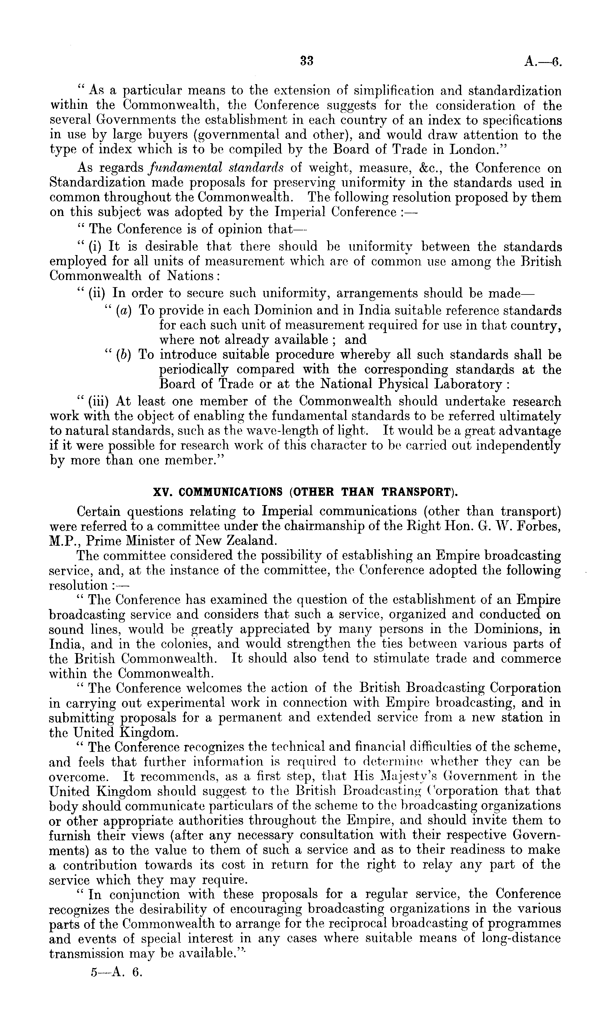 " As a particular means to the extension of simplification and standardization within the Commonwealth, the Conference suggests for the consideration of the several Governments the establishment in each country of an index to specifications in use by large buyers (governmental and other), and would draw attention to the type of index which is to be compiled by the Board of Trade in London." As regards fundamental standards of weight, measure, &c, the Conference on Standardization made proposals for preserving uniformity in the standards used in common throughout the Commonwealth. The following resolution proposed by them on this subject was adopted by the Imperial Conference : — " The Conference is of opinion that — " (i) It is desirable that there should be uniformity between the standards employed for all units of measurement which are of common use among the British Commonwealth of Nations: " (ii) In order to secure such uniformity, arrangements should be made— " (a) To provide in each Dominion and in India suitable reference standards for each such unit of measurement required for use in that country, where not already available ; and " (b) To introduce suitable procedure whereby all such standards shall be periodically compared with the corresponding standards at the Board of Trade or at the National Physical Laboratory : " (iii) At least one member of the Commonwealth should undertake research work with the object of enabling the fundamental standards to be referred ultimately to natural standards, such as the wave-length of light. It would be a great advantage if it were possible for research work of this character to be carried out independently by more than one member." XV. COMMUNICATIONS (OTHER THAN TRANSPORT). Certain questions relating to Imperial communications (other than transport) were referred to a committee under the chairmanship of the Right Hon. G. W. Forbes, M.P., Prime Minister of New Zealand. The committee considered the possibility of establishing an Empire broadcasting service, and, at the instance of the committee, the Conference adopted the following resolution : — " The Conference has examined the question of the establishment of an Empire broadcasting service and considers that such a service, organized and conducted on sound lines, would be greatly appreciated by many persons in the Dominions, in India, and in the colonies, and would strengthen the ties between various parts of the British Commonwealth. It should also tend to stimulate trade and commerce within the Commonwealth. " The Conference welcomes the action of the British Broadcasting Corporation in carrying out experimental work in connection with Empire broadcasting, and in submitting proposals for a permanent and extended service from a new station in the United Kingdom. " The Conference recognizes the technical and financial difficulties of the scheme, and feels that further information is required to determine whether they can be overcome. It recommends, as a first step, that His Majesty's Government in the United Kingdom should suggest to the British Broadcasting Corporation that that body should communicate particulars of the scheme to the broadcasting organizations or other appropriate authorities throughout the Empire, and should invite them to furnish their views (after any necessary consultation with their respective Governments) as to the value to them of such a service and as to their readiness to make a contribution towards its cost in return for the right to relay any part of the service which they may require. " In conjunction with these proposals for a regular service, the Conference recognizes the desirability of encouraging broadcasting organizations in the various parts of the Commonwealth to arrange for the reciprocal broadcasting of programmes and events of special interest in any cases where suitable means of long-distance transmission may be available."'