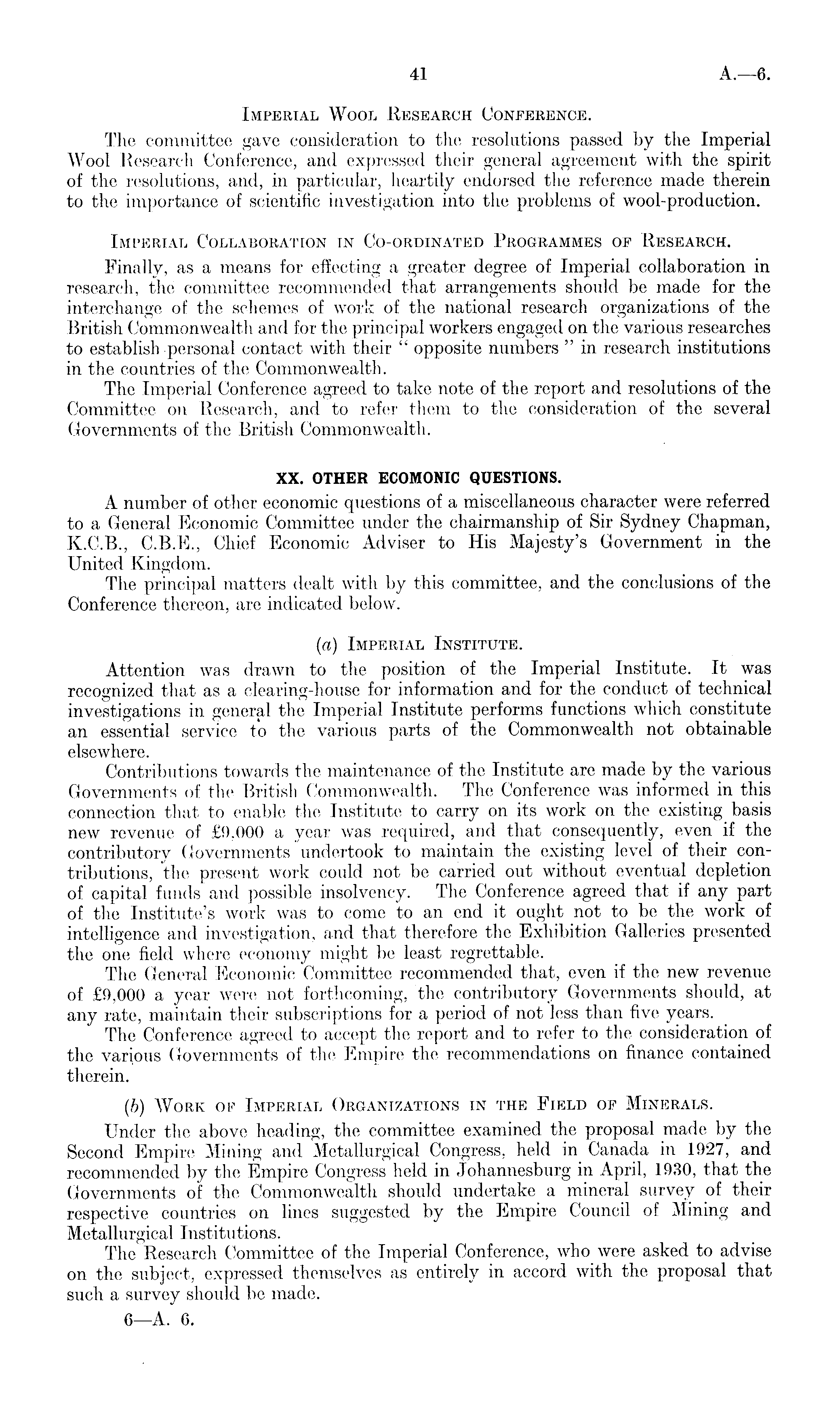 Imperial Wool Research Conference. The committee gave consideration to the resolutions passed by the Imperial Wool Research Conference, and expressed their general agreement with the spirit of the resolutions, and, in particular, heartily endorsed the reference made therein to the importance of scientific investigation into the problems of wool-production. Imperial Collaboration in Co-ordinated Programmes of Research. Finally, as a means for effecting a greater degree of Imperial collaboration in research, the committee recommended that arrangements should be made for the interchange of the schemes of work of the national research organizations of the British ('ommonwealth and for the principal workers engaged on the various researches to establish personal contact with their " opposite numbers " in research institutions in the countries of the Commonwealth. The Imperial Conference agreed to take note of the report and resolutions of the Committee on Research, and to refer them to the consideration of the several Governments of the British Commonwealth. XX. OTHER ECOMONIC QUESTIONS. A number of other economic questions of a miscellaneous character were referred to a General Economic Committee under the chairmanship of Sir Sydney Chapman, K.C.8., C.8.E., Chief Economic Adviser to His Majesty's Government in the United Kingdom. The principal matters dealt with by this committee, and the conclusions of the Conference thereon, are indicated below. (a) Imperial Institute. Attention was drawn to the position of the Imperial Institute. It was recognized that as a clearing-house for information and for the conduct of technical investigations in general the Imperial Institute performs functions which constitute an essential service to the various parts of the Commonwealth not obtainable elsewhere. Contributions towards the maintenance of the Institute are made by the various Governments of the British Commonwealth. The Conference was informed in this connection that to enable the Institute to carry on its work on the existing basis new revenue of £9,000 a year was required, and that consequently, even if the contributory Governments undertook to maintain the existing level of their contributions, the present work could not be carried out without eventual depletion of capital funds and possible insolvency. The Conference agreed that if any part of the [nstitute's work was to come to an end it ought not to be the work of intelligence and investigation, and that therefore the Exhibition Galleries presented the one field where economy might be least regrettable. The General Economic Committee recommended that, even if the new revenue of £9,000 a year were not forthcoming, the contributory Governments should, at any rate, maintain their subscriptions for a period of not less than five years. The Conference agreed to accept the report and to refer to the consideration of the various Governments of the Empire the recommendations on finance contained therein. (b) Work of Imperial Organizations in the Field of Minerals. Under the above heading, the committee examined the proposal made by the Second Empire .Mining and Metallurgical Congress, held in Canada in 1927, and recommended by the Empire Congress held in Johannesburg in April, 1930, that the Governments of the Commonwealth should undertake a mineral survey of their respective countries on lines suggested by the Empire Council of Mining and Metallurgical Institutions. The Research Committee of the Imperial Conference, who were asked to advise on the subject, expressed themselves as entirely in accord with the proposal that such a survey should be made.