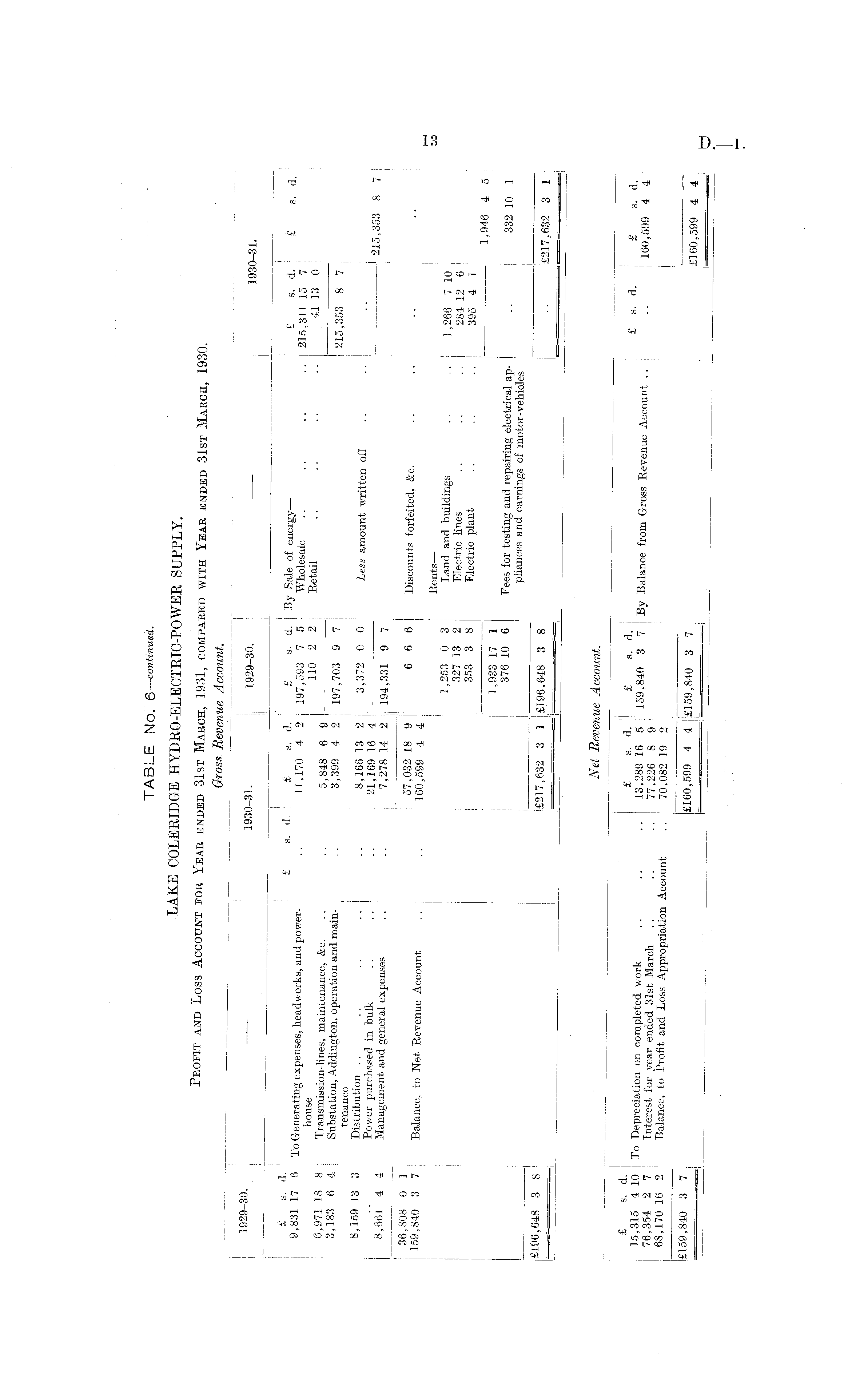 TABLE No. 6— continued. LAKE COLERIDGE HYDRO-ELECTRIC-POWER SUPPLY. Profit and Loss Account for Year ended 31st March, 1931, compared with Year ended 31st March, 1930.