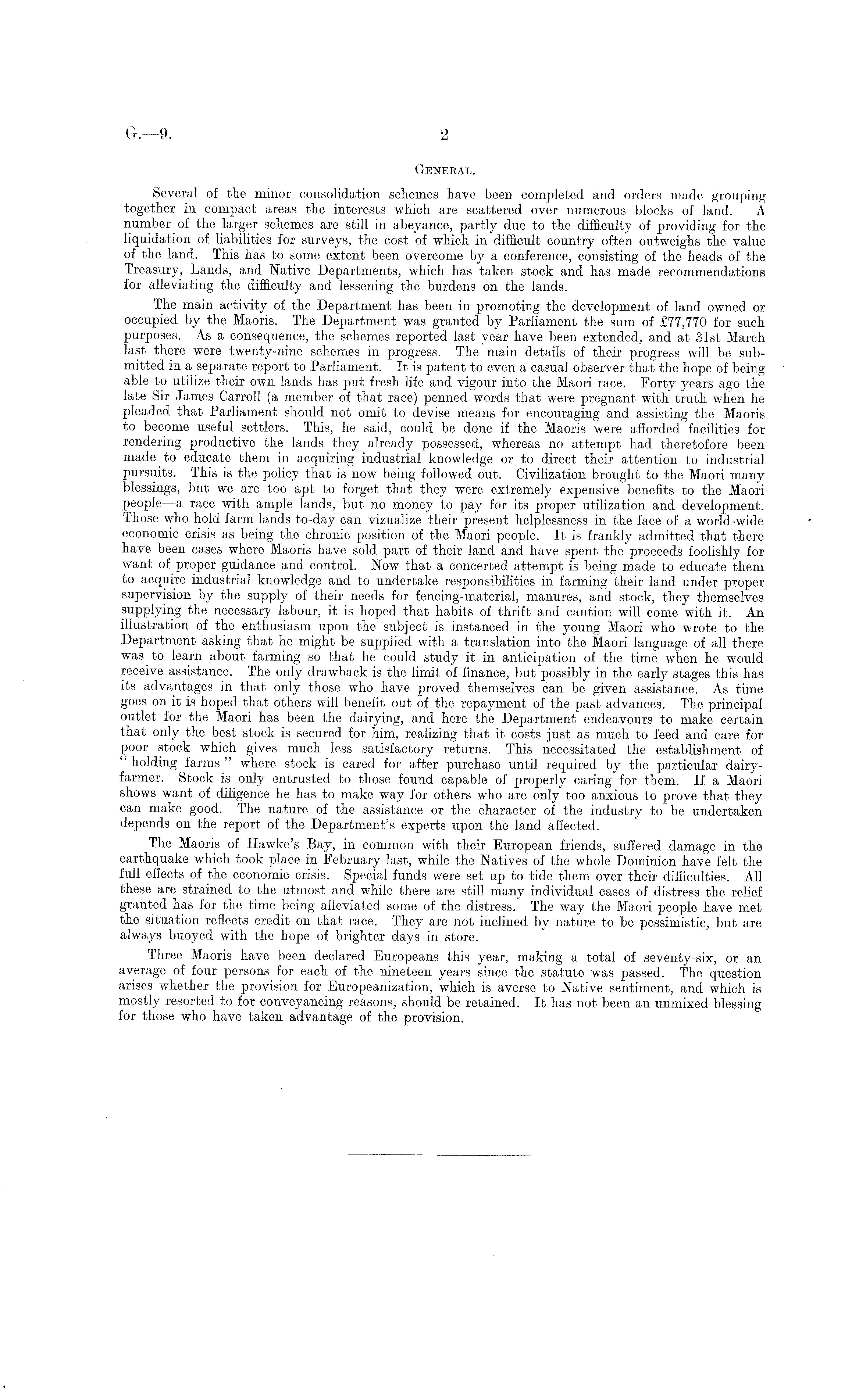General. Several of the minor consolidation schemes have been completed and orders made grouping together in compact areas the interests which are scattered over numerous blocks of land. A number of the larger schemes are still in abeyance, partly due to the difficulty of providing for the liquidation of liabilities for surveys, the cost of which in difficult country often outweighs the value of the land. This has to some extent been overcome by a conference, consisting of the heads of the Treasury, Lands, and Native Departments, which has taken stock and has made recommendations for alleviating the difficulty and lessening the burdens on the lands. The main activity of the Department has been in promoting the development of land owned or occupied by the Maoris. The Department was granted by Parliament the sum of £77,770 for such purposes. As a consequence, the schemes reported last year have been extended, and at 31st March last there were twenty-nine schemes in progress. The main details of their progress will be submitted in a separate report to Parliament. It is patent to even a casual observer that the hope of being able to utilize their own lands has put fresh life and vigour into the Maori race. Forty years ago the late Sir James Carroll (a member of that race) penned words that were pregnant with truth when he pleaded that Parliament should not omit to devise means for encouraging and assisting the Maoris to become useful settlers. This, he said, could be done if the Maoris were afforded facilities for rendering productive the lands they already possessed, whereas no attempt had theretofore been made to educate them in acquiring industrial knowledge or to direct their attention to industrial pursuits. This is the policy that is now being followed out. Civilization brought to the Maori many blessings, but we are too apt to forget that they were extremely expensive benefits to the Maori people —a race with ample lands, but no money to pay for its proper utilization and development. Those who hold farm lands to-day can vizualize their present helplessness in the face of a world-wide • economic crisis as being the chronic position of the Maori people. It is frankly admitted that there have been cases where Maoris have sold part of their land and have spent the proceeds foolishly for want of proper guidance and control. Now that a concerted attempt is being made to educate them to acquire industrial knowledge and to undertake responsibilities in farming their land under proper supervision by the supply of their needs for fencing-material, manures, and stock, they themselves supplying the necessary labour, it is hoped that habits of thrift and caution will come with it. An illustration of the enthusiasm upon the subject is instanced in the young Maori who wrote to the Department asking that he might be supplied with a translation into the Maori language of all there was to learn about farming so that he could study it in anticipation of the time when he would receive assistance. The only drawback is the limit of finance, but possibly in the early stages this has its advantages in that only those who have proved themselves can be given assistance. As time goes on it is hoped that others will benefit out of the repayment of the past advances. The principal outlet for the Maori has been the dairying, and here the Department endeavours to make certain that only the best stock is secured for him, realizing that it costs just as much to feed and care for poor stock which gives much less satisfactory returns. This necessitated the establishment of " holding farms " where stock is cared for after purchase until required by the particular dairyfarmer. Stock is only entrusted to those found, capable of properly caring for them. If a Maori shows want of diligence he has to make way for others who are only too anxious to prove that they can make good. The nature of the assistance or the character of the industry to be undertaken depends on the report of the Department's experts upon the land affected. The Maoris of Hawke's Bay, in common with their European friends, suffered damage in the earthquake which took place in February last, while the Natives of the whole Dominion have felt the full effects of the economic crisis. Special funds were set up to tide them over their difficulties. All these are strained to the utmost and while there are still many individual cases of distress the relief granted has for the time being alleviated some of the distress. The way the Maori people have met the situation reflects credit on that race. They are not inclined by nature to be pessimistic, but are always buoyed with the hope of brighter days in store. Three Maoris have been declared Europeans this year, making a total of seventy-six, or an average of four persons for each of the nineteen years since the statute was passed. The question arises whether the provision for Europeanization, which is averse to Native sentiment, and which is mostly resorted to for conveyancing reasons, should be retained. It has not been an unmixed blessing for those who have taken advantage of the provision.