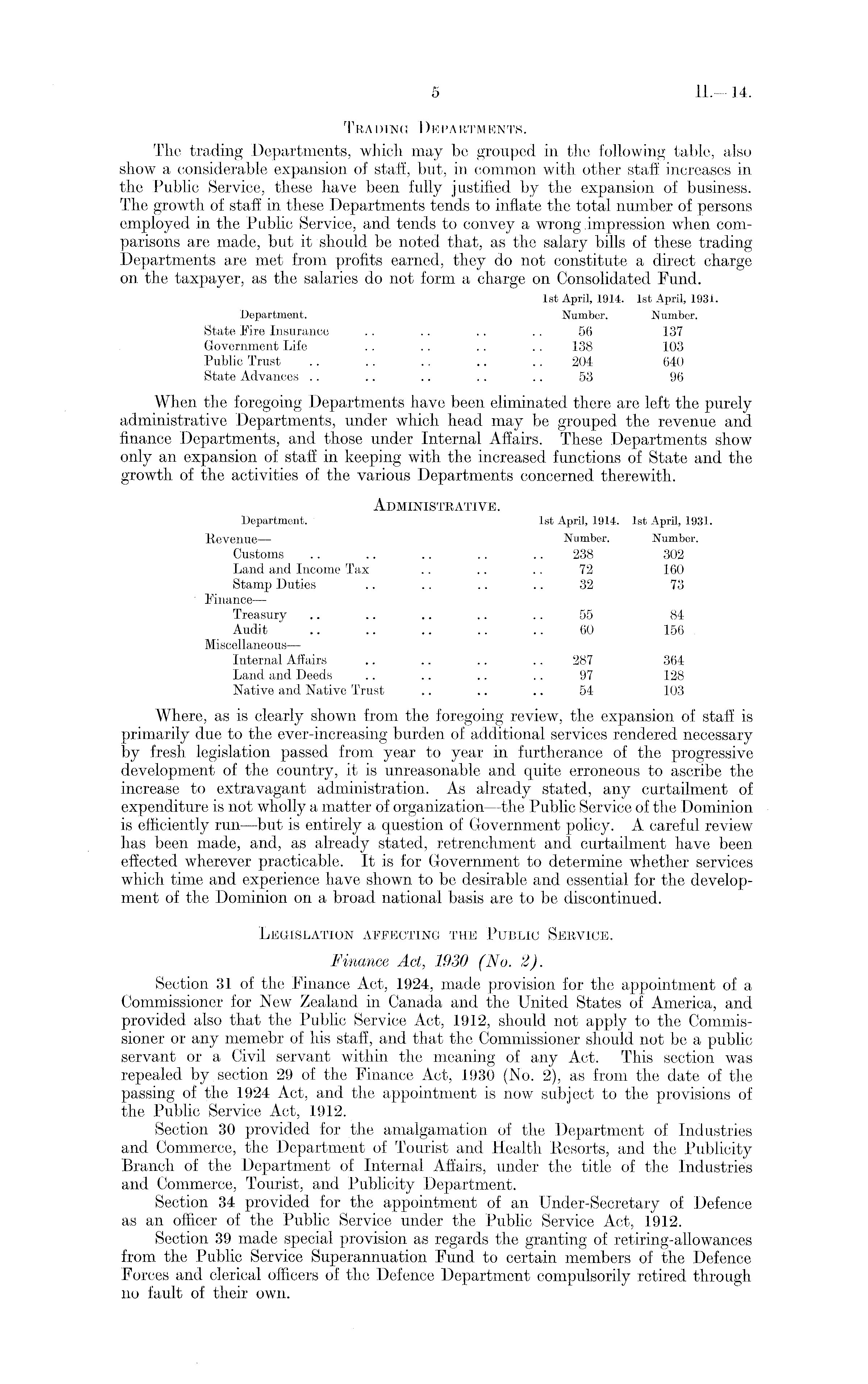 Trading Departments. The trading Departments, which may be grouped in the following table, also show a considerable expansion of staff, but, in common with other staff increases in the Public Service, these have been fully justified by the expansion of business. The growth of staff in these Departments tends to inflate the total number of persons employed in the Public Service, and tends to convey a wrong impression when comparisons are made, but it should be noted that, as the salary bills of these trading Departments are met from profits earned, they do not constitute a direct charge on the taxpayer, as the salaries do not form a charge on Consolidated Fund. Ist April, 1914. Ist April, 1931. Department. Number. Number. State Fire Insurance .. .. .. .. 56 137 Government Life .. .. .. .. 138 103 Public Trust .. .. .. .. .. 204 640 State Advances .. .. .. .. .. 53 96 When the foregoing Departments have been eliminated there are left the purely administrative Departments, under which head may be grouped the revenue and finance Departments, and those under Internal Affairs. These Departments show only an expansion of staff in keeping with the increased functions of State and the growth of the activities of the various Departments concerned therewith. Administrative . Department. Ist April, 1914. Ist April, 1931. Revenue— Number. Number. Customs .. .. .. .. .. 238 302 Land and Income Tax .. .. .. 72 160 Stamp Duties .. .. .. .. 32 73 Finance— Treasury .. .. .. .. .. 55 84 Audit .. .. .. .. .. 60 156 Miscellaneous — Internal Affairs .. .. .. .. 287 364 Land and Deeds .. .. .. .. 97 128 Native and Native Trust .. .. .. 54 103 Where, as is clearly shown from the foregoing review, the expansion of staff is primarily due to the ever-increasing burden of additional services rendered necessary by fresh legislation passed from year to year in furtherance of the progressive development of the country, it is unreasonable and quite erroneous to ascribe the increase to extravagant administration. As already stated, any curtailment of expenditure is not wholly a matter of organization—the Public Service of the Dominion is efficiently run —but is entirely a question of Government policy. A careful review has been made, and, as already stated, retrenchment and curtailment have been effected wherever practicable. It is for Government to determine whether services which time and experience have shown to be desirable and essential for the development of the Dominion on a broad national basis are to be discontinued. Legislation affecting the Public Service. Finance Act, 1930 (No. 2). Section 31 of the Finance Act, 1924, made provision for the appointment of a Commissioner for New Zealand in Canada and the United States of America, and provided also that the Public Service Act, 1912, should not apply to the Commissioner or any memebr of his staff, and that the Commissioner should not be a public servant or a Civil servant within the meaning of any Act. This section was repealed by section 29 of the Finance Act, 1930 (No. 2), as from the date of the passing of the 1924 Act, and the appointment is now subject to the provisions of the Public Service Act, 1912. Section 30 provided for the amalgamation of the Department of Industries and Commerce, the Department of Tourist and Health Resorts, and the Publicity Branch of the Department of Internal Affairs, under the title of the Industries and Commerce, Tourist, and Publicity Department. Section 34 provided for the appointment of an Under-Secretary of Defence as an officer of the Public Service under the Public Service Act, 1912. Section 39 made special provision as regards the granting of retiring-allowances from the Public Service Superannuation Fund to certain members of the Defence Forces and clerical officers of the Defence Department compulsorily retired through no fault of their own.