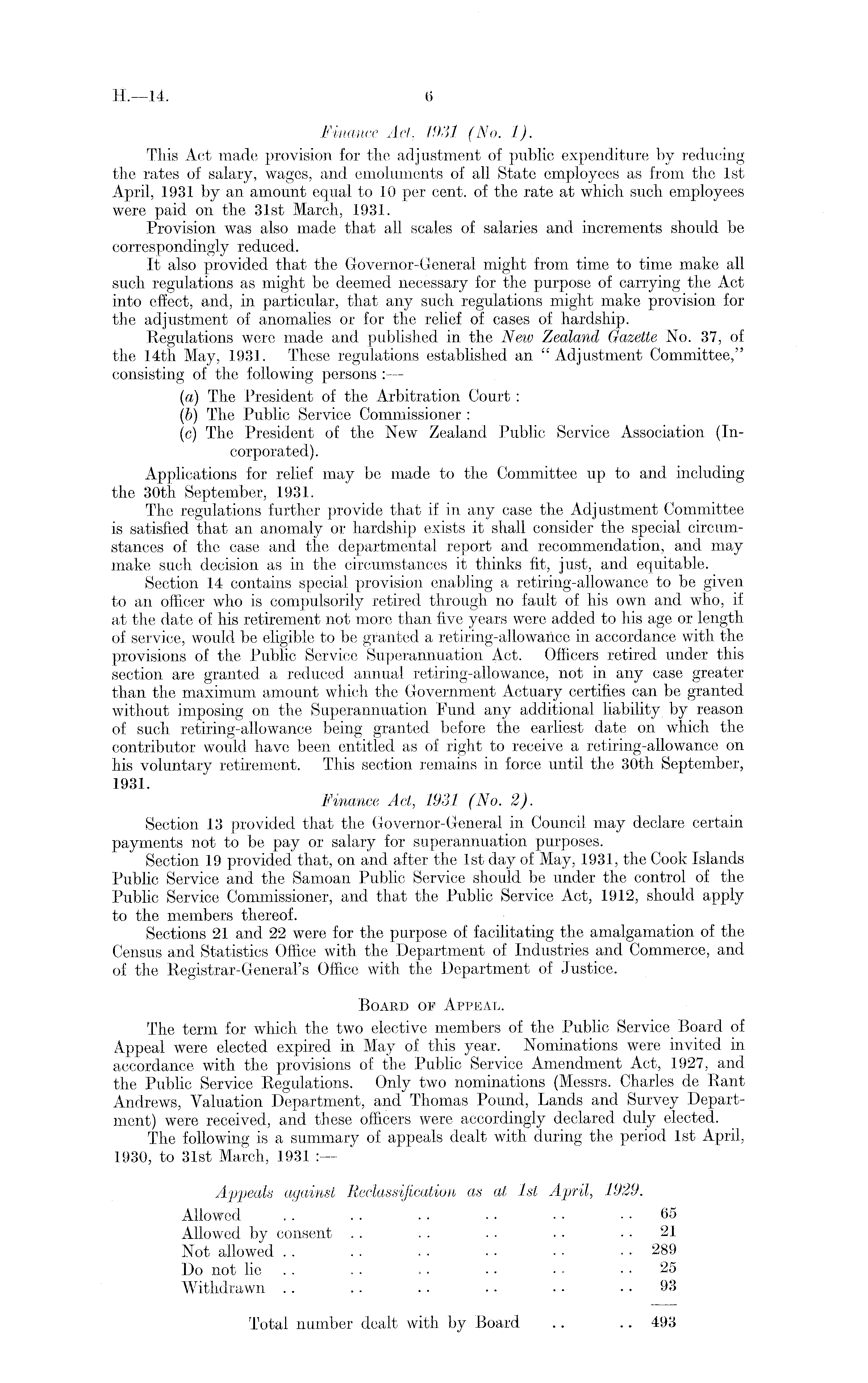 Finance Act, 1931 (No. 1). This Act made provision for the adjustment of public expenditure by reducing the rates of salary, wages, and emoluments of all State employees as from the Ist April, 1931 by an amount equal to 10 per cent, of the rate at which such employees were paid on the 31st March, 1931. Provision was also made that all scales of salaries and increments should be correspondingly reduced. It also provided that the Governor-General might from time to time make all such regulations as might be deemed necessary for the purpose of carrying the Act into effect, and, in particular, that any such regulations might make provision for the adjustment of anomalies or for the relief of cases of hardship. Regulations were made and published in the New Zealand Gazette No. 37, of the 14th May, 1931. These regulations established an " Adjustment Committee," consisting of the following persons (a) The President of the Arbitration Court : (b) The Public Service Commissioner : (c) The President of the New Zealand Public Service Association (Incorporated). Applications for relief may be made to the Committee up to and including the 30th September, 1931. The regulations further provide that if in any case the Adjustment Committee is satisfied that an anomaly or hardship exists it shall consider the special circumstances of the case and the departmental report and recommendation, and may make such decision as in the circumstances it thinks fit, just, and equitable. Section 14 contains special provision enabling a retiring-allowance to be given to an officer who is compulsorily retired through no fault of his own and who, if at the date of his retirement not more than five years were added to his age or length of service, would be eligible to be granted a retiring-allowance in accordance with the provisions of the Public Service Superannuation Act. Officers retired under this section are granted a reduced annual retiring-allowance, not in any case greater than the maximum amount which the Government Actuary certifies can be granted without imposing on the Superannuation Fund any additional liability by reason of such retiring-allowance being granted before the earliest date on which the contributor would have been entitled as of right to receive a retiring-allowance on his voluntary retirement. This section remains in force until the 30th September, 1931. Finance Act, 1931 (No. 2). Section 13 provided that the Governor-General in Council may declare certain payments not to be pay or salary for superannuation purposes. Section 19 provided that, on and after the Ist day of May, 1931, the Cook Islands Public Service and the Samoan Public Service should be under the control of the Public Service' Commissioner, and that the Public Service Act, 1912, should apply to the members thereof. Sections 21 and 22 were for the purpose of facilitating the amalgamation of the Census and Statistics Office with the Department of Industries and Commerce, and of the Registrar-General's Office with the Department of Justice. Board of Appeal. The term for which the two elective members of the Public Service Board of Appeal were elected expired in May of this year. Nominations were invited in accordance with the provisions of the Public Service Amendment Act, 1927, and the Public Service Regulations. Only two nominations (Messrs. Charles de Rant Andrews, Valuation Department, and Thomas Pound, Lands and Survey Department) were received, and these officers were accordingly declared duly elected. The following is a summary of appeals dealt with during the period Ist April, 1930, to 31st March, 1931 : — Appeals against Reclassification as at Ist April, 1929. Allowed .. . . . • • • • • 65 Allowed by consent . . . . • ■ ■ • 21 Not allowed . . . . . . • • • ■ • • 289 Do not lie . . . ■ ■ • • • 25 Withdrawn . . . . . . . • • • 93 Total number dealt with by Board .. .. 493