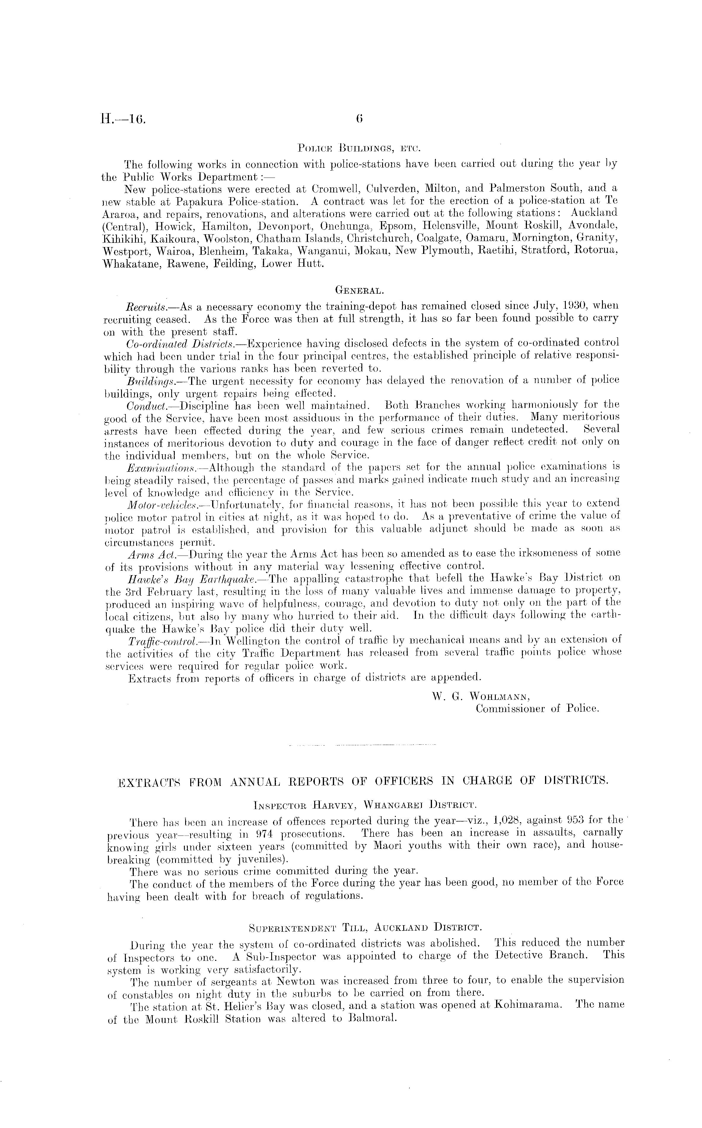 Police Buildings, etc. The following works in connection with police-stations have been carried out during the year by the Public Works Department: — New police-stations were erected at Cromwell, Culverden, Milton, and Palmerston South, and a new stable at Papakura Police-station. A contract was let for the erection of a police-station at Te Araroa, and repairs, renovations, and alterations were carried out at the following stations: Auckland (Central), Howick, Hamilton, Devonport, Onehunga, Epsom, Helensville, Mount Roskill, Avondale, Kihikihi, Kaikoura, Woolston, Chatham Islands, Christchurch, Coalgate, Oamaru, Mornington, Granity, Westport, Wairoa, Blenheim, Takaka, Wanganui, Mokau, New Plymouth, Raetihi, Stratford, Rotorua, Whakatane, Rawene, Feilding, Lower Hutt. General. Recruits. —As a necessary economy the training-depot has remained closed since July, 1930, when recruiting ceased. As the Force was then at full strength, it has so far been found possible to carry on with the present staff. Co-ordinated Districts. —Experience having disclosed defects in the system of co-ordinated control which had been under trial in the four principal centres, the established principle of relative responsibility through the various ranks has been reverted to. Buildings. —The urgent necessity for economy has delayed the renovation of a number of police buildings, only urgent repairs being effected. Conduct. —Discipline has been well maintained. Both Branches working harmoniously for the good of the Service, have been most assiduous in the performance of their duties. Many meritorious arrests have been effected during the year, and few serious crimes remain undetected. Several instances of meritorious devotion to duty and courage in the face of danger reflect credit not only on the individual members, but on the whole Service. Examinations. —Although the standard of the papers set for the annual police examinations is being steadily raised, the percentage of passes and marks gained indicate much study and an increasing level of knowledge and efficiency in the Service. Motor-vehicles. —Unfortunately, for financial reasons, it has not been possible this year to extend police motor patrol in cities at night, as it was hoped to do. As a preventative of crime the value of motor patrol is established, and provision for this valuable adjunct should be made as soon as circumstances permit. Arms Act.—During the yeaj the Arms Act has been so amended as to ease the irksomeness of some of its provisions without in a.ny material way lessening effective control. Hawke's Bay Earthquake. —The appalling catastrophe that befell the Hawke's Bay District on the 3rd February last, resulting in the loss of many valuable lives and immense damage to property, produced an inspiring wave of helpfulness, courage, and devotion to duty not only on the part of the local citizens, but also by many who hurried to their aid. In the difficult days following the earthquake the Hawke's Bay police did their duty well. Traffic-control. —In Wellington the control of traffic by mechanical means and by an extension of the activities of the city Traffic Department has released from several traffic points police whose services were required for regular police work. Extracts from reports of officers in charge of districts are appended. W. G. Wohlmann, Commissioner of Police.