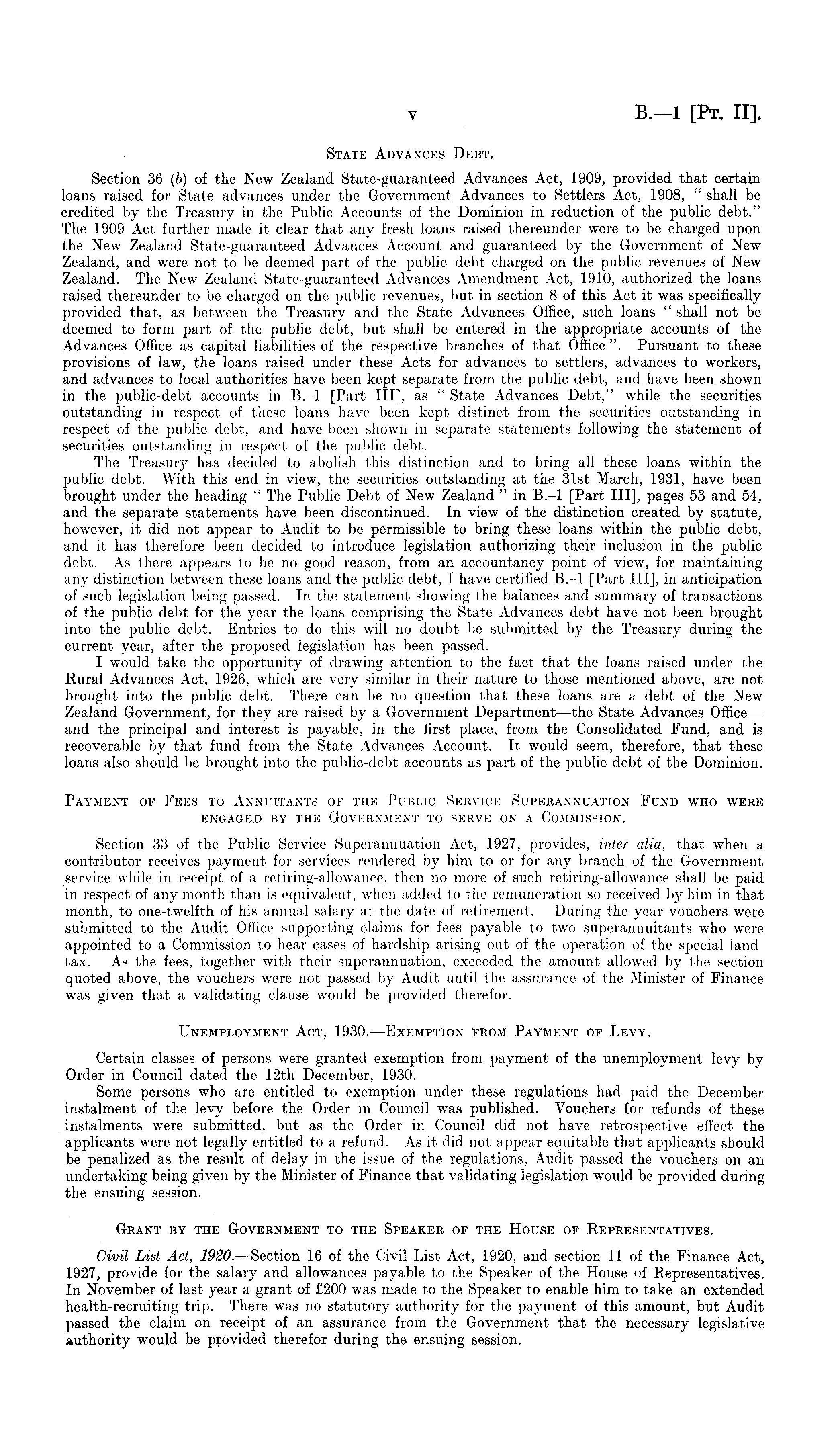 State Advances Debt. Section 36 (b) of the New Zealand State-guaranteed Advances Act, 1909, provided that certain loans raised for State advances under the Government Advances to Settlers Act, 1908, "shall be credited by the Treasury in the Public Accounts of the Dominion in reduction of the public debt.'' The 1909 Act further made it clear that any fresh loans raised thereunder were to be charged upon the New Zealand State-guaranteed Advances Account and guaranteed by the Government of New Zealand, and were not to be deemed part of the public debt charged on the public revenues of New Zealand. The New Zealand State-guaranteed Advances Amendment Act, 11)10, authorized the loans raised thereunder to be charged on the public revenues, but in section 8 of this Act it was specifically provided that, as between the Treasury and the State Advances Office, such loans " shall not be deemed to form part of the public debt, but shall be entered in the appropriate accounts of the Advances Office as capital liabilities of the respective branches of that Office". Pursuant to these provisions of law, the loans raised under these Acts for advances to settlers, advances to workers, and advances to local authorities have been kept separate from the public debt, and have been shown in the public-debt accounts in 8.-l [Part lII], as " State Advances Debt," while the securities outstanding in respect of these loans have been kept distinct from the securities outstanding in respect of the public debt, and have been shown in separate statements following the statement of securities outstanding in respect of the public debt. The Treasury has decided to abolish this distinction and to bring all these loans within the public debt. With this end in view, the securities outstanding at the 31st March, 1931, have been brought under the heading " The Public Debt of New Zealand " in 8.-l [Part lII], pages 53 and 54, and the separate statements have been discontinued. In view of the distinction created by statute, however, it did not appear to Audit to be permissible to bring these loans within the public debt, and it has therefore been decided to introduce legislation authorizing their inclusion in the public debt. As there appears to be no good reason, from an accountancy point of view, for maintaining any distinction between these loans and the public debt, I have certified 8.-l [Part lII], in anticipation of such legislation being passed. In the statement showing the balances and summary of transactions of the public debt for the year the loans comprising the State Advances debt have not been brought into the public debt. Entries to do this will no doubt be submitted by the Treasury during the current year, after the proposed legislation has been passed. I would take the opportunity of drawing attention to the fact that the loans raised under the Rural Advances Act, 1926, which are very similar in their nature to those mentioned above, are not brought into the public debt. There can be no question that these loans are a debt of the New Zealand Government, for they are raised by a Government Department —the State Advances Office— and the principal and interest is payable, in the first place, from the Consolidated Fund, and is recoverable by that fund from the State Advances Account. It would seem, therefore, that these loans also should be brought into the public-debt accounts as part of the public debt of the Dominion. Payment of Fees to Annuitants of the Public Service Superannuation Fund who were engaged by the government to serve on a commission. Section 33 of the Public Service Superannuation Act, 1927, provides, inter alia, that when a contributor receives payment for services rendered by him to or for any branch of the Government service while in receipt of a retiring-allowance, then do more <>f such retiring-allowance shall be paid in respect of any month than is equivalent, when added to the remuneration so received by him in that month, to one-twelfth of his annual salary at the date of retirement. During the year vouchers were submitted to the Audit Office supporting claims for fees payable to two superannuitants who were appointed to a Commission to hear cases of hardship arising out of the operation of the special land tax. As the fees, together with their superannuation, exceeded the amount allowed by the section quoted above, the vouchers were not passed by Audit until the assurance of the Minister of Finance was given that a validating clause would be provided therefor. Unemployment Act, 1930.—Exemption from Payment of Levy. Certain classes of persons were granted exemption from payment of the unemployment levy by Order in Council dated the 12th December, 1930. Some persons who are entitled to exemption under these regulations had paid the December instalment of the levy before the Order in Council was published. Vouchers for refunds of these instalments were submitted, but as the Order in Council did not have retrospective effect the applicants were not legally entitled to a refund. As it did not appear equitable that applicants should be penalized as the result of delay in the issue of the regulations, Audit passed the vouchers on an undertaking being given by the Minister of Finance that validating legislation would be provided during the ensuing session. Grant by the Government to the Speaker of the House of Representatives. Civil List Act, 1920. —Section 16 of the Civil List Act, 1920, and section 11 of the Finance Act, 1927, provide for the salary and allowances payable to the Speaker of the House of Representatives. In November of last year a grant of £200 was made to the Speaker to enable him to take an extended health-recruiting trip. There was no statutory authority for the payment of this amount, but Audit passed the claim on receipt of an assurance from the Government that the necessary legislative authority would be provided therefor during the ensuing session.