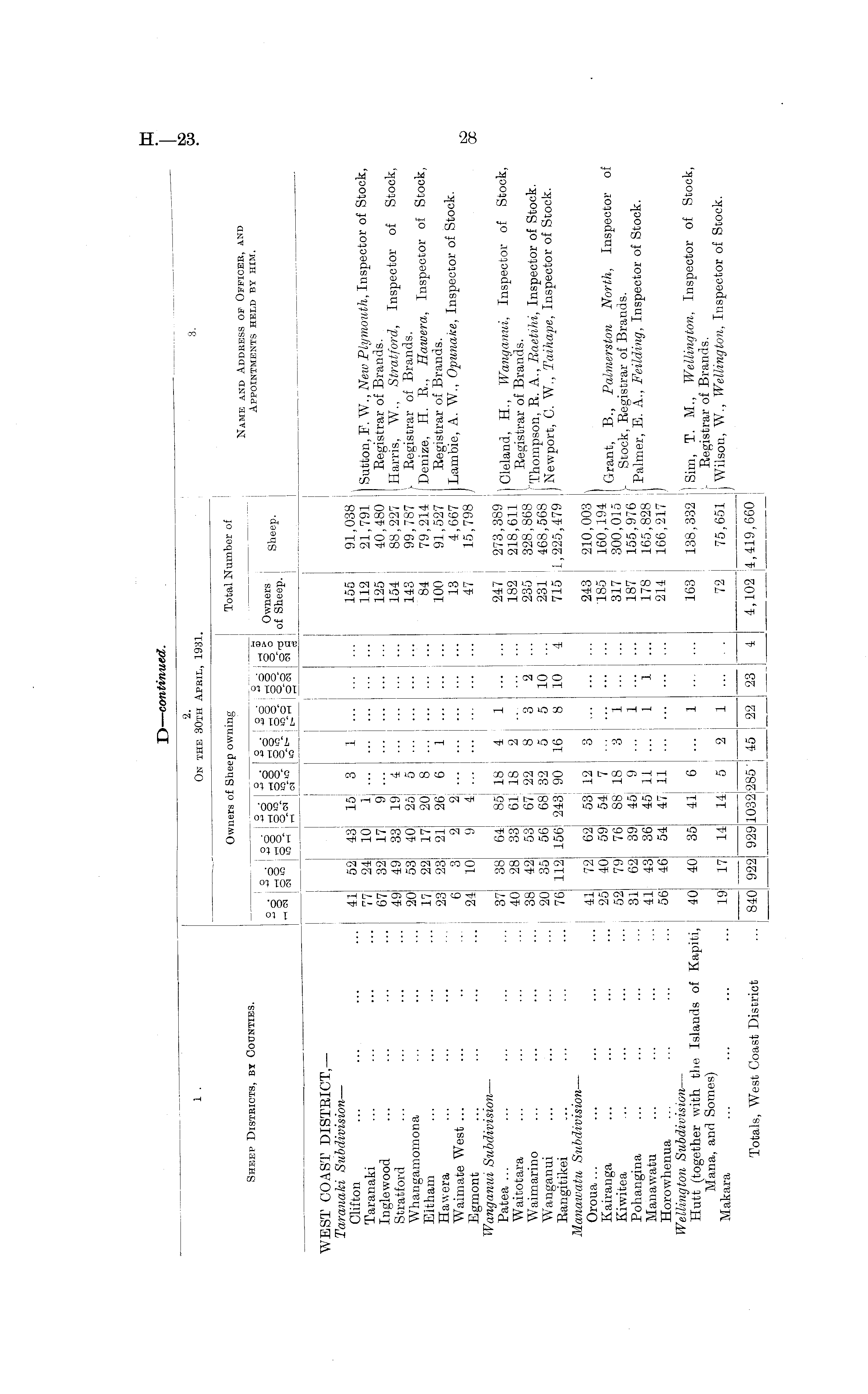 2. „ 1 ■ On the 30th Apeil, 1931. Owners of Sheep owning Total Number of Name and Addkbss op Officer, and Sheep Districts, bt Counties. : - - — fo s~ Appointments held by him. S O . $6 2§ :S S8 *| if §S Owllers Sheep :l SS g8 8£ SS- 8.1 |S- 8.§ §* o£ Sheep. Shee PWEST COAST DISTRICT,— Taranaki Subdivision — ... Clifton . ... 41 52 43 15 3 1 lofi 91,038 . Taranaki '.".! 77 24 10 2 112 21,791 Sutton, F. W., New Plymouth, Inspector of Stock, Inslewood '.'. ... 67 32 17 9 125 40,480 Registrar of Brands. Stratford 49 49 33 19 4 154 88,227 Harris, W., Stratford, Inspector of Stock, Whaneamomona '" 20 53 40 2ō 5 143 99,787 } Registrar of Brands. Eitham 17 22 17 20! 8 84 79,214 (Denize, H. R., Hawem, Inspector ot Stock, Hawera •■■ 23 21 26 ' 6 X 10 ° 91 > 527 Registrar of Brands. Waimate West " 6 3 2 2 13 4,667 Lambie, A. W., Opunahe, Inspector of Stock. Egmont '.'.'. '.'.'. .'.'. .'■■ 24 10 9 4 47 15,798 / Wanaanui Subdivision — ■ _ „„„ Patea 37 38 64 85 18 4 1 247 273,389 Oleland H-> Wanganm , Inspector of Stock, Waitotara ? ! "o "o '" ' Registrar of Brands. Waimarino 38 42 53 67 22 8 3 2 ... 235 328,868 Thom S K a., EaetiM , Inspector of Stock. £SSS ::: ::: ::: ::: S-iS.iS.sSS iS S .IS i S JSS inspector of s^. Manawatu Subdivision — I Oroua 41 72 62 53 12 3 243 210,003 \ Kairanga '..'. 25 40 59 54 7 . 185 160,194 Q B Palm , rston Northt Inspector of Kiwitea 52 79 76 88 18 3 1 317 fOO.Olo I Stock! Eegistrar o f Brands. Pohangina ... ■•• 31 62 39 45 9 ... 1 ... ... IS/ 155, 9/b j p al E A Feliding, Inspector of Stock. Manawatu ... ... ■■• 41 43 36 45 11 ... I 1 ... 178 165,828 Horowhenua 56 46 54 47 11 214 166,217 V Islands of Kapiti, 40 40 35 41 6 ... 1 163 138„332 j Sim, T. M Wellington, Inspector of Stock, Mana and Somes 1 ) f Registrar of Brands. Makara 19 17 14 14 5 2 1 72 75,651 j Wilson, W., Wellington, Inspector of Stock. Totals, West Coast District ... 840 922 9291032 285' 45 22 23 4 4,102 4,419,660