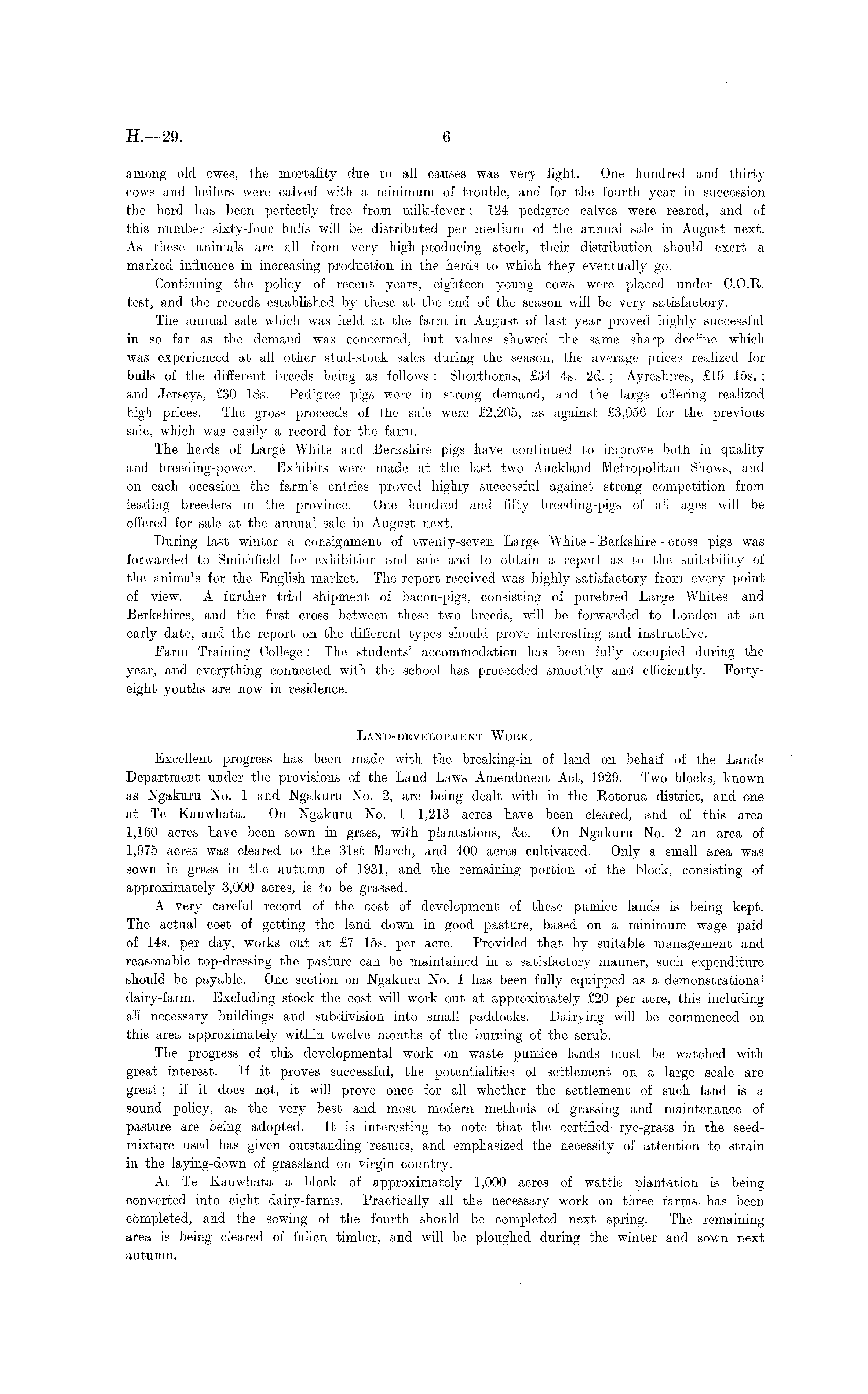 among old ewes, the mortality due to all causes was very light. One hundred and thirty cows and heifers were calved with a minimum of trouble, and for the fourth year in succession the herd has been perfectly free from milk-fever; 124 pedigree calves were reared, and of this number sixty-four bulls will be distributed per medium of the annual sale in August next. As these animals are all from very high-producing stock, their distribution should exert a marked influence in increasing production in the herds to which they eventually go. Continuing the policy of recent years, eighteen young cows were placed under C.O.R. test, and the records established by these at the end of the season will be very satisfactory. The annual sale which was held at the farm in August of last year proved highly successful in so far as the demand was concerned, but values showed the same sharp decline which was experienced at all other stud-stock sales during the season, the average prices realized for bulls of the different breeds being as follows : Shorthorns, £34 4s. 2d. ; Ayreshires, £15 155.; and Jerseys, £30 18s. Pedigree pigs were in strong demand, and the large offering realized high prices. The gross proceeds of the sale were £2,205, as against £3,056 for the previous sale, which was easily a record for the farm. The herds of Large White and Berkshire pigs have continued to improve both in quality and breeding-power. Exhibits were made at the last two Auckland Metropolitan Shows, and on each occasion the farm's entries proved highly successful against strong competition from leading breeders in the province. One hundred and fifty breeding-pigs of all ages will be offered for sale at the annual sale in August next. During last winter a consignment of twenty-seven Large White - Berkshire - cross pigs was forwarded to Smithfield for exhibition and sale and to obtain a report as to the suitability of the animals for the English market. The report received was highly satisfactory from every point of view. A further trial shipment of bacon-pigs, consisting of purebred Large Whites and Berkshires, and the first cross between these two breeds, will be forwarded to London at an early date, and the report on the different types should prove interesting and instructive. Farm Training College: The students' accommodation has been fully occupied during the year, and everything connected with the school has proceeded smoothly and efficiently. Fortyeight youths are now in residence. Land-development Work. Excellent progress has been made with the breaking-in of land on behalf of the Lands Department under the provisions of the Land Laws Amendment Act, 1929. Two blocks, known as Ngakuru No. 1 and Ngakuru No. 2, are being dealt with in the Rotorua district, and one at Te Kauwhata. On Ngakuru No. 1 1,213 acres have been cleared, and of this area 1,160 acres have been sown in grass, with plantations, &c. On Ngakuru No. 2an area of 1,975 acres was cleared to the 31st March, and 400 acres cultivated. Only a small area was sown in grass in the autumn of 1931, and the remaining portion of the block, consisting of approximately 3,000 acres, is to be grassed. A very careful record of the cost of development of these pumice lands is being kept. The actual cost of getting the land down in good pasture, based on a minimum wage paid of 14s. per day, works out at £7 15s. per acre. Provided that by suitable management and reasonable top-dressing the pasture can be maintained in a satisfactory manner, such expenditure should be payable. One section on Ngakuru No. 1 has been fully equipped as a demonstrational dairy-farm. Excluding stock the cost will work out at approximately £20 per acre, this including all necessary buildings and subdivision into small paddocks. Dairying will be commenced on this area approximately within twelve months of the burning of the scrub. The progress of this developmental work on waste pumice lands must be watched with great interest. If it proves successful, the potentialities of settlement on a large scale are great; if it does not, it will prove once for all whether the settlement of such land is a sound policy, as the very best and most modern methods of grassing and maintenance of pasture are being adopted. It is interesting to note that the certified ryegrass in the seedmixture used has given outstanding results, and emphasized the necessity of attention to strain in the laying-down of grassland on virgin country. At Te Kauwhata a block of approximately 1,000 acres of wattle plantation is being converted into eight dairy-farms. Practically all the necessary work on three farms has been completed, and the sowing of the fourth should be completed next spring. The remaining area is being cleared of fallen timber, and will be ploughed during the winter and sown next autumn.