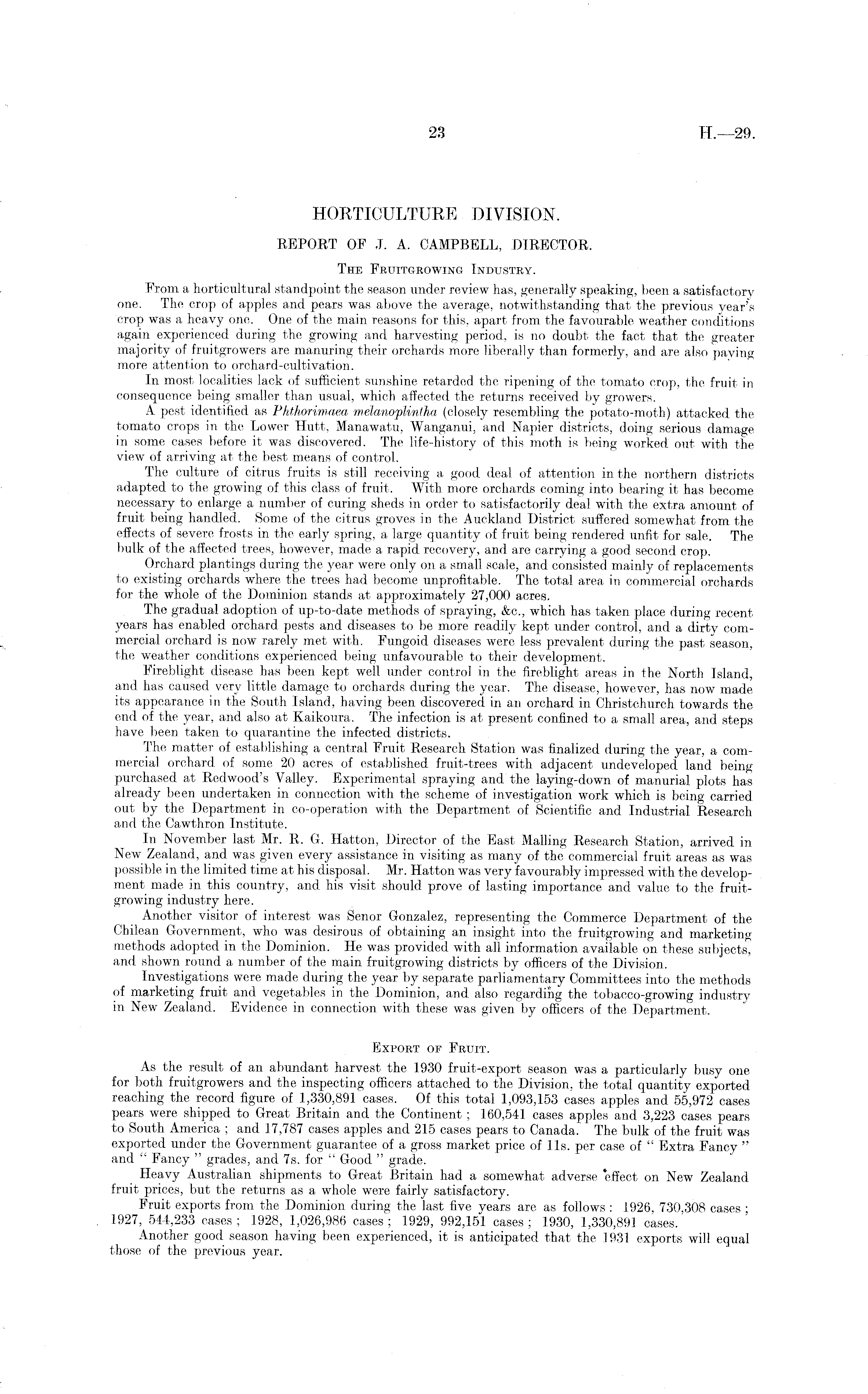 HORTICULTURE DIVISION. REPORT OF J. A. CAMPBELL, DIRECTOR. The Fruitgrowing Industry. From a horticultural standpoint the season under review has, generally speaking, been, a satisfactory one. The crop of apples and pears was above the average, notwithstanding that the previous year's crop was a heavy one. One of the main reasons for this, apart from the favourable weather conditions again experienced during the growing and harvesting period, is no doubt the fact that the greater majority of fruitgrowers are manuring their orchards more liberally than formerly, and are also paying more attention to orchard-cultivation. In most localities lack of sufficient sunshine retarded the ripening of the tomato crop, the fruit in consequence being smaller than usual, which affected the returns received by growers. A pest identified as Phthorimaea melanopUntha (closely resembling the potato-moth) attacked the tomato crops in the Lower Hutt, Manawatu, Wanganui, and Napier districts, doing serious damage in some cases before it was discovered. The life-history of this moth is being worked out with the view of arriving at the best means of control. The culture of citrus fruits is still receiving a good deal of attention in the northern districts adapted to the growing of this class of fruit. With more orchards coming into bearing it has become necessary to enlarge a number of curing sheds in order to satisfactorily deal with the extra amount of fruit being handled. Some of the citrus groves in the Auckland District suffered somewhat from the effects of severe frosts in the early spring, a large quantity of fruit being rendered unfit for sale. The bulk of the affected trees, however, made a rapid recovery, and are carrying a good second crop. Orchard plantings during the year were only on a small scale, and consisted mainly of replacements to existing orchards where the trees had become unprofitable. The total area in commercial orchards for the whole of the Dominion stands at approximately 27,000 acres. The gradual adoption of up-to-date methods of spraying, &c., which has taken place during recent years has enabled orchard pests and diseases to be more readily kept under control, and a dirtv commercial orchard is now rarely met with. Fungoid diseases were less prevalent during the past season, the weather conditions experienced being unfavourable to their development. Fireblight disease has been kept well under control in the fireblight areas in the North Island, and has caused very little damage to orchards during the year. The disease, however, has now made its appearance in the South Island, having been discovered in an orchard in Christchurch towards the end of the year, and also at Kaikoura. The infection is at present confined to a small area, and steps have been taken to quarantine the infected districts. The matter of establishing a central Fruit Research Station was finalized during the year, a commercial orchard of some 20 acres of established fruit-trees with adjacent, undeveloped land being purchased at Redwood's Valley. Experimental spraying and the laying-down of manurial plots has already been undertaken in connection with the scheme of investigation work which is being carried out by the Department in co-operation with the Department of Scientific and Industrial Research and the Cawthron Institute. In November last Mr. R. G. Hatton, Director of the East Mailing Research Station, arrived in New Zealand, and was given every assistance in visiting as many of the commercial fruit areas as was possible in the limited time at his disposal. Mr. Hatton was very favourably impressed with the development made in this country, and his visit should prove of lasting importance and value to the fruitgrowing industry here. Another visitor of interest was Senor Gonzalez, representing the Commerce Department of the Chilean Government, who was desirous of obtaining an insight into the fruitgrowing and marketing methods adopted in the Dominion. He was provided with all information available on these subjects, and shown round a number of the main fruitgrowing districts by officers of the Division. Investigations were made during the year by separate parliamentary Committees into the methods of marketing fruit and vegetables in the Dominion, and also regarding the tobacco-growing industry in New Zealand. Evidence in connection with these was given by officers of the Department. Export of Fruit. As the result of an abundant harvest the 1930 fruit-export season was a particularly busy one for both fruitgrowers and the inspecting officers attached to the Division, the total quantity exported reaching the record figure of 1,330,891 cases. Of this total 1,093,153 cases apples and 55,972 cases pears were shipped to Great Britain and the Continent ; 160,541 cases apples and 3,223 cases pears to South America ; and 17,787 cases apples and 215 cases pears to Canada. The bulk of the fruit was exported under the Government guarantee of a gross market price of lis. per case of " Extra Fancy " and " Fancy " grades, and 7s. for " Good " grade. Heavy Australian shipments to Great Britain had a somewhat adverse 'effect on New Zealand fruit prices, but the returns as a whole were fairly satisfactory. Fruit exports from the Dominion during the last five years are as follows : 1926, 730,308 cases ; 1927 , 544,233 cases ; 1928, 1,026,986 cases ; 1929, 992,151 cases ; 1930, 1,330,891 cases. Another good season having been experienced, it is anticipated that the 1931 exports will equal those of the previous year.