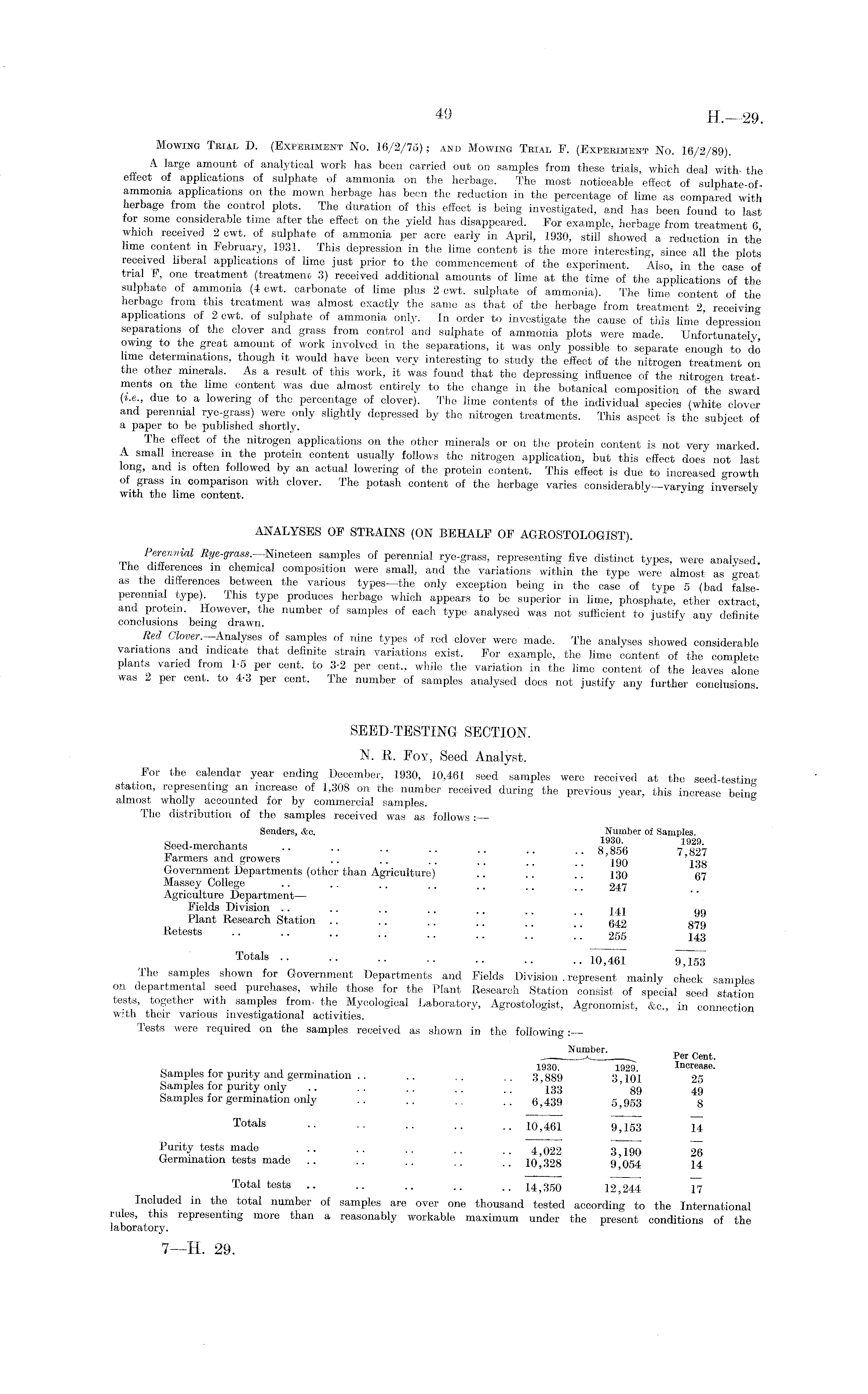 Mowing Trial D. (Experiment No. 16/2/75); and Mowing Trial P. (Experiment No. 16/2/89). A large amount of analytical work has been carried out on samples from these trials, which deal with- the effect of applications of sulphate of ammonia on the herbage. The most noticeable effect of sulphate-of-ammonia applications on the mown herbage has been the reduction in the percentage of lime as compared with herbage from the control plots. The duration of this effect is being investigated, and has been found to last for some considerable time after the effect on the yield has disappeared. For example, herbage from treatment 6 which received 2 cwt. of sulphate of ammonia per acre early in April, 1930, still showed a reduction in the lime content in February, 1931. This depression in the lime content is the more interesting, since all the plots received liberal applications of lime just prior to the commencement of the experiment. Also, in the case of trial F, one treatment (treatment 3) received additional amounts of lime at the time of the applications of the sulphate of ammonia (4 cwt. carbonate of lime plus 2 cwt. sulphate of ammonia). The lime content of the herbage from this treatment was almost exactly the same as that of the herbage from treatment 2, receiving applications of 2 cwt. of sulphate of ammonia only. In order to investigate the cause of this lime depression separations of the clover and grass from control and sulphate of ammonia plots were made Unfortunately owing to the great amount of work involved in the separations, it was only possible to separate enough to do lime determinations, though it would have been very interesting to study the effect of the nitrogen treatment on the other minerals. As a result of this work, it was found that the depressing inHuence of the nitrogen treatments on the lime content was due almost entirely to the change in the botanical composition of the sward (i.e due to a lowering of the percentage of clover). The lime contents of the individual species (white clover and perennial rye-grass) were only slightly depressed by the nitrogen treatments. This aspect is the subject of a paper to be published shortly. The effect of the nitrogen applications on the other minerals or on the protein content is not very marked. A small increase in the protein content usually follows the nitrogen application, but this effect does not last long, and is often followed by an actual lowering of the protein content. This effect is due to increased growth of grass m comparison with clover. The potash content of the herbage varies considerably-varying inversely with the lime content. 6 J ANALYSES OP STRAINS (ON BEHALF OF AGROSTOLOGIST). rro. P *™ Unial Bye-gfaag.—'Sineteen samples of perennial rye-grass, representing five distinct types, were analysed. differences m chemical composition were small, and the variations within the type were almost as great as the differences between the various types—the only exception being in the case of type 5 (bad falseperennial type). This type produces herbage which appears to be superior in lime, phosphate, ether extract and protein. However, the number of samples of each type analysed was not sufficient to justify any definite' conclusions being drawn. Red Clover. Analyses of samples of nine types of red clover were made. The analyses showed considerable variations and indicate that definite strain variations exist. For example, the lime content of the complete plants varied from 1-5 per cent, to 3-2 per cent., while the variation in the lime content of the leaves alone was 2 per cent, to 4-3 per cent. The number of samples analysed does not justify any further conclusions. SEED-TESTING SECTION. N. R. Foy, Seed Analyst. For the calendar year ending December, 1930, 10,461 seed samples were received at the seed-testing station, representing an increase of 1,308 on the number received during the previous year, this increase being almost wholly accounted for by commercial samples. The distribution of the samples received was as follows:— Senders, &c. Number of Samples. Seed-merchants .. .. .. ~ _ _ 8 9 856 7 19 827 Farmers and growers .. .. __ __ " 'jgg Government Departments (other than Agriculture) .. .. .. 130 67 Massey College .. .. .. ~ _ _ | '' 247 Agriculture Department— Fields Division .. .. .. ~ _ _ _ _ Plant Research Station .. .. .. " 879 Retests ; 255 143 Totals •• •• •• •• •• .. 10,461 9,153 The samples shown for Government Departments and Fields Division . represent mainly check samples on departmental seed purchases, while those for the Plant Research Station consist of special seed station tests, together with samples from- the Mycological Laboratory, Agrostologist, Agronomist, &c., in connection with their various investigational activities. Tests were required on the samples received as shown in the following Number. _ _ , _ — > Per Cent. c , , , . . 1930. 1929. Increase. Samples tor purity and germination .. .. .. .. 3 889 3 101 25 Samples for purity only .. .. .. .. ' 133 '89 49 Samples for germination only .. .. .. 6,439 5 953 8 Totala •• -• .. 10,461 9,153 14 Purity tests made 4>022 Orermination tests made .. .. . . .. _ 10,328 9 054 14 Total tests .. .. .. .. .. 14,350 12,244 17 Included m the total number of samples are over one thousand tested according to the International rules, this representing more than a reasonably workable maximum under the present conditions of the laboratory.