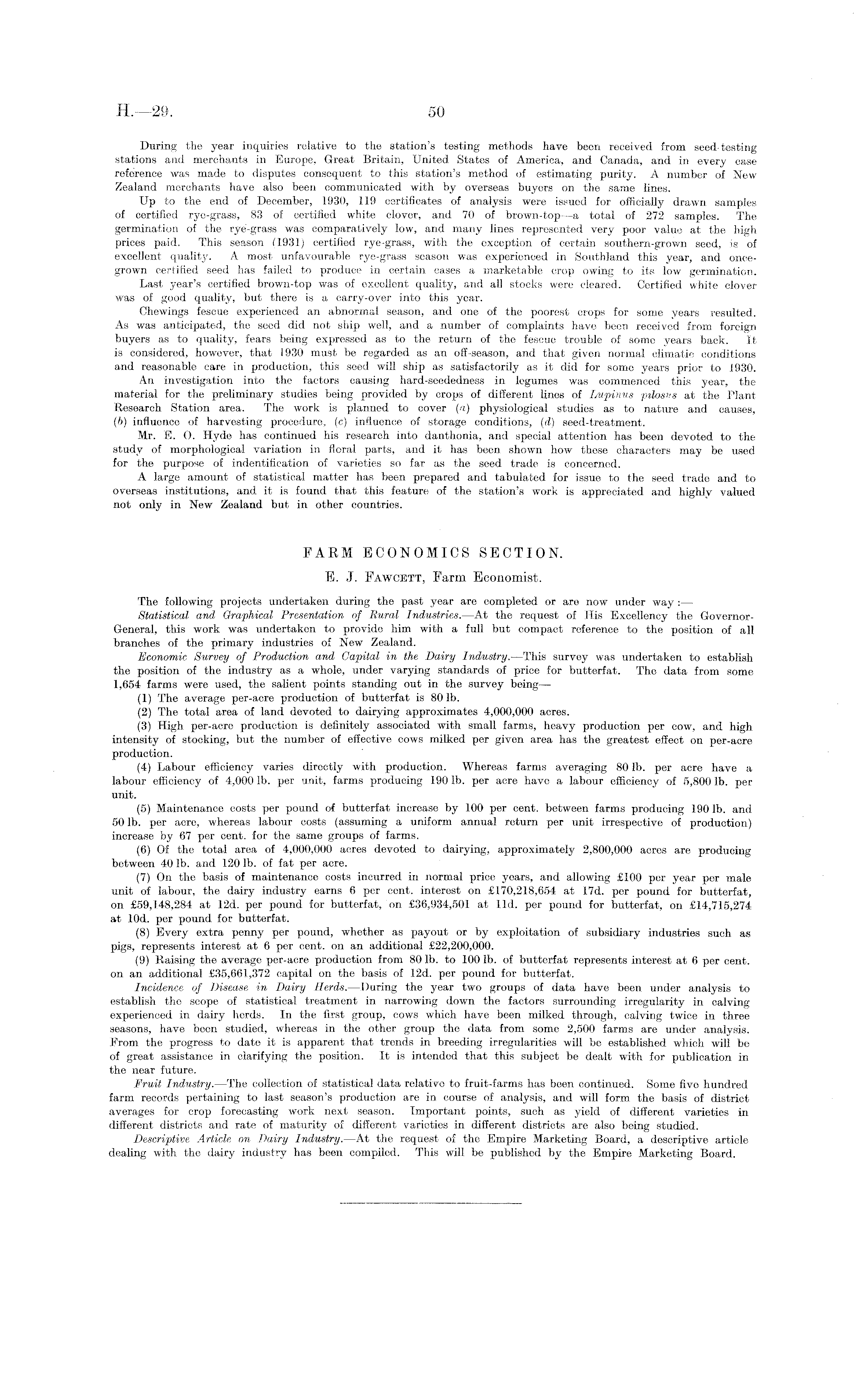 During the year inquiries relative to the station's testing methods have been received from seed-testing stations and merchants in Europe, Great Britain, United States of America, and Canada, and in every case reference was made to disputes consequent to this station's method of estimating purity. A number of New Zealand merchants have also been communicated with by overseas buyers on the same lines. Up to the end of December, 1930, 119 certificates of analysis were issued for officially drawn samples of certified rye-grass, 83 of certified white clover, and 70 of brown-top—a total of 272 samples. The germination of the rye-grass was comparatively low, and many lines represented very poor value at the high prices paid. This season (1931) certified rye-grass, with the exception of certain southern-grown seed, is of excellent quality. A most unfavourable rye-grass season was experienced in Southland this year, and oncegrown certified seed has failed to produce in certain cases a marketable crop owing to its low germination. Last year's certified brown-top was of excellent quality, and all stocks were cleared. Certified white clover was of good quality, but there is a carry-over into this year. Chewings fescue experienced an abnormal season, and one of the poorest crops for some years resulted. As was anticipated, the seed did not ship well, and a number of complaints have been received from foreign buyers as to quality, fears being expressed as to the return of the fescue trouble of some years back. It is considered, however, that 1930 must be regarded as an off-season, and that given normal climatic conditions and reasonable care in production, this seed will ship as satisfactorily as it did for some years prior to 1930. An investigation into the factors causing hard-seededness in legumes was commenced this year, the material for the preliminary studies being provided by crops of different lines of Lupinus pilosus at the Plant Research Station area. The work is planned to cover (a) physiological studies as to nature and causes, (b) influence of harvesting procedure, (c) influence of storage conditions, (d) seed-treatment. Mr. E. 0. Hyde has continued his research into danthonia, and special attention has been devoted to the study of morphological variation in floral parts, and it has been shown how these characters may be used for the purpose of indentification of varieties so far as the seed trade is concerned. A large amount of statistical matter has been prepared and tabulated for issue to the seed trade and to overseas institutions, and it is found that this feature of the station's work is appreciated and highly valued not only in New Zealand but in other countries. FARM ECONOMICS SECTION. E. J. Fawcett, Farm Economist. The following projects undertaken during the past year are completed or are now under way :— Statistical and Graphical Presentation of Rural Industries. —At the request of His Excellency the GovernorGeneral, this work was undertaken to provide him with a full but compact reference to the position of all branches of the primary industries of New Zealand. Economic Survey of Production and Capital in the Dairy Industry.—This survey was undertaken to establish the position of the industry as a whole, under varying standards of price for butterfat. The data from some 1,654 farms were used, the salient points standing out in the survey being— (1) The average per-acre production of butterfat is 801b. (2) The total area of land devoted to dairying approximates 4,000,000 acres. (3) High per-acre production is definitely associated with small farms, heavy production per cow, and high intensity of stocking, but the number of effective cows milked per given area has the greatest effect on per-acre production. (4) Labour efficiency varies directly with production. Whereas farms averaging 80 lb. per acre have a labour efficiency of 4,000 lb. per unit, farms producing 190 lb. per acre have a labour efficiency of 5,800 lb. per unit. (5) Maintenance costs per pound of butterfat increase by 100 per cent, between farms producing 190 lb. and 50 lb. per acre, whereas labour costs (assuming a uniform annual return per unit irrespective of production) increase by 67 per cent, for the same groups of farms. (6) Of the total area of 4,000,000 acres devoted to dairying, approximately 2,800,000 acres are producing between 40 lb. and 120 lb. of fat per acre. (7) On the basis of maintenance costs incurred in normal price years, and allowing £100 per year per male unit of labour, the dairy industry earns 6 per cent, interest on £170,218,654 at 17d. per pound for butterfat, on £59,148,284 at 12d. per pound for butterfat, on £36,934,501 at lid. per pound for butterfat, on £14,715,274 at lOd. per pound for butterfat. (8) Every extra penny per pound, whether as payout or by exploitation of subsidiary industries such as pigs, represents interest at 6 per cent, on an additional £22,200,000. (9) Raising the average per-acre production from 80 lb. to 100 lb. of butterfat represents interest at 6 per cent, on an additional £35,661,372 capital on the basis of 12d. per pound for butterfat. Incidence of Disease in Dairy Herds. —During the year two groups of data have been under analysis to establish the scope of statistical treatment in narrowing down the factors surrounding irregularity in calving experienced in dairy herds. In the first group, cows which have been milked through, calving twice in three seasons, have been studied, whereas in the other group the data from some 2,500 farms are under analysis. From the progress to date it is apparent that trends in breeding irregularities will be established which will be of great assistance in clarifying the position. It is intended that this subject be dealt with for publication in the near future. Fruit Industry.—The collection of statistical data relative to fruit-farms has been continued. Some five hundred farm records pertaining to las
