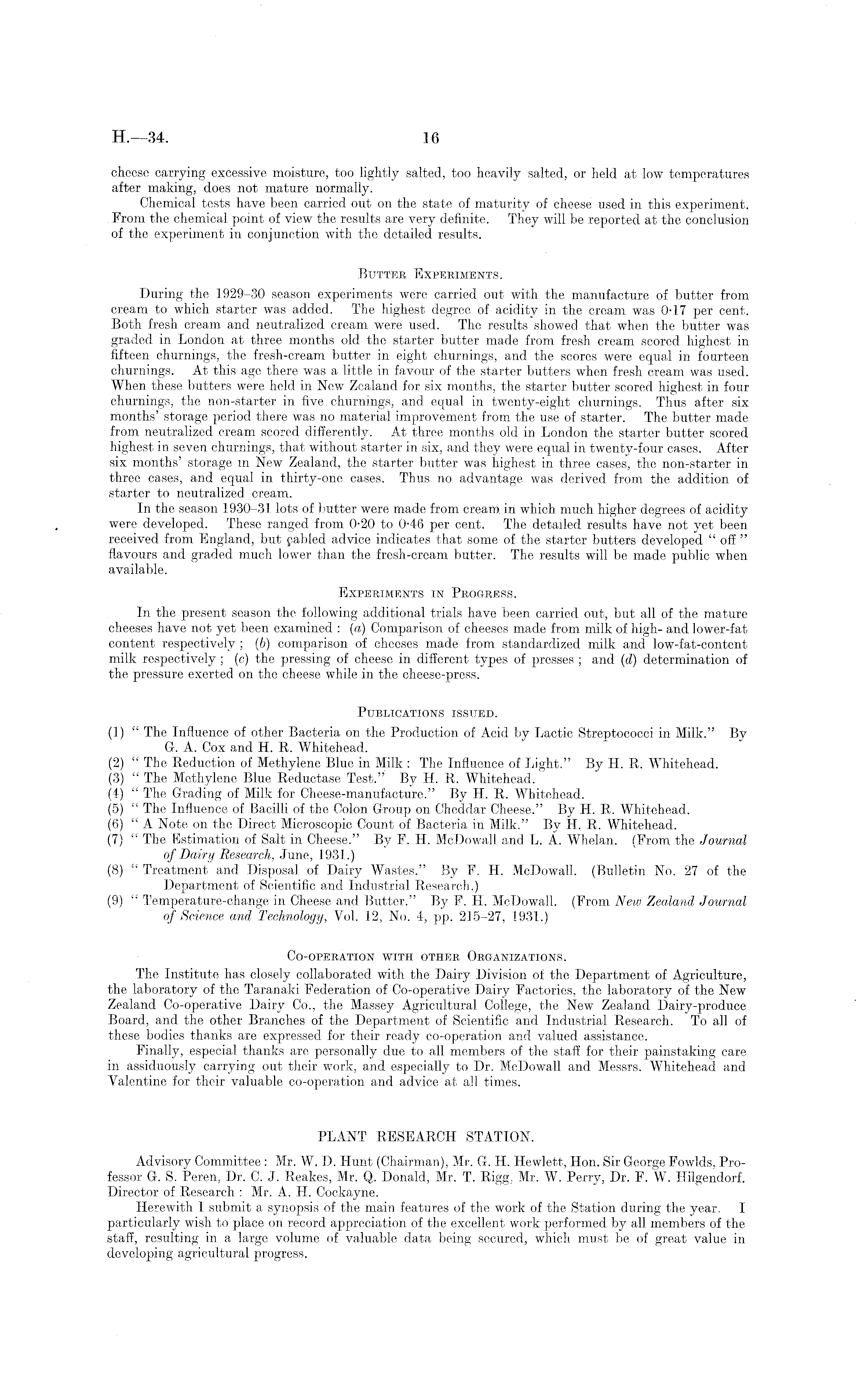 cheese carrying excessive moisture, too lightly salted, too heavily salted, or held at low temperatures after making, does not mature normally. Chemical tests have been carried out on the state of maturity of cheese used in this experiment. From the chemical point of view the results are very definite. They will he reported at the conclusion of the experiment in conjunction with the detailed results. Butter Experiments. During the 1929-30 season experiments were carried out with the manufacture of butter from cream to which starter was added. The highest degree of acidity in the cream was 0-17 per cent. Both fresh cream and neutralized cream were used. The results showed that when the butter was graded in London at three months old the starter butter made from fresh cream scored highest in fifteen churnings, the fresh-cream butter in eight churnings, and the scores were equal in fourteen churnings. At this age there was a little in favour of the starter butters when fresh cream was used. When these butters were held in New Zealand for six months, the starter butter scored highest in four churnings, the non-starter in five churnings, and. equal in twenty-eight churnings. Thus after six months' storage period there was no material improvement from the use of starter. The butter made from neutralized cream scored differently. At three months old in London the starter butter scored highest in seven churnings, that without starter in six, and they were equal in twenty-four cases. After six months' storage in New Zealand, the starter butter was highest in three cases, the non-starter in three cases, and equal in thirty-one cases. Thus no advantage was derived from the addition of starter to neutralized cream. In the season 1930-31 lots of butter were made from cream in which much higher degrees of acidity were developed. These ranged from 0-20 to 046 per cent. The detailed results have not yet been received from England, but cabled advice indicates that some of the starter butters developed " off " flavours and graded much lower than the fresh-cream butter. The results will be made public when available. Experiments in Progress. In the present season the following additional trials have been carried out, but all of the mature cheeses have not yet been examined : (a) Comparison of cheeses made from milk of high- and lower-fat content respectively ; (5) comparison of cheeses made from standardized milk and low-fat-content milk respectively ; (c) the pressing of cheese in different types of presses ; and (d) determination of the pressure exerted on the cheese while in the cheese-press. Publications issued. (1) " The Influence of other Bacteria on the Production of Acid by Lactic Streptococci in Milk." By G. A. Cox and H. B. Whitehead. (2) " The Reduction of Methylene Blue in Milk : The Influence of Light." By H. R. Whitehead. (3) " The Methylene Blue Reductase Test." By H. R. Whitehead. (4) " The Grading of Milk for Cheese-manufacture." By H. R. Whitehead. (5) " The Influence of Bacilli of the Colon Group on Cheddar Cheese." By H. R. Whitehead. (6) " A Note on the Direct Microscopic Count of Bacteria in Milk." Bv H. R. Whitehead. (7) " The Estimation of Salt in Cheese." By F. H. McDowall and L. A. Whelan. (From the Journal of Dairy Research, June, 1931.) (8) " Treatment" and Disposal of Dairy Wastes." By F. H. McDowall. (Bulletin No. 27 of the Department of Scientific and Industrial Research.) (9) " Temperature-change in Cheese and Butter." By F. H. McDowall. (From New Zealand Journal of Science and Technology, Vol. 12, No. 4, pp. 215-27, 1931.) Co-operation with other Organizations. The Institute has closely collaborated with the Dairy Division of the Department of Agriculture, the laboratory of the Taranaki Federation of Co-operative Dairy Factories, the laboratory of the New Zealand Co-operative Dairy Co., the Massey Agricultural College, the New Zealand Dairy-produce Board, and the other Branches of the Department of Scientific and Industrial Research. To all of these bodies thanks are expressed for their ready co-operation and valued assistance. Finally, especial thanks are personally due to all members of the staff for their painstaking care in assiduously carrying out their work, and especially to Dr. McDowall and Messrs. Whitehead and Valentine for their valuable co-operation and advice at all times. PLANT RESEARCH STATION. Advisory Committee : Mr. W. D. Hunt (Chairman), Mr. G. H. Hewlett, Hon. Sir George Fowlds. Professor G. S. Peren, Dr. C. J. Reakes, Mr. Q. Donald, Mr. T. Rigg.. Mr. W. Perry, Dr. F. W. Hilgendorf. Director of Research : Mr. A. H. Cockayne. Herewith I submit a synopsis of the main features of the work of the Station during the year. I particularly wish to place on record appreciation of the excellent work performed by all members of the staff, resulting in a large volume of valuable data being secured, which must be of great value in developing agricultural progress.