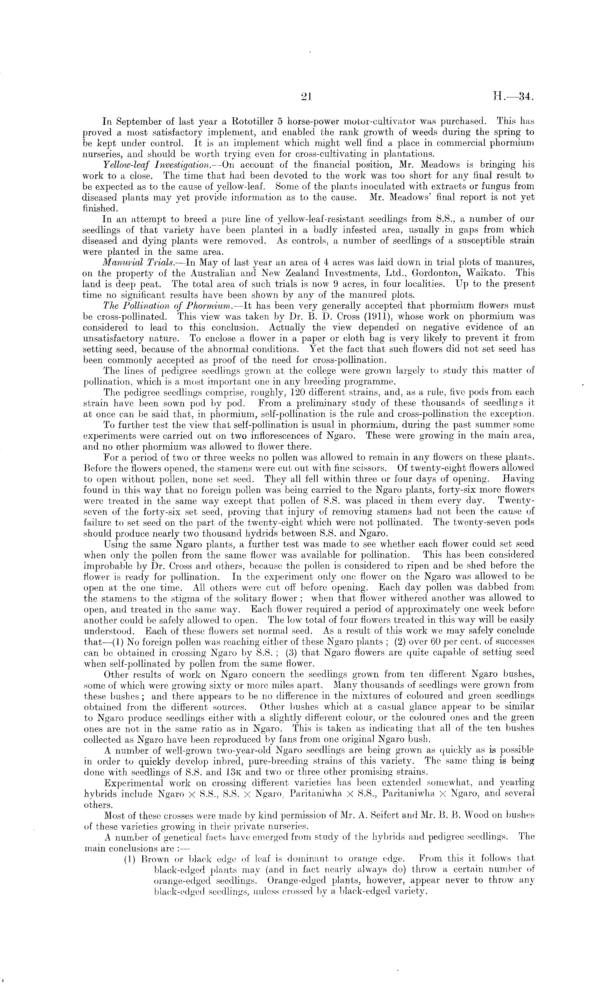 In September of last year a Eototiller 5 horse-power motor-cultivator was purchased. This has proved a most satisfactory implement, and enabled the rank growth of weeds during the spring to be kept under control. It is an implement which might well find a place in commercial phormium nurseries, and should be worth trying even for cross-cultivating in plantations. Yellow-leaf Investigation. —On account of the financial position, Mr. Meadows is bringing his work to a close. The time that had been devoted to the work was too short for any final result to be expected as to the cause of yellow-leaf. Some of the plants inocidated with extracts or fungus from diseased plants may yet provide information as to the cause. Mr. Meadows' final report is not yet finished. In an attempt to breed a pure line of yellow-leaf-resistant seedlings from S.S., a number of our seedlings of that variety have been planted in a badly infested area, usually in gaps from which diseased and dying plants were removed. As controls, a number of seedlings of a susceptible strain were planted in the same area. Manurial Trials. —In May of last year an area of 4 acres was laid down in trial plots of manures, on the property of the Australian and New Zealand Investments, Ltd., Gordonton, Waikato. This land is deep peat. The total area of such trials is now 9 acres, in four localities. Up to the present time no significant results have been shown by any of the manured plots. The Pollination of Phormium. —It has been very generally accepted that phormium flowers must be cross-pollinated. This view was taken by Dr. B. D. Cross (1911), whose work on phormium was considered to lead to this conclusion. Actually the view depended on negative evidence of an unsatisfactory nature. To enclose a flower in a paper or cloth bag is very likely to prevent it from setting seed, because of the abnormal conditions. Yet the fact that such flowers did not set seed has been commonly accepted as proof of the need for cross-pollination. The lines of pedigree seedlings grown at the college were grown largely to study this matter of pollination, which is a most important one in any breeding programme. The pedigree seedlings comprise, roughly, 120 different strains, and, as a rule, five pods from each strain have been sown pod by pod. From a preliminary study of these thousands of seedlings it at once can be said that, in phormium, self-pollination is the rule and cross-pollination the exception. To further test the view that self-pollination is usual in phormium, during the past summer some experiments were carried out on two inflorescences of Ngaro. These were growing in the main area, and no other phormium was allowed to flower there. For a period of two or three weeks no pollen was allowed to remain in any flowers on these plants. Before the flowers opened, the stamens were cut out with fine scissors. Of twenty-eight flowers allowed to open without pollen, none set seed. They all fell within three or four days of opening. Having found in this way that no foreign pollen was being carried to the Ngaro plants, forty-six more flowers were treated in the same way except that pollen of S.S. was placed in them every day. Twentyseven of the forty-six set seed, proving that injury of removing stamens had not been the cause of failure to set seed on the part of the twenty-eight which were not pollinated. The twenty-seven pods should produce nearly two thousand hydrids between S.S. and Ngaro. Using the same Ngaro plants, a further test was made to see whether each flower could set seed when only the pollen from the same flower was available for pollination. This has been considered improbable by Dr. Cross and others, because the pollen is considered to ripen and be shed before the flower is ready for pollination. In the experiment only one flower on the Ngaro was allowed to be open at the one time. All others were cut off before opening. Each day pollen was dabbed from the stamens to the stigma of the solitary flower ; when that flower withered another was allowed to open, and treated in the same way. Each flower required a period of approximately one week before another could be safely allowed to open. The low total of four flowers treated in this way will be easily understood. Each of these flowers set normal seed. As a result of this work we may safely conclude that —(1) No foreign pollen was reaching either of these Ngaro plants ; (2) over 60 per cent, of successes can be obtained in crossing Ngaro by S.S. ; (3) that Ngaro flowers are quite capable of setting seed when self-pollinated by pollen from the same flower. Other results of work on Ngaro concern the seedlings grown from ten different Ngaro bushes, some of which were growing sixty or more miles apart. Many thousands of seedlings were grown from these bushes ; and there appears to be no difference in the mixtures of coloured and green seedlings obtained from the different sources. Other bushes which at a casual glance appear to be similar to Ngaro produce seedlings either with a slightly different colour, or the coloured ones and the green ones are not in the same ratio as in Ngaro. This is taken as indicating that all of the ten bushes collected as Ngaro have been reproduced by fans from one original Ngaro bush. A number of well-grown two-year-old Ngaro seedlings are being grown as quickly as is possible in order to quickly develop inbred, pure-breeding strains of this variety. The same thing is being done with seedlings of S.S. and 13k and two or three other promising strains. Experimental work on crossing different varieties has been extended somewhat, and yearling hybrids include Ngaro X S.S., S.S. X Ngaro, Paritaniwha X S.S., Paritaniwha X Ngaro, and several others. Most of these crosses were made by kind permission of Mr. A. Seifert and Mr. B. B. Wood on bushes of these varieties growing in their private nurseries. A number of genetical facts have emerged from study of the hybrids a