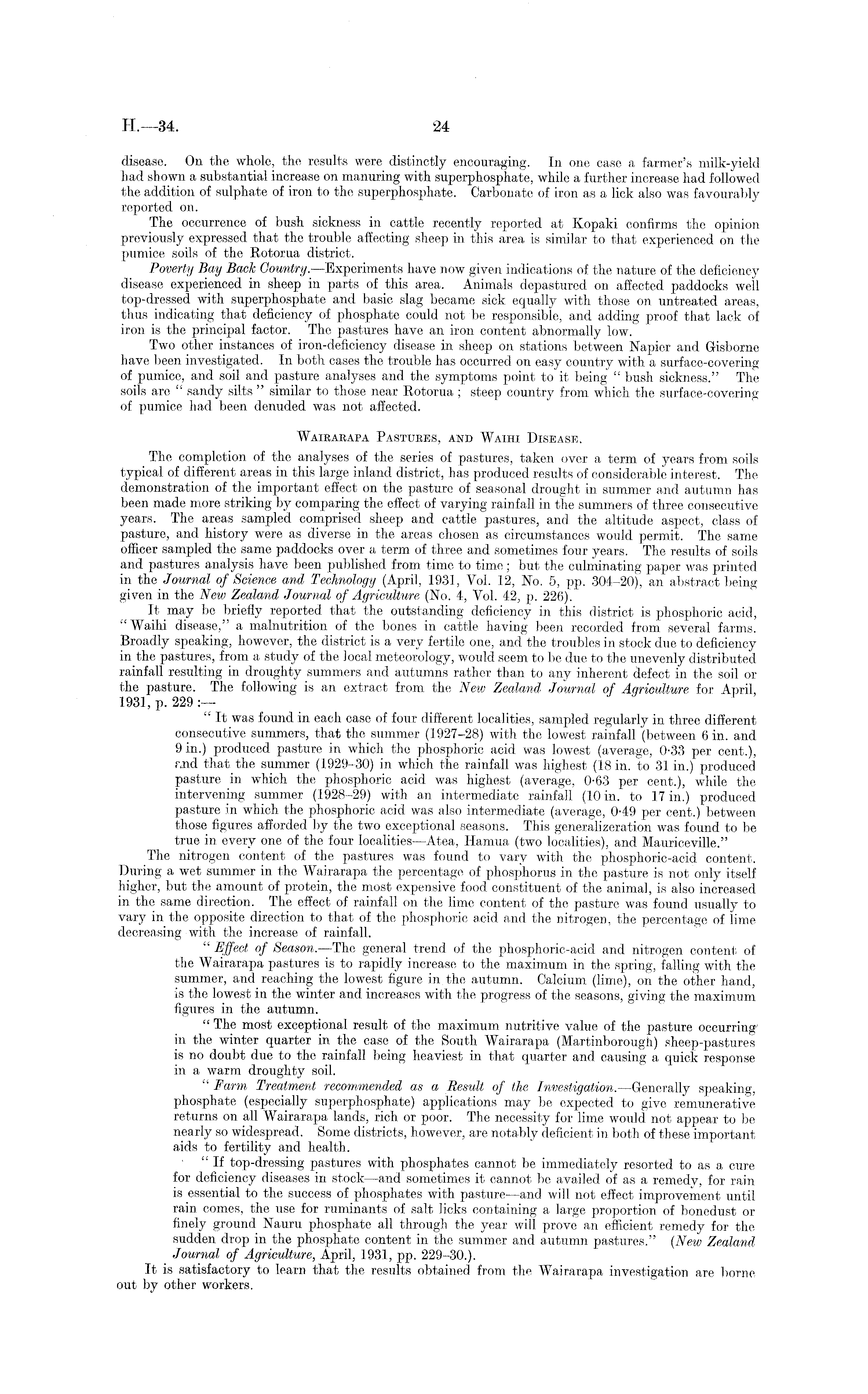 disease. On the whole, the results were distinctly encouraging. In one case a farmer's milk-yield had shown a substantial increase on manuring with superphosphate, while a further increase had followed the addition of sulphate of iron to the superphosphate. Carbonate of iron as a lick also was favourably reported on. The occurrence of bush sickness in cattle recently reported at Kopaki confirms the opinion previously expressed that the trouble affecting sheep in this area is similar to that experienced on the pumice soils of the Rotorua district. Poverty Bay Bade Country. —Experiments have now given indications of the nature of the deficiency disease experienced in sheep in parts of this area. Animals depastured on affected paddocks well top-dressed with superphosphate and basic slag became sick equally with those on untreated areas, thus indicating that deficiency of phosphate could not be responsible, and adding proof that lack of iron is the principal factor. The pastures have an iron content abnormally low. Two other instances of iron-deficiency disease in sheep on stations between Napier and Gisborne have been investigated. In both cases the trouble has occurred on easy country with a surface-covering of pumice, and soil and pasture analyses and the symptoms point to it being " bush sickness." The soils are " sandy silts " similar to those near Rotorua ; steep country from which the surface-covering of pumice had been denuded was not affected. Waiearapa Pastuees, and Waihi Disease. The completion of the analyses of the series of pastures, taken over a term of years from soils typical of different areas in this large inland district, has produced results of considerable interest. The demonstration of the important effect on the pasture of seasonal drought in summer and autumn has been made more striking by comparing the effect of varying rainfall in the summers of three consecutive years. The areas sampled comprised sheep and cattle pastures, and the altitude aspect, class of pasture, and history were as diverse in the areas chosen as circumstances would permit. The same officer sampled the same paddocks over a term of three and sometimes four years. The results of soils and pastures analysis have been published from time to time; but the culminating paper was printed in the Journal of Science and Technology (April, 1931, Vol. 12, No. 5, pp. 304-20), an abstract being given in the New Zealand Journal of Agriculture (No. 4, Vol. 42, p. 226). It may be briefly reported that the outstanding deficiency in this district is phosphoric acid, "Waihi disease," a malnutrition of the bones in cattle having been recorded from several farms. Broadly speaking, however, the district is a very fertile one, and the troubles in stock due to deficiency in the pastures, from a study of the local meteorology, would seem to be due to the unevenly distributed rainfall resulting in droughty summers and autumns rather than to any inherent defect in the soil or the pasture. The following is an extract from the New Zealand Journal of Agriculture for April, 1931, p. 229 :— " It was found in each case of four different localities, sampled regularly in three different consecutive summers, that the summer (1927-28) with the lowest rainfall (between 6 in. and 9 in.) produced pasture in which the phosphoric acid was lowest (average, 0-33 per cent.), r.nd that the summer (1929-30) in which the rainfall was highest (18 in. to 31 in.) produced pasture in which the, phosphoric acid was highest (average, 0-63 per cent.), while the intervening summer (1928-29) with an intermediate rainfall (10 in. to 17 in.) produced pasture in which the phosphoric acid was also intermediate (average, 049 per cent.) between those figures afforded by the two exceptional seasons. This generalizeration was found to be true in every one of the four localities—Atea, Hamua (two localities), and Mauriceville." The nitrogen content of the pastures was found to vary with the phosphoric-acid content. During a wet summer in the Wairarapa the percentage of phosphorus in the pasture is not only itself higher, but the amount of protein, the most expensive food constituent of the animal, is also increased in the same direction. The effect of rainfall on the lime content of the pasture was found usually to vary in the opposite direction to that of the phosphoric acid and the nitrogen, the percentage of lime decreasing with the increase of rainfall. " Effect of Season. —The general trend of the phosphoric-acid and nitrogen content of the Wairarapa pastures is to rapidly increase to the maximum in the spring, falling with the summer, and reaching the lowest figure in the autumn. Calcium (lime), on the other hand, is the lowest in the winter and increases with the progress of the seasons, giving the maximum, figures in the autumn. " The most exceptional result of the maximum nutritive value of the pasture occurring' in the winter quarter in the case of the South Wairarapa (Martinborough) sheep-pastures is no doubt due to the rainfall being heaviest in that quarter and causing a quick response in a warm droughty soil. " Farm Treatment recommended as a Result of the Investigation. —Generally speaking, phosphate (especially superphosphate) applications may be expected to give remunerative returns on all Wairarapa lands, rich or poor. The necessity for lime would not appear to be nearly so widespread. Some districts, however, are notably deficient in both of these important aids to fertility and health. " If top-dressing pastures with phosphates cannot be immediately resorted to as a cure for deficiency diseases in stock—and sometimes it cannot be availed of as a remedy, for rain is essential to the success of phosphates with pasture—and will not effect improvement until rain comes, the use for ruminants of salt licks containing a large proportion of bonedust or finely ground Nauru phosphate all through the year will prove an efficient remedy for 