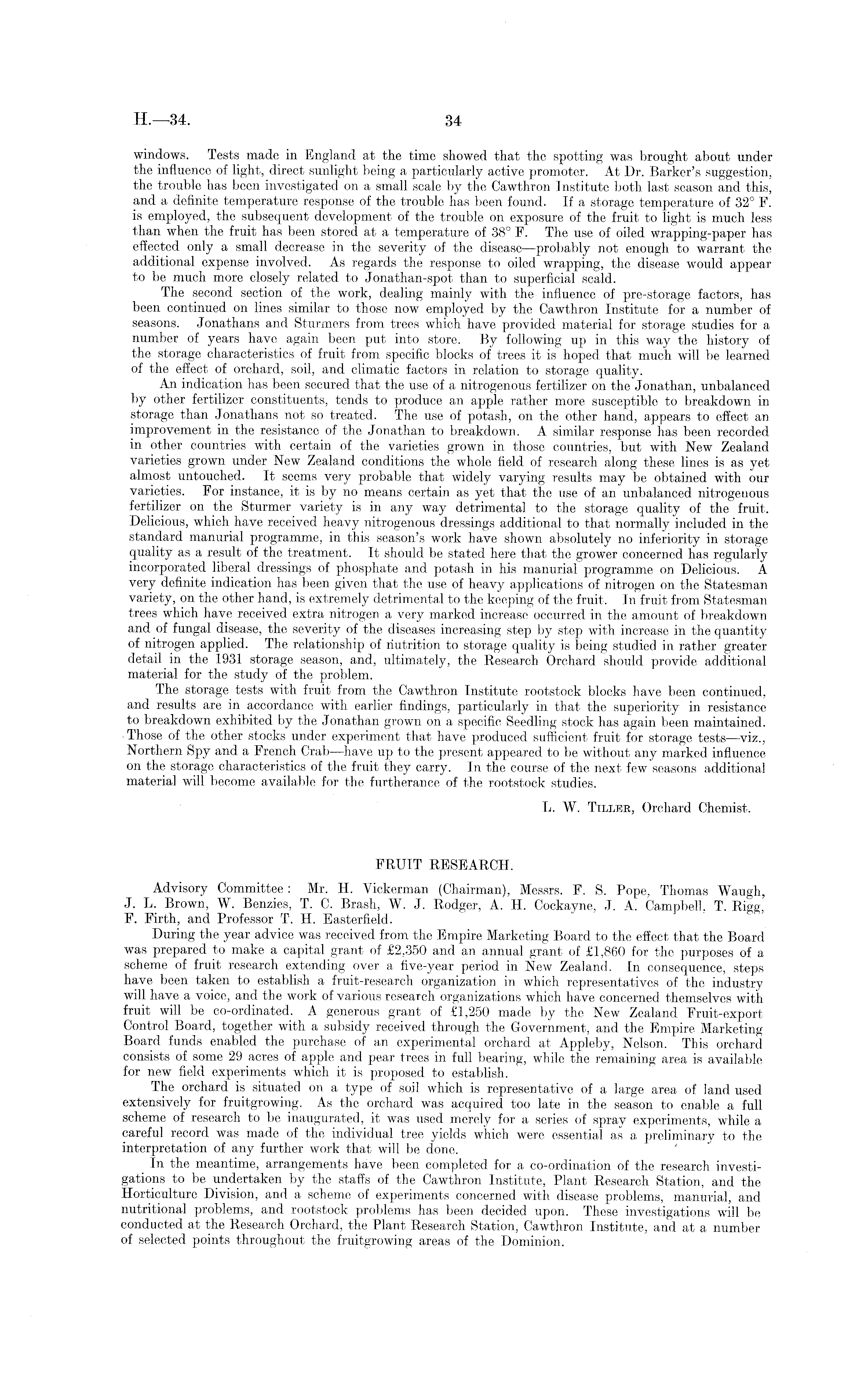 windows. Tests made in England at the time showed that the spotting was brought about under the influence of light, direct sunlight being a particularly active promoter. At Dr. Barker's suggestion, the trouble has been investigated on a small scale by the Cawthron Institute both last season and this, and a definite temperature response of the trouble has been found. If a storage temperature of 32° F. is employed, the subsequent development of the trouble on exposure of the fruit to light is much less than when the fruit has been stored at a temperature of 38° F. The use of oiled wrapping-paper has effected only a small decrease in the severity of the disease—probably not enough to warrant the additional expense involved. As regards the response to oiled wrapping, the disease would appear to be much more closely related to Jonathan-spot than to superficial scald. The second section of the work, dealing mainly with the influence of pre-storage factors, has been continued on lines similar to those now employed by the Cawthron Institute for a number of seasons. Jonathans and Stunners from trees which have provided material for storage studies for a number of years have again been put into store. By following up in this way the history of the storage characteristics of fruit from specific blocks of trees it is hoped that much will be learned of the effect of orchard, soil, and climatic factors in relation to storage quality. An indication has been secured that the use of a nitrogenous fertilizer on the Jonathan, unbalanced by other fertilizer constituents, tends to produce an apple rather more susceptible to breakdown in storage than Jonathans not so treated. The use of potash, on the other hand, appears to effect an improvement in the resistance of the Jonathan to breakdown. A similar response has been recorded in other countries with certain of the varieties grown in those countries, but with New Zealand varieties grown under New Zealand conditions the whole field of research along these lines is as yet almost untouched. It seems very probable that widely varying results may be obtained with our varieties. For instance, it is by no means certain as yet that the use of an unbalanced nitrogenous fertilizer on the Sturmer variety is in any way detrimental to the storage quality of the fruit. Delicious, which have received heavy nitrogenous dressings additional to that normally included in the standard manurial programme, in this season's work have shown absolutely no inferiority in storage quality as a result of the treatment. It should be stated here that the grower concerned has regularly incorporated liberal dressings of phosphate and potash in his manurial programme on Delicious. A very definite indication has been given that the use of heavy applications of nitrogen on the Statesman variety, on the other hand, is extremely detrimental to the keeping of the fruit. In fruit from Statesman trees which have received extra nitrogen a very marked increase occurred in the amount of breakdown and of fungal disease, the severity of the diseases increasing step by step with increase in the quantity of nitrogen applied. The relationship of nutrition to storage quality is being studied in rather greater detail in the 1931 storage season, and, ultimately, the Research Orchard should provide additional material for the study of the problem. The storage tests with fruit from the Cawthron Institute rootstock blocks have been continued, and results are in accordance with earlier findings, particularly in that the superiority in resistance to breakdown exhibited by the Jonathan grown on a specific Seedling stock has again been maintained. • Those of the other stocks under experiment that have produced sufficient fruit for storage tests: —viz., Northern Spy and a French Crab—have up to the present appeared to be without any marked influence on the storage characteristics of the fruit they carry. In the course of the next few seasons additional material will become available for the furtherance of the rootstock studies. L. W. Tillbb, Orchard Chemist. FRUIT RESEARCH. Advisory Committee: Mr. H. Vickerman (Chairman), Messrs. F. S. Pope, Thomas Waugh, J. L. Brown, W. Benzies, T. C. Brash, W. J. Rodger, A. H. Cockayne, J. A. Campbell. T. Rigg, F. Firth, and Professor T. H. Easterfield. During the year advice was received from the Empire Marketing Board to the effect that the Board was prepared to make a capital grant of £2.350 and an annual grant of £1,860 for the purposes of a scheme of fruit research extending over a five-year period in New Zealand. In consequence, steps have been taken to establish a fruit-research organization in which representatives of the industry will have a voice, and the work of various research organizations which have concerned themselves with fruit will be co-ordinated. A generous grant of £1,250 made by the New Zealand Fruit-export Control Board, together with a subsidy received through the Government, and the Empire Marketing Board funds enabled the purchase of an experimental orchard at Appleby, Nelson. This orchard consists of some 29 acres of apple and pear trees in full bearing, while the remaining area is available for new field experiments which it is proposed to establish. The orchard is situated on a type of soil which is representative of a large area of land used extensively for fruitgrowing. As the orchard was acquired too late in the season to enable a full scheme of research to be inaugurated, it was used merely for a series of spray experiments, while a careful record was made of the individual tree yields which were essential as a preliminary to the interpretation of any further work that will be done. In the meantime, arrangements have been completed for a co-ordination of the research investigations to be undertaken by the staffs of the Cawthron Institute, Plant Research Station, and the Horticulture Division, and a scheme of experiments concerned with