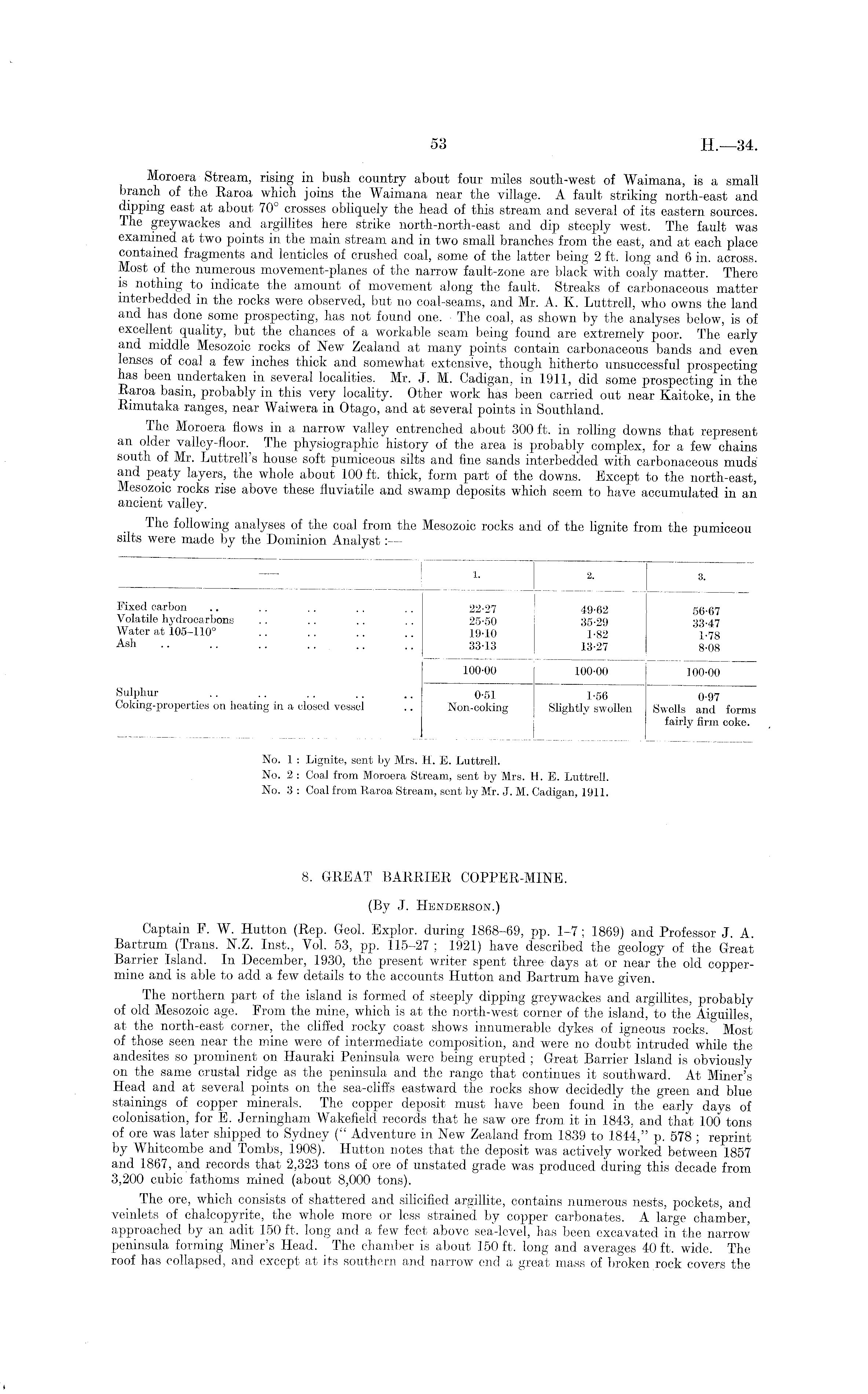 Moroera Stream, rising in bush country about four miles south-west of Waimana, is a small branch of the Raroa which joins the Waimana near the village. A fault striking north-east and dipping east at about 70° crosses obliquely the head of this stream and several of its eastern sources. The greywackes and argillites here strike north-north-east and dip steeply west. The fault was examined at two points in the main stream and in two small branches from the east, and at each place contained fragments and lenticles of crushed coal, some of the latter being 2 ft. long and 6 in. across. Most of the numerous movement-planes of the narrow fault-zone are black with coaly matter. There is nothing to indicate the amount of movement along the fault. Streaks of carbonaceous matter mterbedded in the rocks were observed, but no coal-seams, and Mr. A. K. Luttrell, who owns the land and has done some prospecting, has not found one. The coal, as shown by the analyses below, is of excellent quality, but the chances of a workable seam being found are extremely poor. The early and middle Mesozoic rocks of New Zealand at many points contain carbonaceous bands and even lenses of coal a few inches thick and somewhat extensive, though hitherto unsuccessful prospecting has been undertaken in several localities. Mr. J. M. Cadigan, in 1911, did some prospecting in the Raroa basin, probably in this very locality. Other work has been carried out near Kaitoke, in the Rimutaka ranges, near Waiwera in Otago, and at several points in Southland. The Moroera flows in a narrow valley entrenched about 300 ft. in rolling downs that represent an older valley-floor. The physiographic history of the area is probably complex, for a few chains south of Mr. Luttrell's house soft pumiceous silts and fine sands interbedded with carbonaceous muds and peaty layers, the whole about 100 ft. thick, form part of the downs. Except to the north-east, Mesozoic rocks rise above these fluviatile and swamp deposits which seem to have accumulated in an ancient valley. The following analyses of the coal from the Mesozoic rocks and of the lignite from the pumiceou silts were made by the Dominion Analyst:—