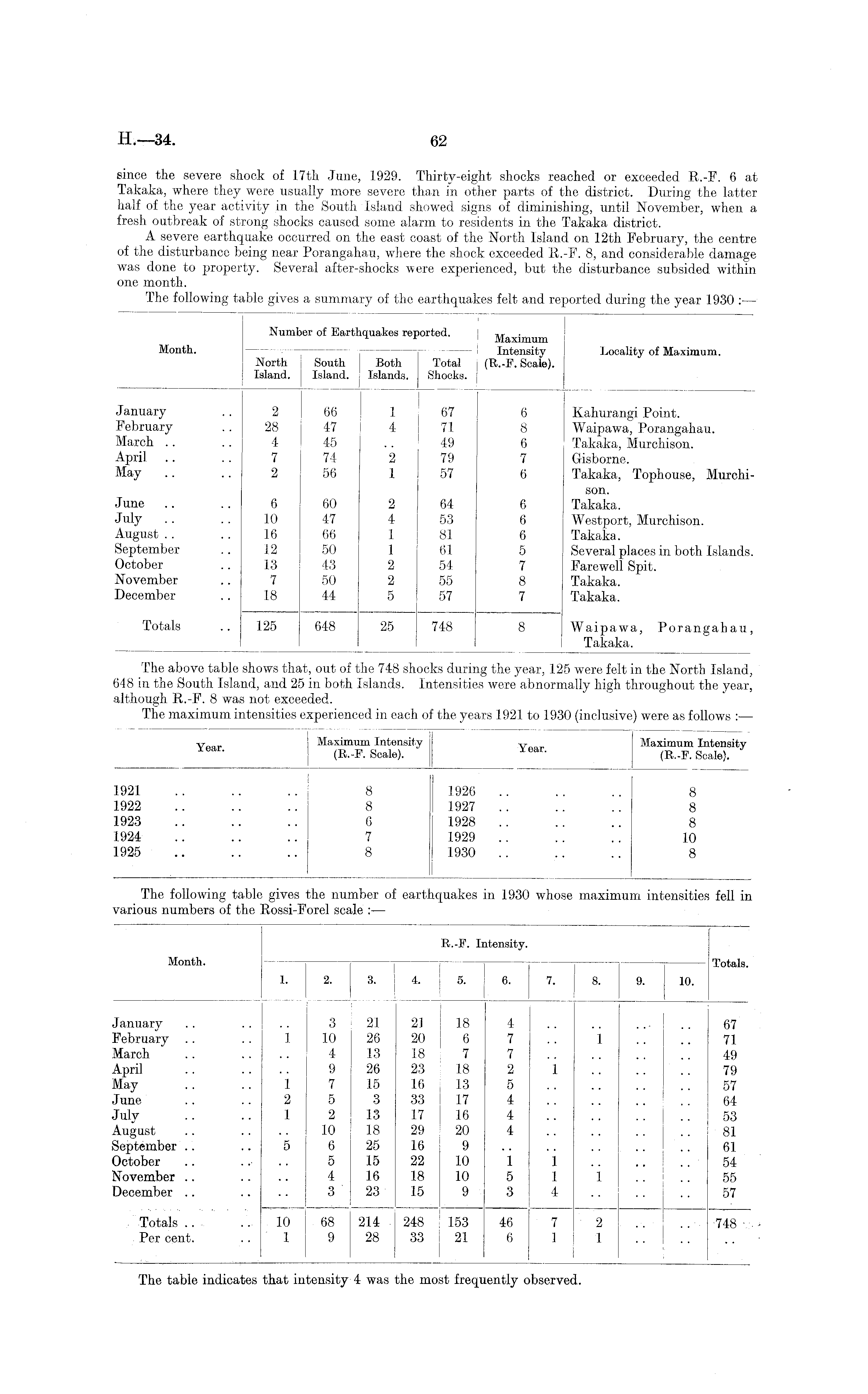 since the severe shock of 17th June, 1929. Thirty-eight shocks reached or exceeded R.-F. 6 at Takaka, where they were usually more severe than in other parts of the district. During the latter half of the year activity in the South Island showed signs of diminishing, until November, when a fresh outbreak of strong shocks caused some alarm to residents in the Takaka district. A severe earthquake occurred on the east coast of the North Island on 12th February, the centre of the disturbance being near Porangahau, where the shock exceeded R.-F. 8, and considerable damage was done to property. Several after-shocks were experienced, but the disturbance subsided within one month. The following table gives a summary of the earthquakes felt and reported during the year 1930 :—