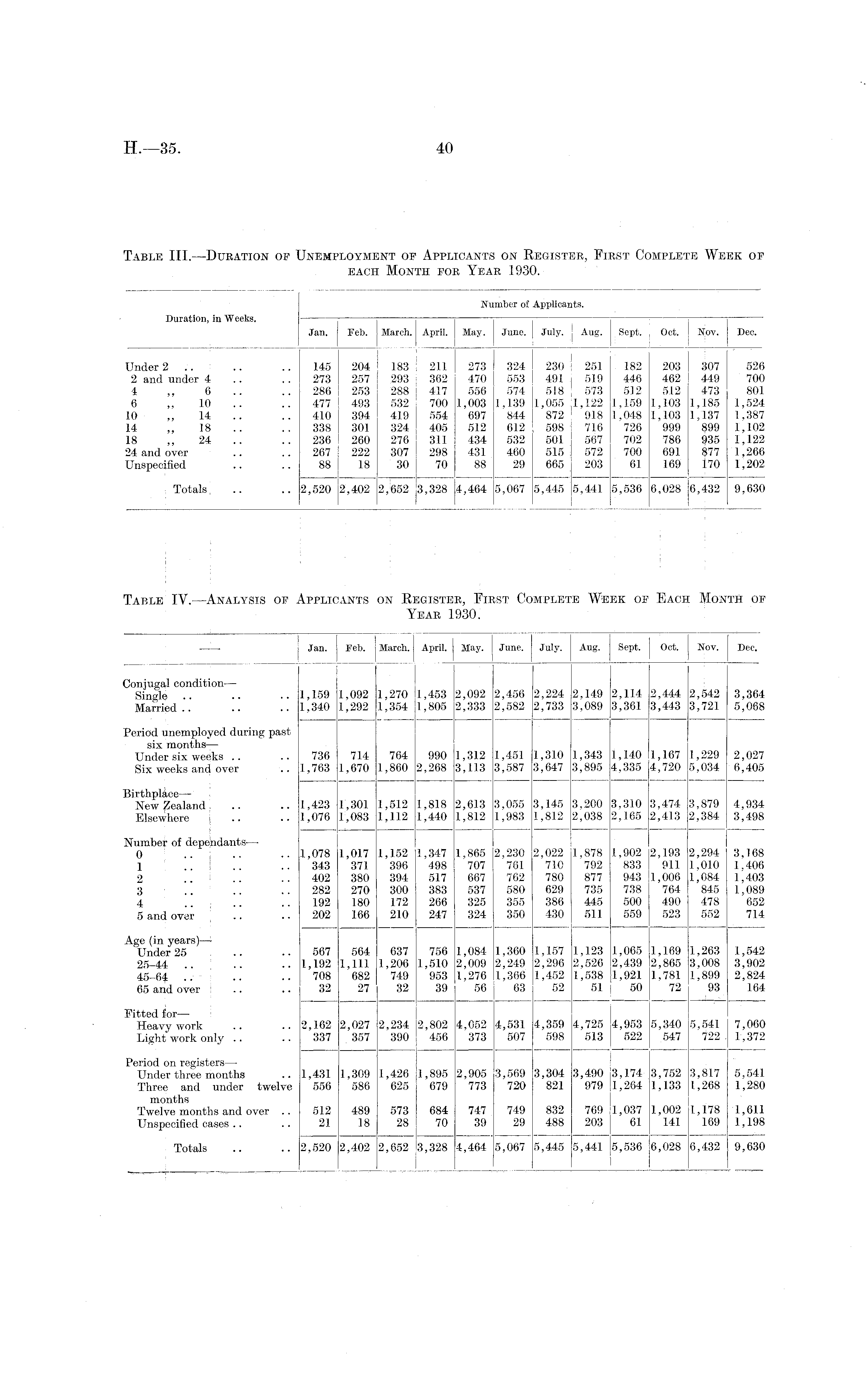Table III.—Duration of Unemployment of Applicants on Register, First Complete Week of each Month for Year 1930.