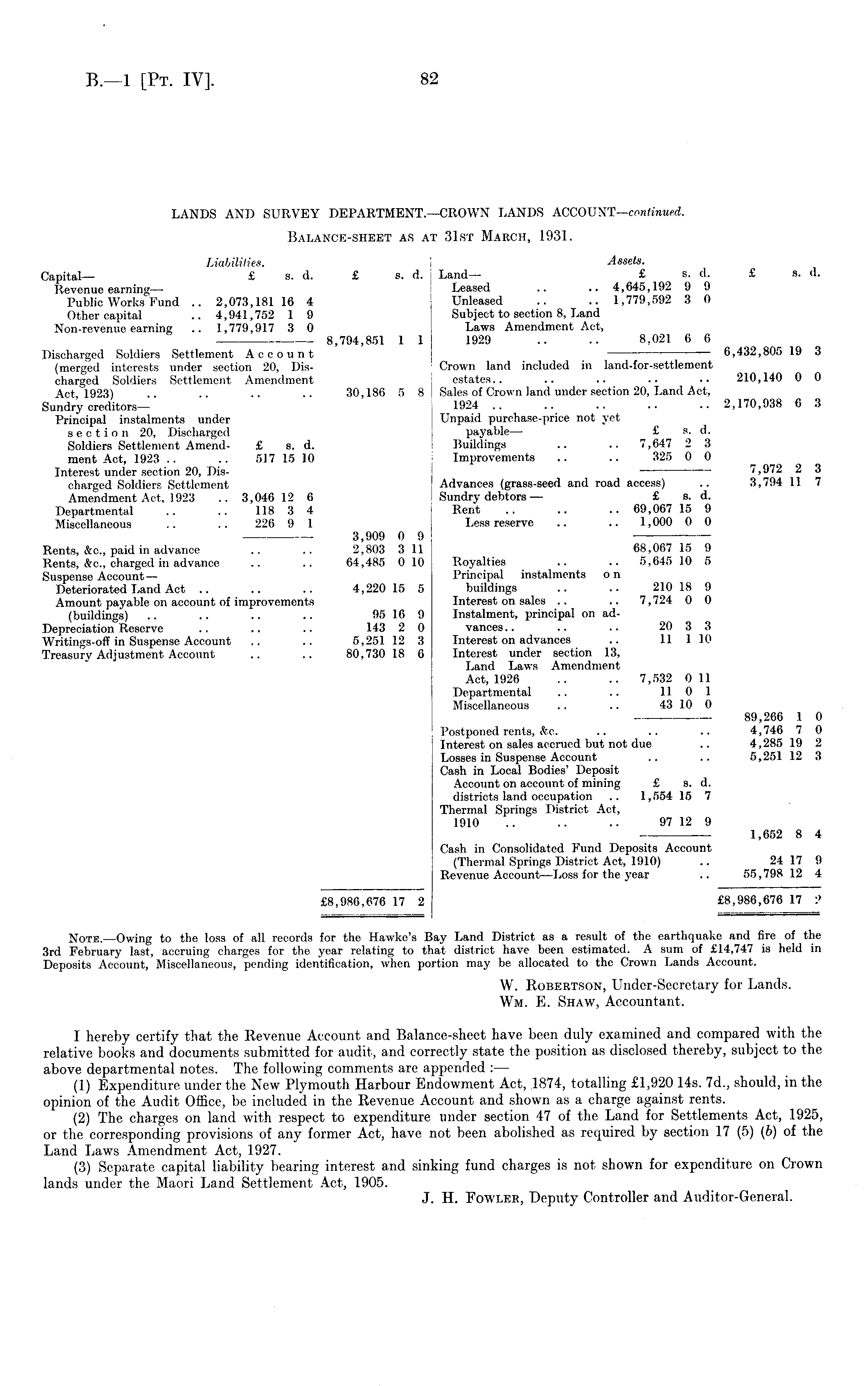LANDS AND SURVEY DEPARTMENT.—CROWN LANDS ACCOUNT— continued. Balance-sheet as at 31st March, 1931. Liabilities. Assets. Capital— £ s. d. £ s. d. Land— £ s. d. £ s. d. Revenue earning— Leased .. .. 4,645,192 9 9 Public Works Fund .. 2,073,18116 4 Unleased .. .. 1,779,592 3 0 Other capital .. 4,941,752 1 9 Subject to section 8, Land Non-revenue earning .. 1,779,917 3 0 Laws Amendment Act, 8,794,851 1 1 1929 .. .. 8,021 6 6 Discharged Soldiers Settlement Account — 6,432,805 19 3 (merged interests under section 20, Dis- Crown land included in land-for-settlement charged Soldiers Settlement Amendment estates.. .. .. .. .. 210,140 0 0 Act 1923) .. .. .. .. 30,186 5 8 Sales of Crown land under section 20, Land Act, Sundry creditors- 1924 2,170,938 6 3 Principal instalments under Unpaid purchase-price not yet section 20, Discharged payable— £ B. d. Soldiers Settlement Amend- £ s. d. Buildings .. .. 7,647 2 3 ment Act, 1923 .. .. 517 15 10 Improvements .. .. 325 0 0 Interest under section 20, Dis- 7,972 2 3 charged Soldiers Settlement Advances (grass-seed and road access) .. 3,794 11 7 Amendment Act, 1923 .. 3,046 12 6 Sundry debtors— £ s. d. Departmental .. .. 118 3 4 Rent .. .. .. 69,067 15 9 Miscellaneous .. .. 226 9 1 Less reserve .. .. 1,000 0 0 2 QQQ Q Q Rents, &c, paid in advance .. .. 2',803 3 11 68,067 15 9 Rents, &c, charged in advance .. .. 64,485 010 Royalties .. .. 5,645 10 5 Suspense Account — Principal instalments on Deteriorated Land Act .. .. .. 4,220 15 5 buildings .. .. 210 18 9 Amount payable on account of improvements Interest on sales .. .. 7,724 0 0 (buildings) .. .. .. .. 95 16 9 Instalment, principal on adDepreciation Reserve .. .. .. 143 2 0 vances.. .. .. 20 3 3 Writings-off in Suspense Account .. .. 5,251 12 3 Interest on advances .. 11 110 Treasury Adjustment Account .. .. 80,730 18 6 Interest under section 13, Land Laws Amendment Act, 1926 .. .. 7,532 011 Departmental .. .. 11 0 1 Miscellaneous .. .. 43 10 0 89,266 1 0 Postponed rents, &c. .. .. .. 4,746 7 0 Interest on sales accrued but not due .. 4,285 19 2 Losses in Suspense Account .. .. 5,251 12 3 Cash in Local Bodies' Deposit Account on account of mining £ s. d. districts land occupation .. 1,554 15 7 Thermal Springs District Act, 1910 .. .. .. 97 12 9 1,652 8 4 Cash in Consolidated Fund Deposits Account (Thermal Springs District Act, 1910) .. 24 17 9 Revenue Account —Loss for the year .. 55,798 12 4 £8,986,676 17 2 £8,986,676 17 :> Note. —Owing to the loss of all records for the Hawke's Bay Land District as a result of the earthquake and fire of the 3rd February last, accruing charges for the year relating to that district have been estimated. A sum of £14,747 is held in Deposits Account, Miscellaneous, pending identification, when portion may be allocated to the Crown Lands Account. W. Robertson, Under-Secretary for Lands. Wμ. E. Shaw, Accountant. I hereby certify that the Eevenue Account and Balance-sheet have been duly examined and compared with the relative books and documents submitted for audit, and correctly state the position as disclosed thereby, subject to the above departmental notes. The following comments are appended : — (1) Expenditure under the New Plymouth Harbour Endowment Act, 1874, totalling £1,920 14s. 7d., should, in the opinion of the Audit Office, be included in the Eevenue Account and shown as a charge against rents. (2) The charges on land with respect to expenditure under section 47 of the Land for Settlements Act, 1925, or the corresponding provisions of any former Act, have not been abolished as required by section 17 (5) (b) of the Land Laws Amendment Act, 1927. (3) Separate capital liability bearing interest and sinking fund charges is not shown for expenditure on Crown lands under the Maori Land Settlement Act, 1905. J. H. Fowler, Deputy Controller and Auditor-General.
