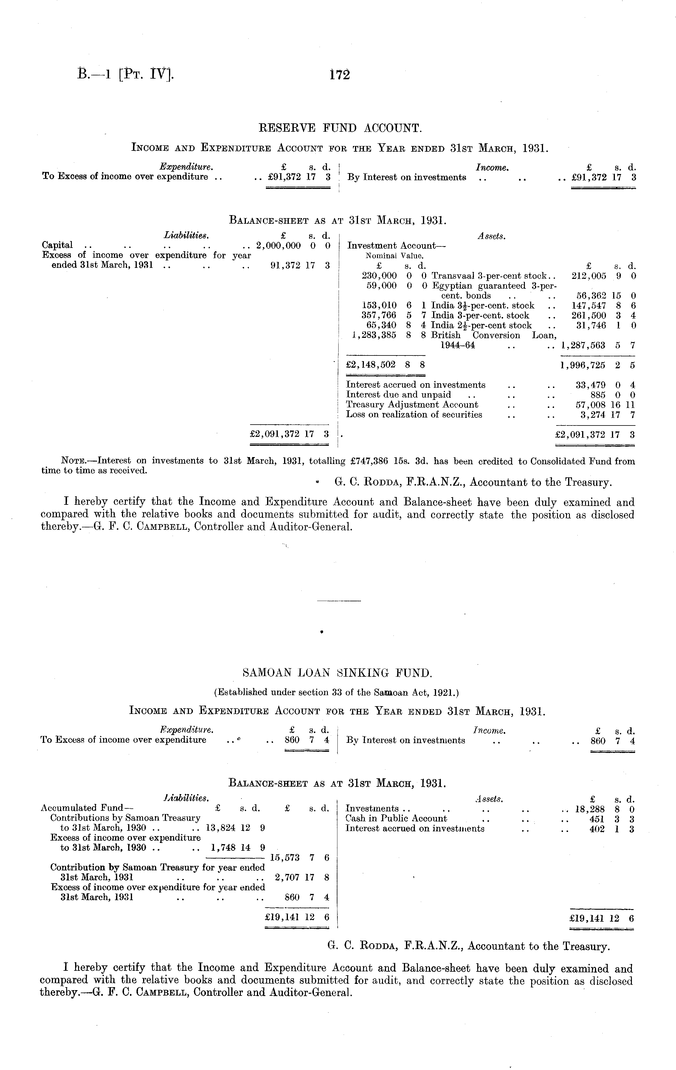 RESERVE FUND ACCOUNT. Income and Expenditure Account for the Year ended 31st March, 1931. Expenditure. £ s. d. | Income. £ s. d. To Excess of income over expenditure .. .. £91,372 17 3 By Interest on investments .. .. .. £91,372 17 3 Balance-sheet as at 31st March, 1931. Liabilities. £ s. d. Assets. Capital .. .. .. .. .. 2,000,000 0 0 > Investment Account— Excess of income over expenditure for year Nominal Value. ended 31st March, 1931 .. .. .. 91,372 17 3 j £ s. d. £ s. d. 230,000 0 0 Transvaal 3-per-cent stock.. 212,005 9 0 59,000 0 0 Egyptian guaranteed 3-per-cent, bonds .. .. 56,362 15 0 153,010 6 1 India 3i-per-cent. stock .. 147,547 8 6 357,766 5 7 India 3-per-cent. stock .. 261,500 3 4 65,340 8 4 India 2£-per-cent stock .. 31,746 1 0 1,283,385 8 8 British Conversion Loan, 1944-64 .. .. 1,287,563 5 7 ' £2,148,502 8 8 1,996,725 2 5 Interest accrued on investments .. .. 33,479 0 4 Interest due and unpaid .. .. .. 885 0 0 Treasury Adjustment Account .. .. 57,008 16 11 Loss on realization of securities .. .. 3,274 17 7 £2,091,372 17 3 . £2,091,372 17 3 Note.—lnterest on investments to 31st March, 1931, totalling £747,386 15s. 3d. has been credited to Consolidated Fund from time to time as received. G. C. Rodda, F.R.A.N.Z., Accountant to the Treasury. I hereby certify that the Income and Expenditure Account and Balance-sheet have been duly examined and compared with the relative books and documents submitted for audit, and correctly state the position as disclosed thereby.—G. F. C. Campbell, Controller and Auditor-General.