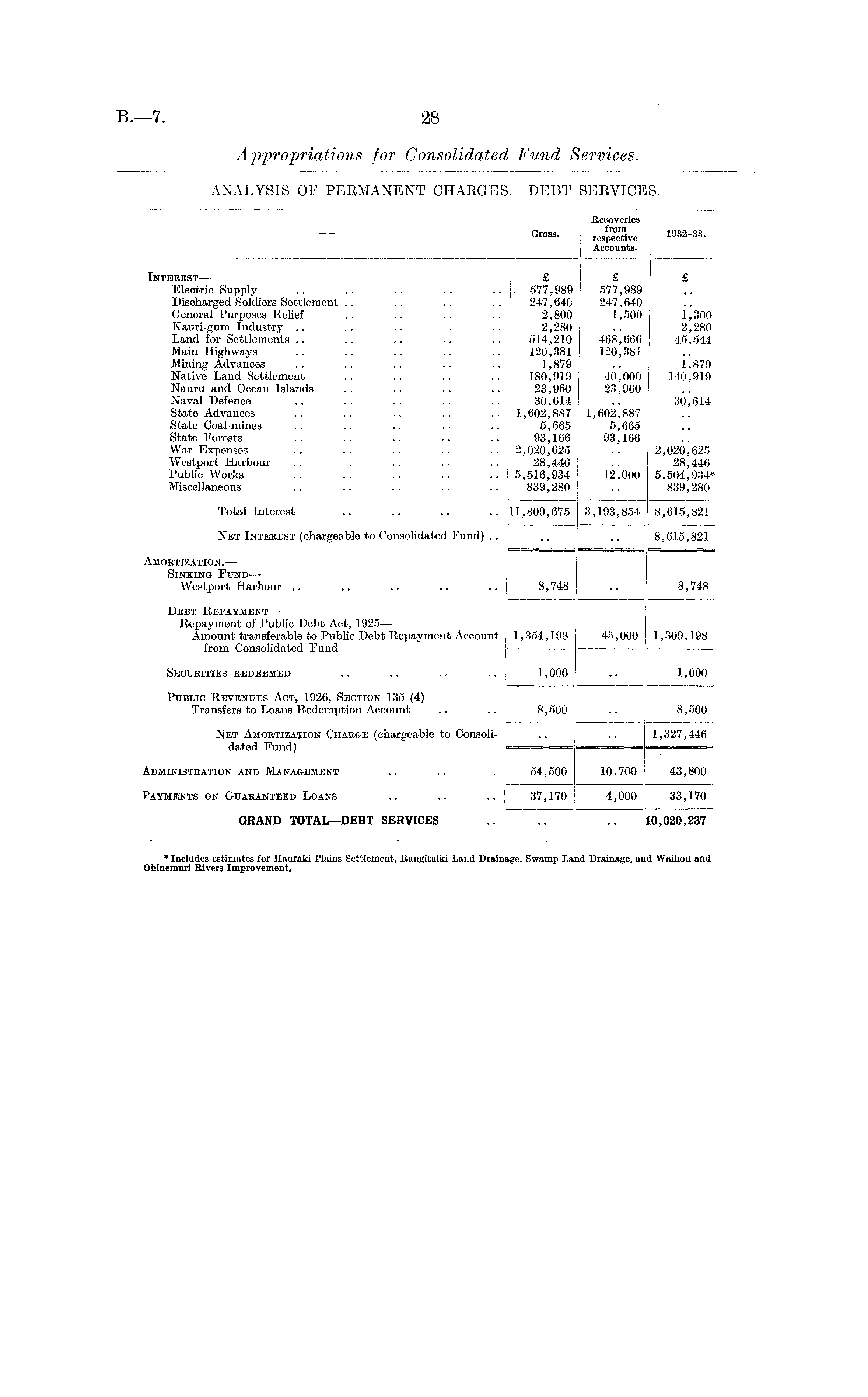 I Recoveries Gross. | re3^®ve 1932-33. j Accounts. Twp-p-RTTQrr ! 4? f -C Electric Supply .. .. .. .. .. i 577,989 577,989 Discharged Soldiers Settlement .. .. . . . . ! 247,640 247,640 General Purposes Relief . . .. .. . . 1 2,800 1,500 1,300 Kauri-gum Industry .. .. .. .. .. 2,280 .. 2,280 Land for Settlements .. .. .. .. .. 514,210 468,666 45,544 Main Highways .. .. .. .. .. 120,381 120,381 Mining Advances .. .. .. .. .. 1,879 .. 1,879 Native Land Settlement .. .. . . .. 180,919 40,000 140,919 Nauru and Ocean Islands .. .. .. .. 23,960 23,960 Naval Defence .. .. .. .. .. 30,614 .. 30,614 State Advances .. .. .. .. 1,602,887 1,602,887 State Coal-mines . . .. .. .. .. 5,665 5,665 State Forests .. .. .. .. .. 93,166 93,166 War Expenses .. .. .. .. .. 2,020,625 .. 2,020,625 Westport Harbour .. .. .. .. .. 28,446 .. 28,446 Public Works .. .. .. .. .. 15,516,934 12,000 5,504,934* Miscellaneous .. .. .. .. .. 839,280 .. 839,280 j Total Interest .. .. .. .. ill,809,675 3,193,854 8,615,821 I ' Net Interest (chargeable to Consolidated Fund) .. .. .. 8,615,821 Amortization,— Sinking Fund— Westport Harbour .. .. ., .. .. j 8,748 .. 8,748 Debt Repayment— Repayment of Public Debt Act, 1925 — Amount transferable to Public Debt Repayment Account , 1,354,198 45,000 1,309,198 from Consolidated Fund j — —-— Securities redeemed .. .. .. .. 1,000 .. 1,000 Public Revenues Act, 1926, Section 135 (4) —• Transfers to Loans Redemption Account .. .. 8,500 .. 8,500 Net Amortization Charge (chargeable to Consoli- j .. .. 1,327,446 dated Fund) — - ===== Administration and Management .. .. .. 54,500 10,700 43,800 Payments on Guaranteed Loans .. .. .. 37,170 4,000 33,170 GRAND TOTAL—DEBT SERVICES 10,020,237 * Includes estimates for Hauraki Plains Settlement, Bangitaiki Land Drainage, Swamp Land Drainage, and Waihou and Ohinemuri Elvers Improvement.