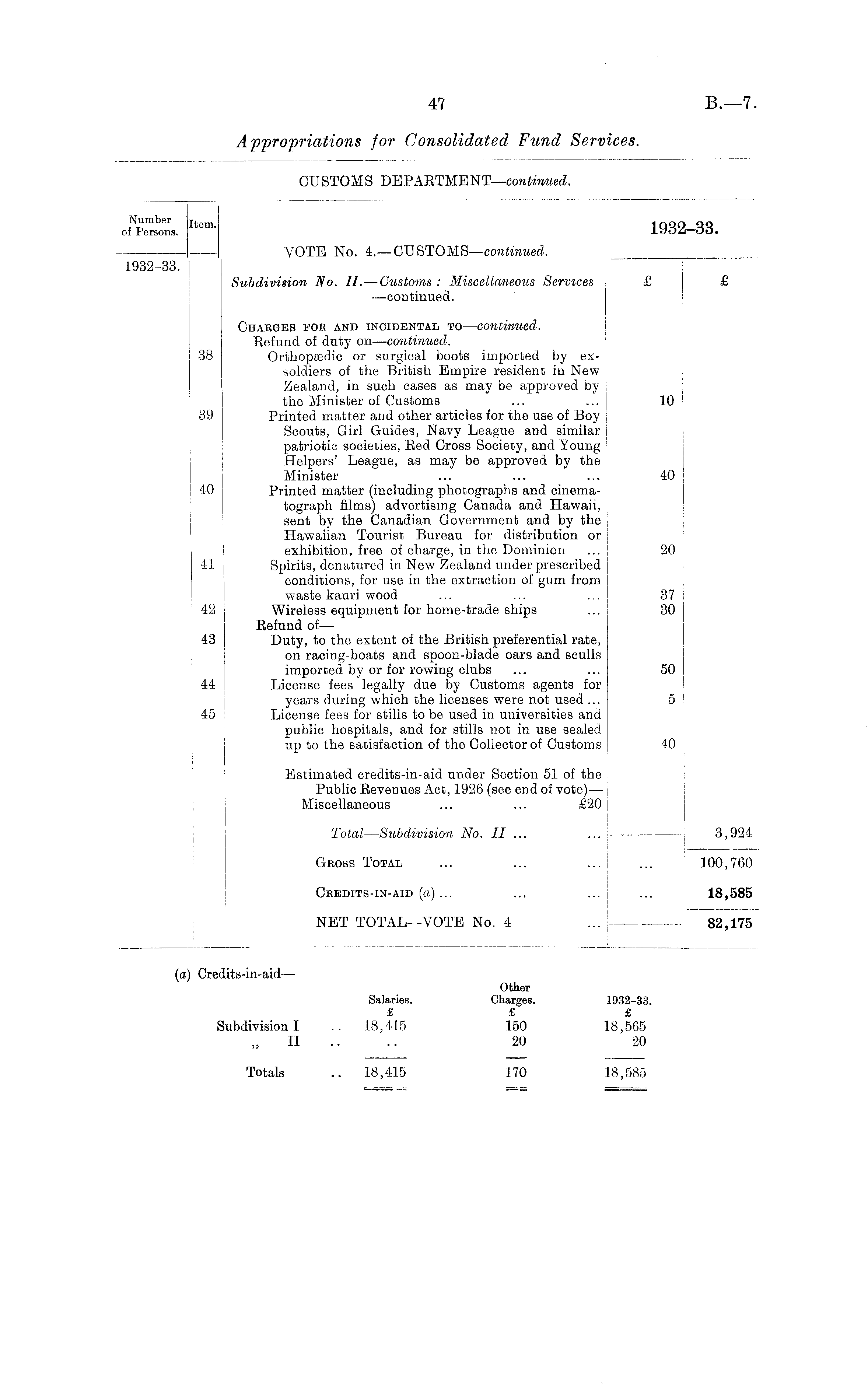 (a) Credits-in-aid— Other Salaries. Charges. 1932-33. £ £ £ Subdivision I .. 18,415 150 18,565 II 20 20 Totals .. 18,415 170 18,585