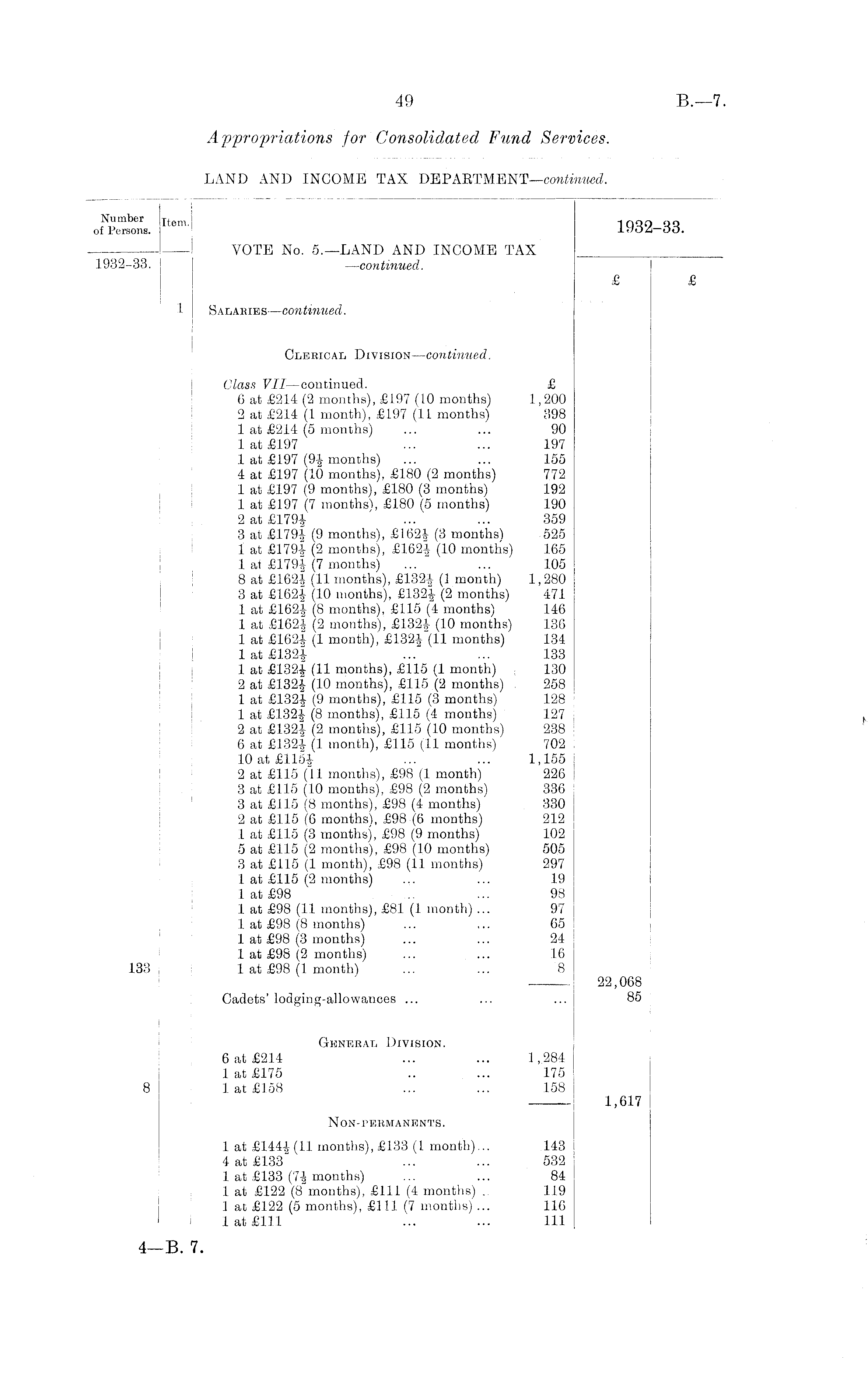 j Number Item i nqo qq of Persons. iJOZi-OO. VOTE No. 5,—LAND AND INCOME TAX 1932-33. —continued. £ £ 1 Salaries —continued. Clerical Division —continued. Class VII —continued. £ 6 at £214 (2 months), £197 (10 months) 1,200 2 at £214 (1 month), £197 (11 months) 398 1 at £214 (5 months) ... ... 90 1 at £197 ... ... 197 1 at £197 (9-J months) ... ... 155 4 at £197 (10 months), £180 (2 months) 772 1 at £197 (9 months), £180 (3 months) 192 1 at £197 (7 £180 (5 months) 190 2 at £1791 ... ... 359 3 at £179| (9 months), £162i (3 months) 525 1 at £179-j (2 months), £162J (10 months) 165 1 at £179| (7 months) ... ... 105 8 at £162| (11 months), (1 month) 1,280 3 at £162J (10 months), £132 J (2 months) 471 1 at £162f (8 months), £115 (4 months) 146 1 at £162| (2 months), £132f (10 months) 136 1 at £162| (1 month), (11 months) 134 1 at £132| ..." ... 133 1 at £132| (11 months), £115 (1 month) 130 2 at (10 months), £115 (2 months) 258 1 at £132f (9 months), £115 (3 months) 128 1 at £132J (8 months), £115 (4 months) 127 2 at £132| (2 months), £115 (10 months) 238 6 at £132f (1 month), £115 (11 months) 702 10 at £115|- ... ... 1,155 2 at £115 (11 months), £98 (1 month) 226 3 at £115 (10 months), £98 (2 months) 336 3 at £115 (8 months), £98 (4 months) 330 2 at £115 (6 months), £98 (6 months) 212 L at £115 (3 months), £98 (9 months) 102 5 at £115 (2 months), £98 (10 months) 505 3 at £115 (1 month), £98 (11 months) 297 1 at £115 (2 months) ... ... 19 1 at £98 .. ... 98 1 at £98 (11 months), £81 (1 month) ... 97 1 at £98 (8 months) ... ... 65 1 at £98 (3 months) ... ... 24 1 at £98 (2 months) ... ... 16 133 1 at £98 (1 month) ... ... 8 22,068 Cadets' lodging-allowances ... ... ... 85 General Division. 6 at £214 ... ... 1,284 1 at £175 .. ... 175 8 1 at £158 ... ... 158 1,617 Non-permanents. 1 at £1444(11 months), £133 (1 month)... 143 4 at £133" ... ... 532 1 at £133 (7| months) ... ... 84 1 at £122 (8 months), £111 (4 months) 119 1 at £122 (5 months), £111 (7 months) ... 116 1 at £111 ... ... Ill