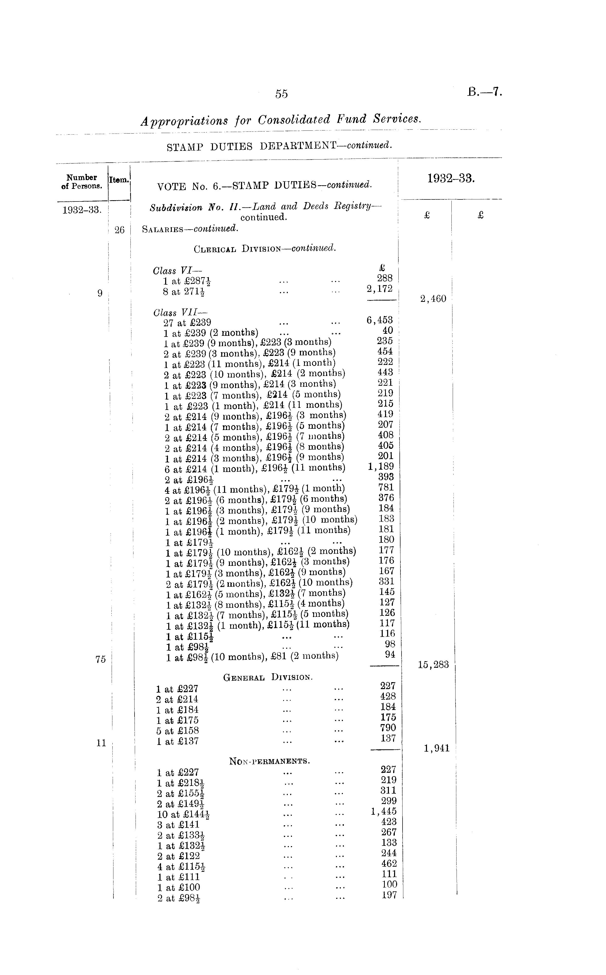 Number T tom 1982—33. of Persons. VOTE No. 6.—STAMP DUTIES —continued,. iQQQ—S 1 ! 1 Subdivision No. II. —Land and Deeds Registry continued. £ £ 26 Salabies —continued. Clerical Division —continued. Glass VI — £ 1 at £2871 ••• 288 »j S" 2 ' 11 2,460 Glass VII — 27 at £239 ... 6,453 1 at £239 (2 months) ... ... 40 1 at £239 (9 months), £223 (3 months) 235 2 at £239 (3 months), £223 (9 months) 454 1 at £223 (11 months), £214 (1 month) 222 2 at £223 (10 months), £214 (2 months) 443 1 at £223 (9 months), £214 (3 months) 221 1 at £223 (7 months), £214 (5 months) 219 1 at £223 (1 month), £214 (11 months) 215 2 at £214 (9 months), £196! (3 months) 419 1 at £214 (7 months), £196! (5 months) 207 2 at £214 (5 months), £196! (7 months) 408 2 at £214 (4 months), £196| (8 months) 405 1 at £214 (3 months), £196! (9 months) 201 6 at £214 (1 month), £196! (11 months) 1,189 2 at £196i ... ••• 393 4 at £196+ (11 months), £179! (1 month) 781 2 at £196+ (6 months), £179! (6 months) 376 1 at £1961 (3 months), £179! (9 months) 184 1 at £196! (2 months), £179! (10 months) 183 1 at £196! (1 month), £179! (11 months) 181 1 at £179i ••• ••• 180 1 at £179! (10 months), £1621 (2 months) 177 1 at £179+ (9 months), £162! (3 months) 176 1 at £179! (3 months), £162! (9 months) 167 2 at £179! (2 months), £162! (10 months) 331 1 at £162# (5 months), £132! (7 months) 145 1 at £1321 (8 months), £115! (4 months) 127 1 at £132! (7 months), £115! (5 months) 126 1 at £132| (1 month), £115! (11 months) 117 1 at £115! - - U Q l 1 at £98! • • ••• 98 75 1 at £98|- ( 10 months), £81 (2 months) 94 15,283 General Division. 1 at £227 ••• 227 2 at £214 ... ••• 428 1 at £184 ... 184 1 at £175 17 £ 5 at £158 ... ••• 790 " "> ,J!137 1,9« Non-permanents. 1 at £227 ... ••• 227 1 at £218! ••• - 219 2 at £1551 ... ••• 31 1 2 at £1491 ... ... 299 10 at £144! -• • • 3 at £141 ... ••• 423 2 at £133! ?67 1 at £i 3 2! ... - 133 2 at £122 ... 2W 4 at £115+ ••• ••• 462 1 at £111 ••• 111 1 at £100 ... ••• 100 2 at £98! • • 197