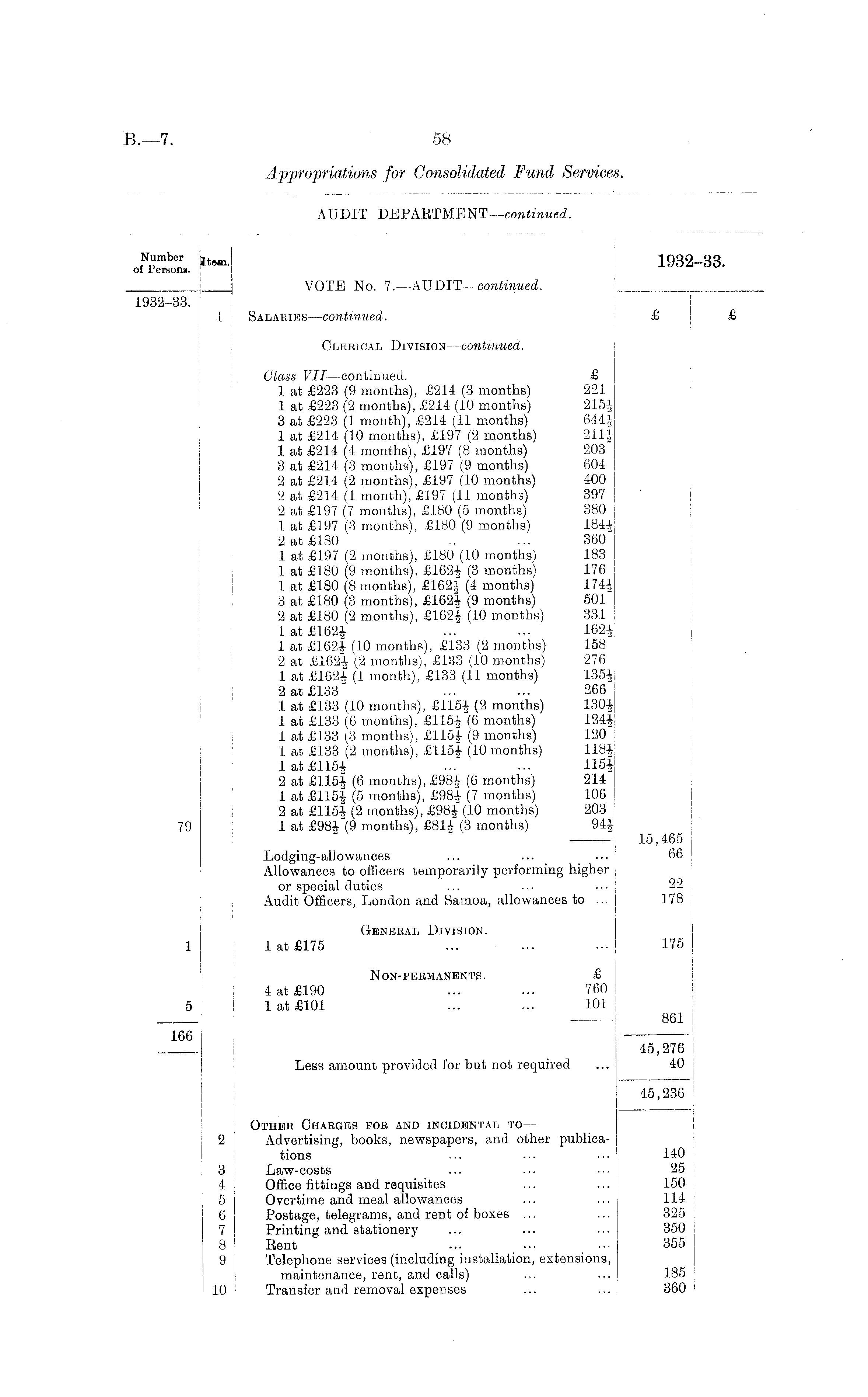JKSSi. H 1932 ~ 33 - j VOTE No. 7. —AUDIT —continued. 1932-33. I 1 Salaries—continued. £ j £ Clerical Division—continued. Glaus VII —continued. £ 1 at £223 (9 months), £214 (3 months) 221 1 at £223 (2 months), £214 (10 months) 215| 3 at £223 (1 month), £214 (11 months) 644| 1 at £214 (10 months), £197 (2 months) 211f 1 at £214 (4 months), £197 (8 months) 203 3 at £214 (3 months), £197 (9 months) 604 2 at £214 (2 months), £197 (10 months) 400 2 at £214 (1 month), £197 (11 months) 397 2 at £197 (7 months), £180 (5 months) 380 1 at £197 (3 months), £180 (9 months) 184-J 2 at £180 .. ... 360 1 at £197 (2 months), £180 (10 months) 183 1 at £180 (9 months), £162f (3 months) 176 1 at £180 (8 months), £162-§ (4 months) 174-J 3 at £180 (3 months), £162J (9 months) 501 2 at £180 (2 months), £162| (10 months) 331 lat£162£ ..." ... 162i 1 at £1624 (10 months), £133 (2 months) 158 2 at £162f (2 months), £133 (10 months) 276 1 at £1621 (1 month), £133 (11 months) 135| 2 at £133" ... ... 266 1 at £133 (10 months), £115£ (2 months) 130£ 1 at £133 (6 months), £115£ (6 months) 124| 1 at £133 (3 months), £115| (9 months) 120 1 at £133 (2 months), £115J (10 months) 118^ 1 at £1151 ..." ... H5J 2 at £115| (6 months), £98J (6 months) 214 1 at £115|- (5 months), £98| (7 months) 106 2 at £115f (2 months), £98J (10 months) 203 79 1 at £984- (9 months), £814 (3 months) 94J 15,465 Lodging-allowances ... ... ... 66 Allowances to officers temporarily performing higher or special duties ... ... ••• 22 Audit Officers, London and Samoa, allowances to ... 178 General Division. 1 1 at £175 ... ... 175 Non-pekmanents. £ 4 at £190 ... ... 760 5 ! 1 at £101 ... ... 101 861 166 i 45,276 Less amount provided for but not required ... 40 45,236 Other Charges for and incidental to — 2 Advertising, books, newspapers, and other publications ... ... 140 3 Law-costs ... 25 4 Office fittings and requisites ... ... 150 5 Overtime and meal allowances ... ... 114 6 Postage, telegrams, and rent of boxes ... ... 325 7 Printing and stationery ... ... ... 350 8 Bent ... ... 355 9 Telephone services (including installation, extensions, ; maintenance, rent, and calls) ... ... 185 10 : Transfer and removal expenses ... .... 360