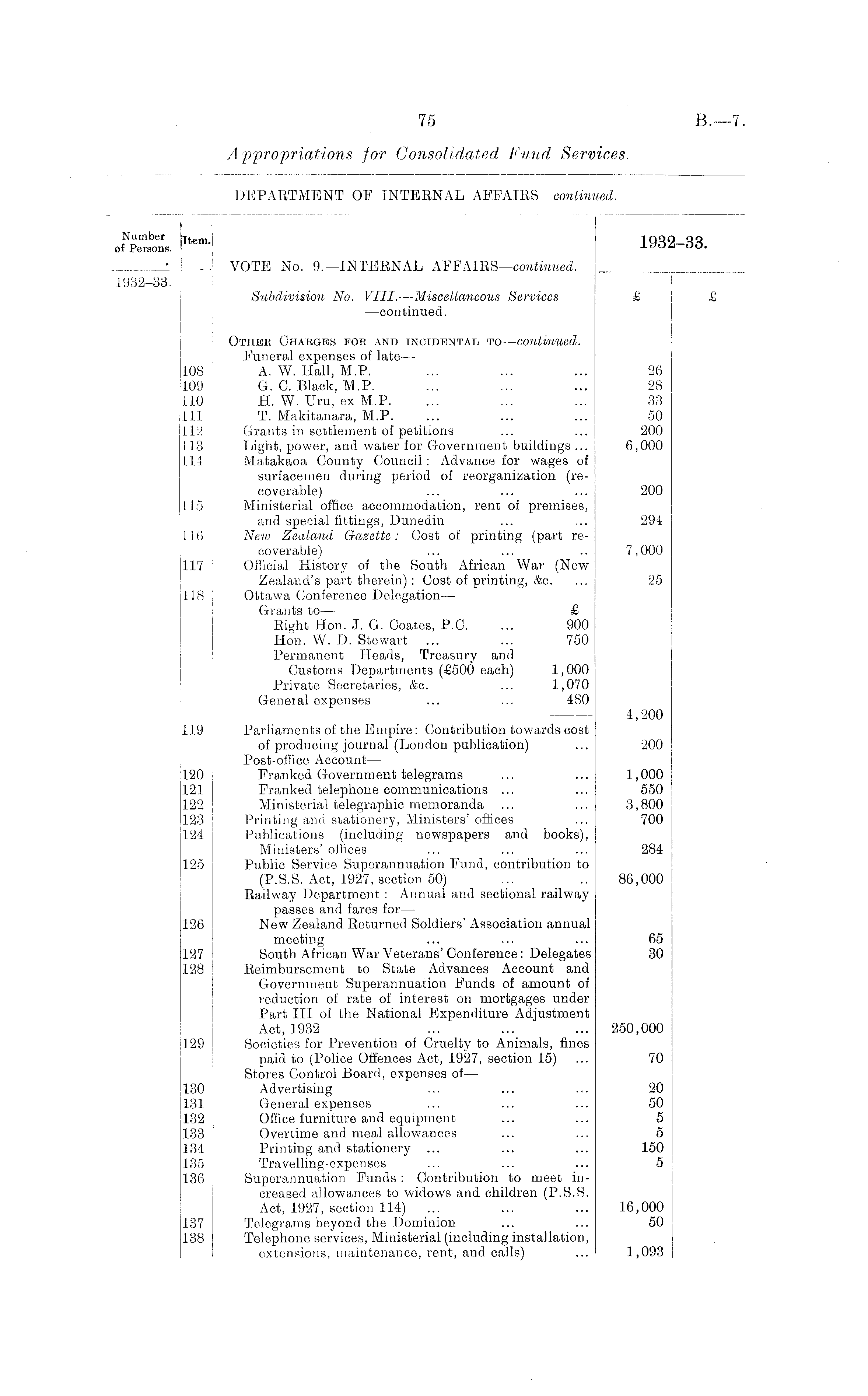 ofs 1 ™ "">'j 1932-33. ' J VOTE No. 9,—INTERNAL AFFAIRS—continued. 1932-33. j Subdivision No. VIII.—Miscellaneous Services £ £ —continued. Othek Chakges fob and incidental to —continued. Funeral expenses of late— 108 A. W. Hall, M.P. ... ... ... 26 109 G. C. Black, M.P. ... ... ... 28 110 H. W. TJru, ex M.P. ... ... ... 33 111 T. Makitanara, M.P. ... ... ... 50 112 ' Grants in settlement of petitions ... ... 200 113 Light, power, and water for Government buildings ... 6,000 114 Matakaoa County Council: Advance for wages of surfacemen during period of reorganization (recoverable) ... ... ... 200 115 Ministerial office accommodation, rent of premises, and special fittings, Dunedin ... ... 294 116 New Zealand Gazette: Cost of printing (part recoverable) ... ... .. 7,000 117 Official History of the South African War (New Zealand's part therein): Cost of printing, &c. ... 25 118 Ottawa Conference Delegation— Grants to — £ Right Hon. J. G. Coates, P.C. ... 900 Hon. W. D. Stewart ... ... 750 Permanent Heads, Treasury and Customs Departments (£500 each) 1,000 Private Secretaries, &c. ... 1,070 General expenses ... ... 480 — 4,200 119 Parliaments of the Empire: Contribution towards cost of producing journal (London publication) ... 200 Post-office Account — 120 Franked Government telegrams ... ... 1,000 121 Franked telephone communications ... ... 550 122 Ministerial telegraphic memoranda ... ... 3,800 123 Printing and stationery, Ministers' offices ... 700 124 Publications (including newspapers and books), Ministers' offices ... ... ... 284 125 Public Service Superannuation Fund, contribution to (P.S.S. Act, 1927, section 50) ... .. 86,000 Railway Department : Annual and sectional railway passes and fares for— 126 New Zealand Returned Soldiers' Association annual meeting ... ... ... 65 127 South African War Veterans'Conference: Delegates 30 128 Reimbursement to State Advances Account and Government Superannuation Funds of amount of reduction of rate of interest on mortgages under Part III of the National Expenditure Adjustment Act, 1932 ... ..._ ... 250,000 129 Societies for Prevention of Cruelty to Animals, fines paid to (Police Offences Act, 1927, section 15) ... 70 Stores Control Board, expenses of— 130 Advertising ... ... ... 20 131 General expenses ... ... ... 50 132 Office furniture and equipment ... ... 5 133 Overtime and meal allowances ... ... 5 134 Printing and stationery ... ... ... 150 135 Travelling-expenses ... ... ... 5 136 Superannuation Funds : Contribution to meet increased allowances to widows and children (P.S.S. Act, 1927, section 114) ... ... ... 16,000 137 Telegrams beyond the Dominion ... ... 50 138 Telephone services, Ministerial (including installation, extensions, maintenance, rent, and calls) ... 1,093