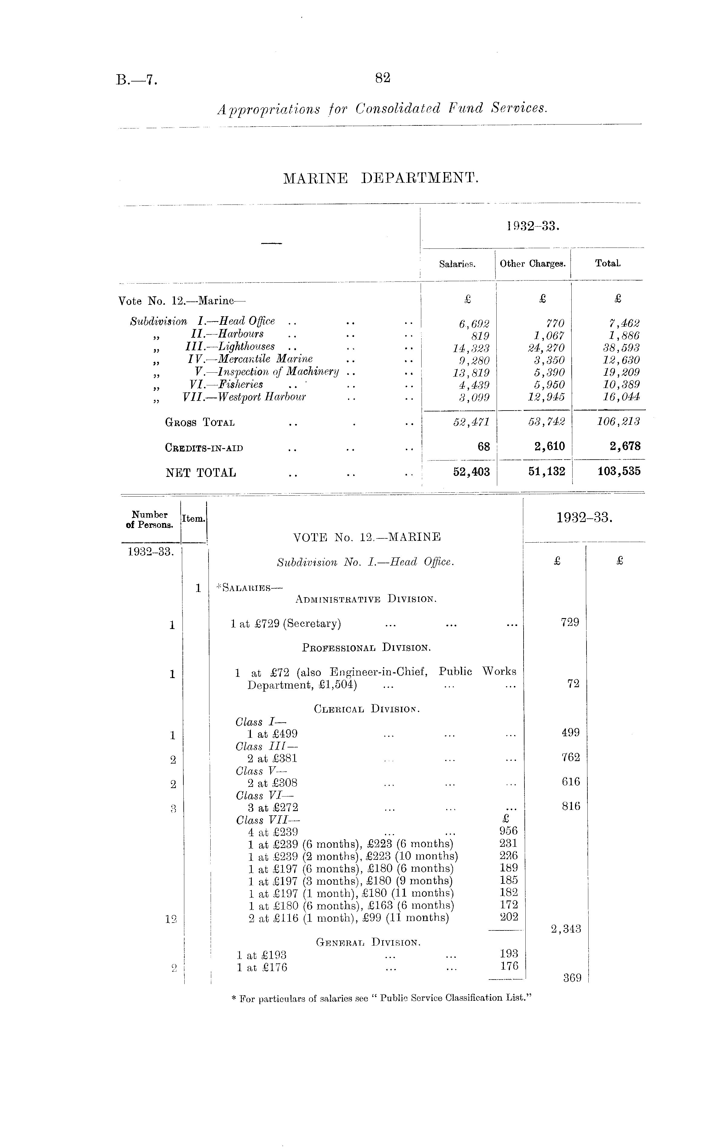 1932-33. Salaries. Other Charges. Total. Vote No. 12. —Marine — £ £ £ Subdivision I. —Head Office .. .. .. 6, 692 770 7,462 II —Harbours .. .. .. '$19 1,067 1,886 111.—Lighthouses .. .. .. 14,323 24,270 38,593 „ IV.-—Mercantile Marine .. .. 9,280 3,350 12,630 „ V. —Inspection of Machinery .. .. 13,819 5,390 19,209 „ VI. —Fisheries .. ' .. .. 4,439 5,950 10,389 „ VII. —Westport Harbour .. .. 3,099 12,945 16,044 GROSS Total .. . .. 52,471 53,742 1 06,213 Credits-in-AID .. .. .. 68 2,610 2,678 NET TOTAL .. .. .. 52,403 51,132 103,535 Number Item . 1932-33. of Persons. VOTE No. 12. —MAEINE 1932-33. Subdivision No. I. —Head Office. £ £ 1 * Salaries — Administrative Division. 1 1 at £729 (Secretary) ... ... ... 729 Professional Division. 1 1 at £72 (also Engineer-in-Chief, Public Works Department, £1,504) ... ... ... 72 Clerical Division. Class I— 1 1 at £499 ... ... ... 499 Class III— 2 2 at £381 ... ... 762 Class V— 2 2 at £308 ... ... ... 616 Class VI— 3 3 at £272 ... ... ... 816 Class VII— £ 4 at £239 ... ... 956 1 at £239 (6 months), £223 (6 months) 231 1 at £239 (2 months), £223 (10 months) 226 1 at £197 (6 months), £180 (6 months) 189 1 at £197 (3 months), £180 (9 months) 185 1 at £197 (1 month), £180 (11 months) 182 1 at £180 (6 months), £163 (6 months) 172 12 2 at £116 (1 month), £99 (11 months) 202 2,343 General Division. 1 at £193 ... ... 193 2 I 1 at £176 ... ... 176 369 * For particulars of salaries see " Public Service Classification List."